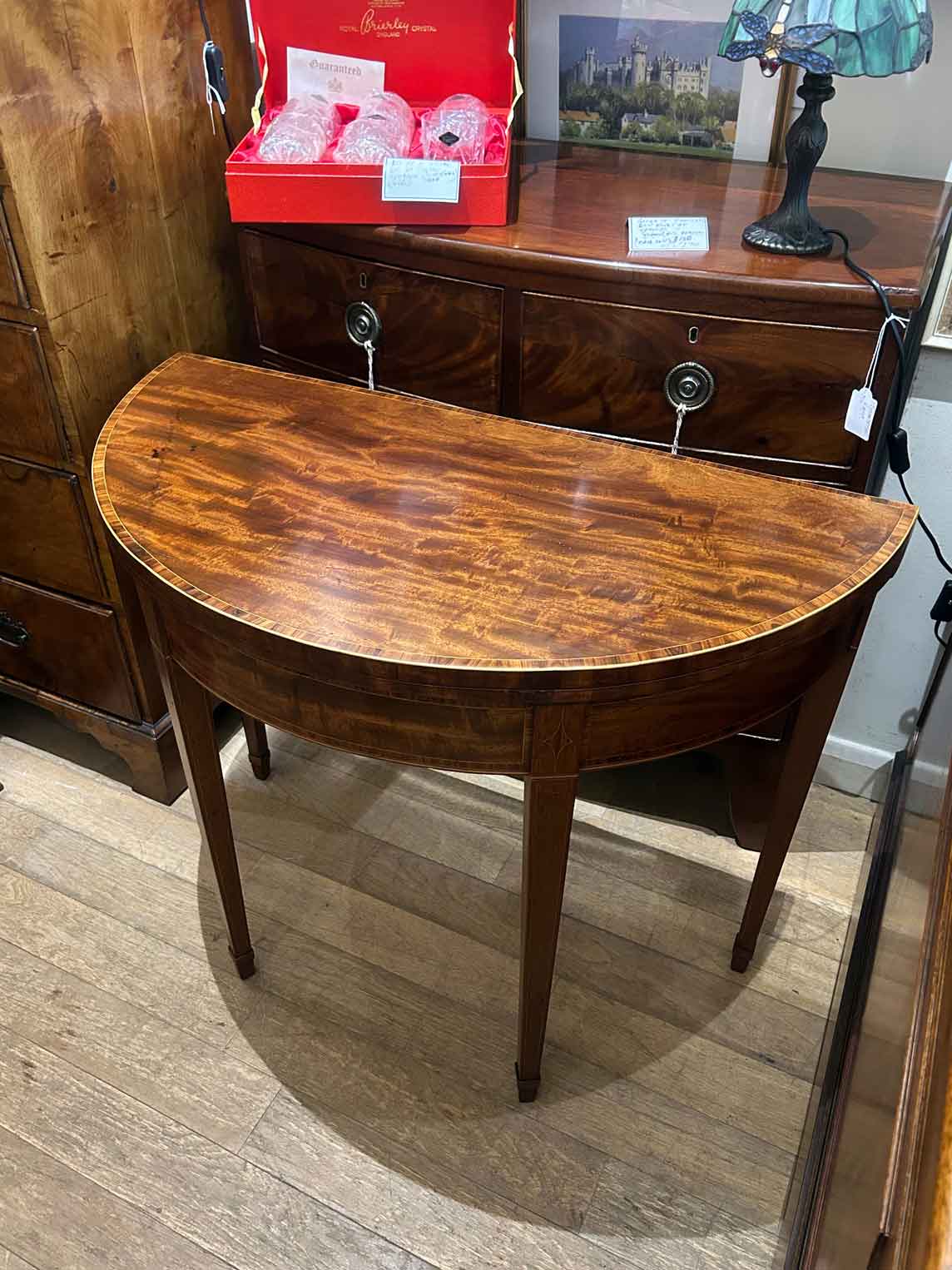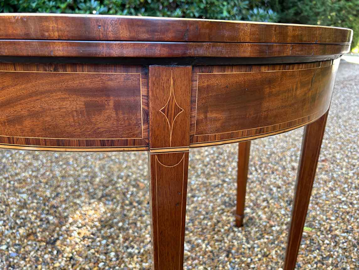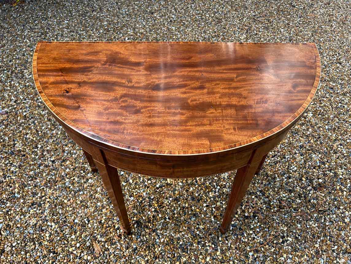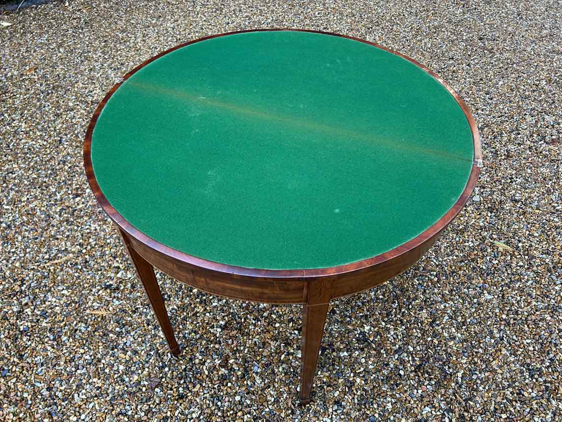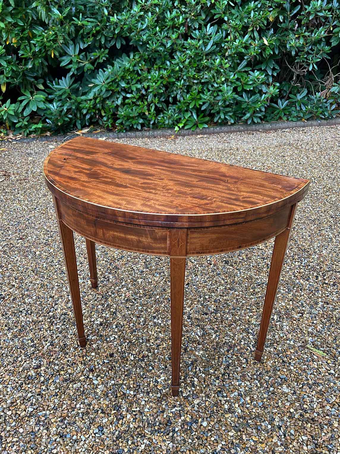 19th Century George III Mahogany Inlaid Demi Lune Card Table with a folding top lined with a green baize, crossbanded and line inlaid decoration on square tapering legs with spade feet.