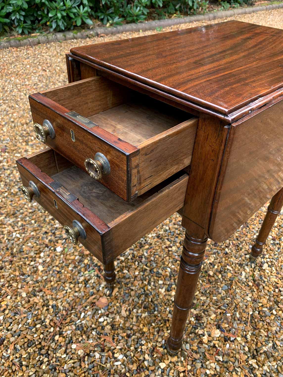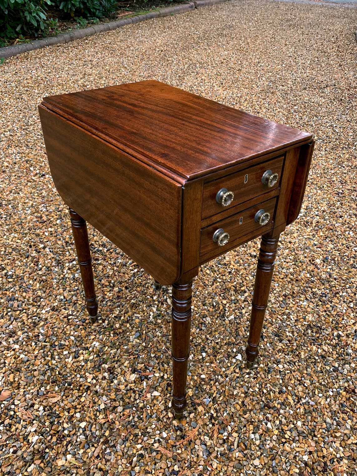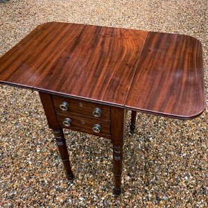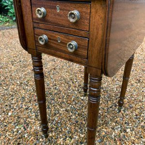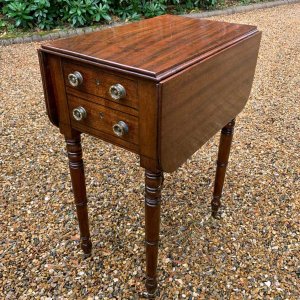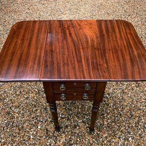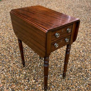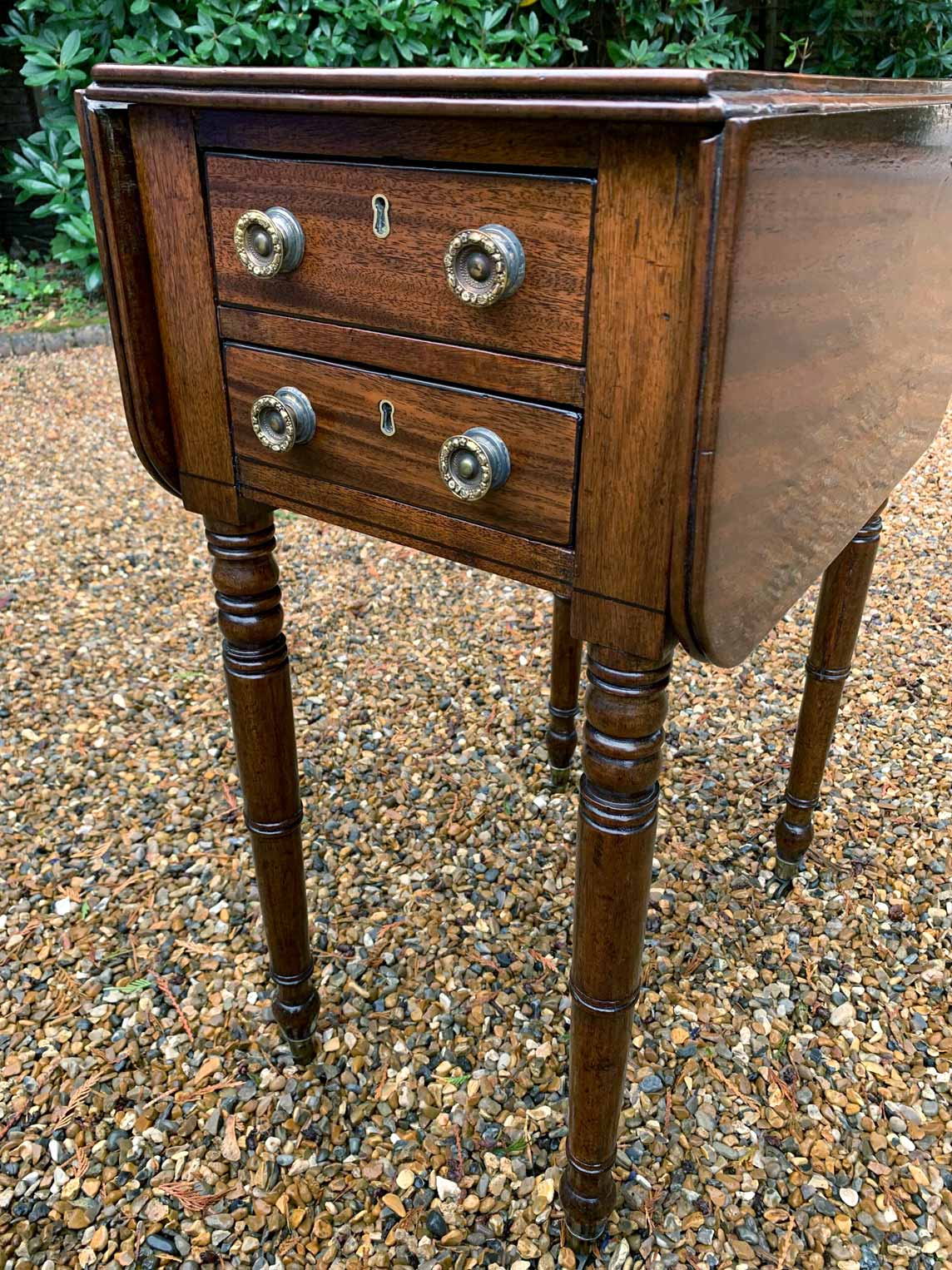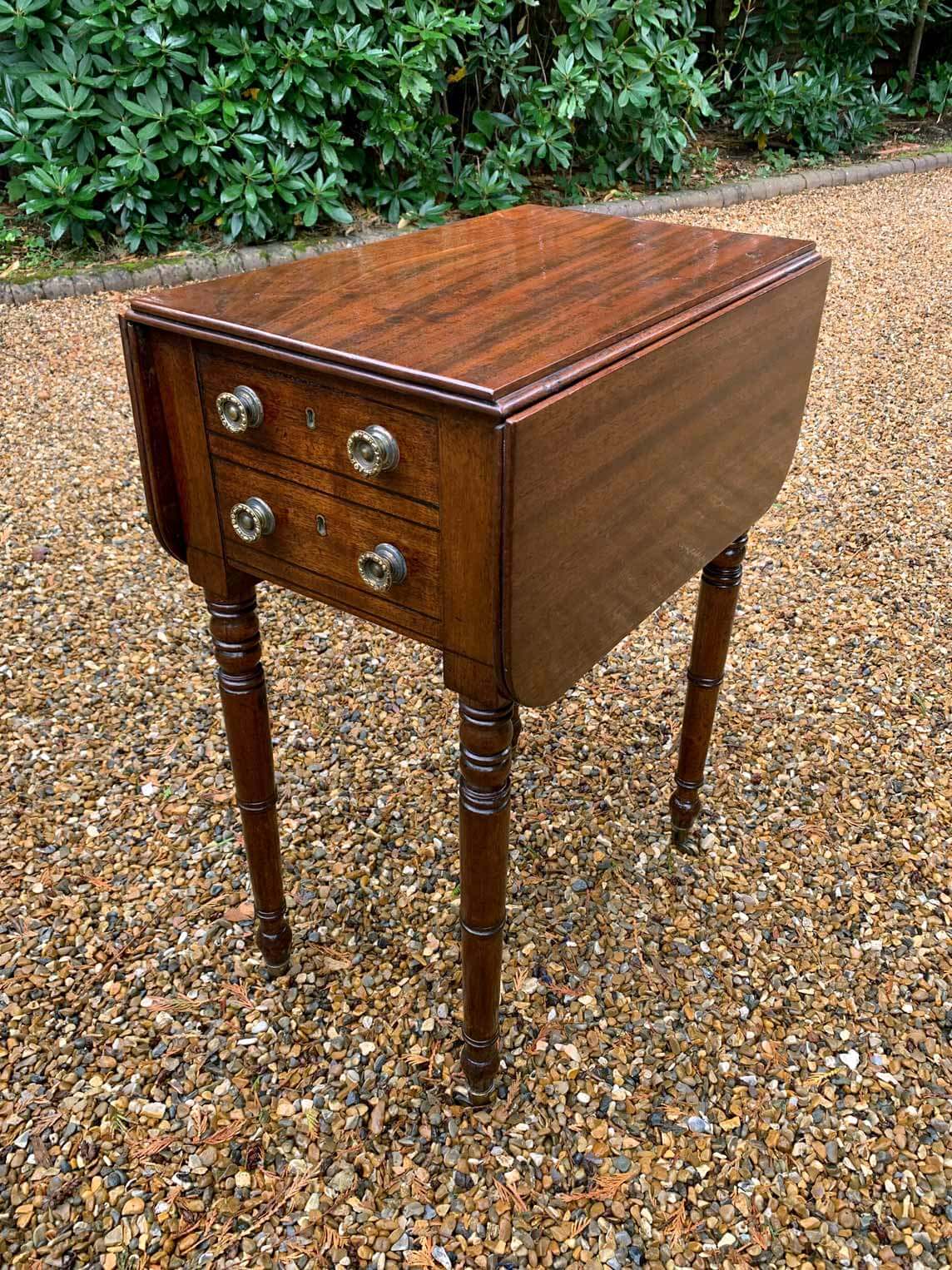A small 19th Century Georgian Mahogany Drop Leaf Work Table, fitted with two oak lined drawers, brass handles, raised on turned legs and brass castors.