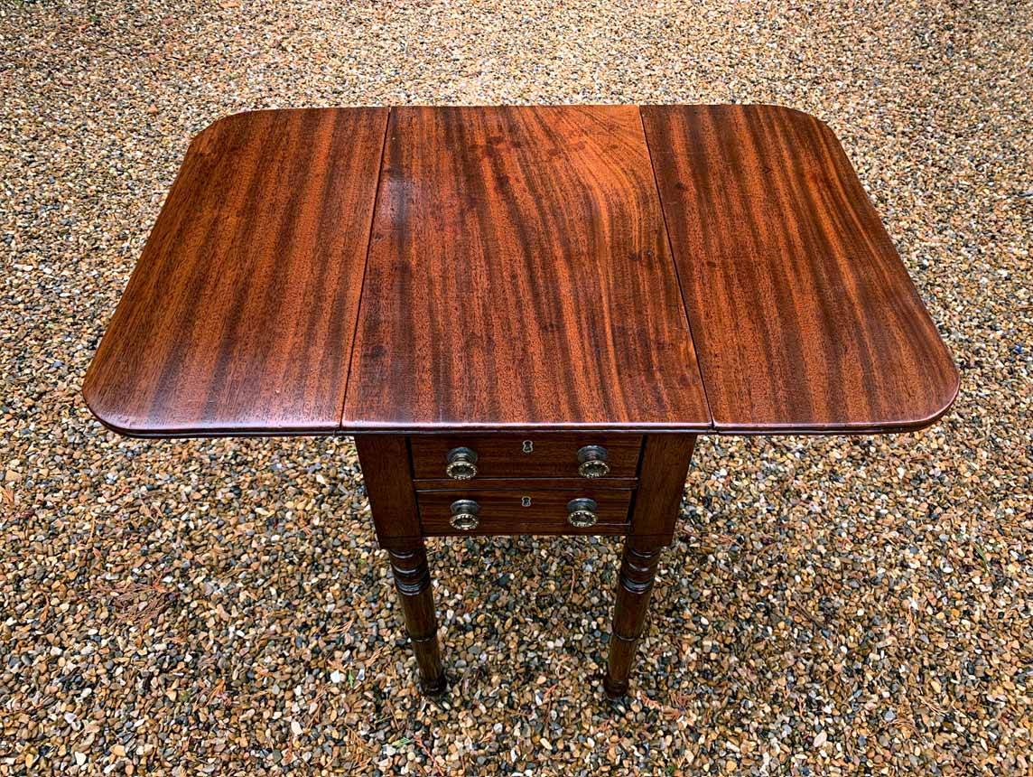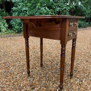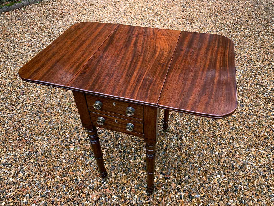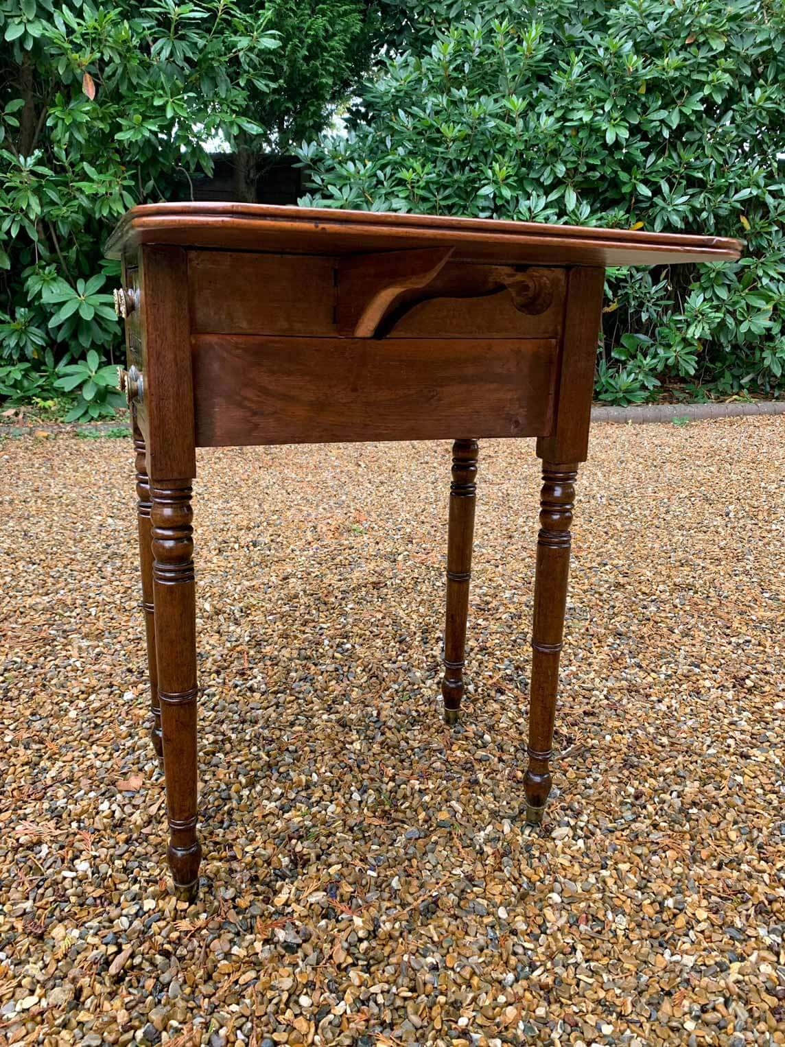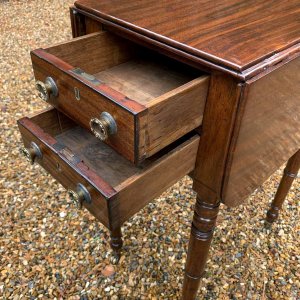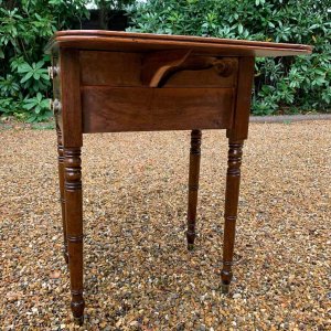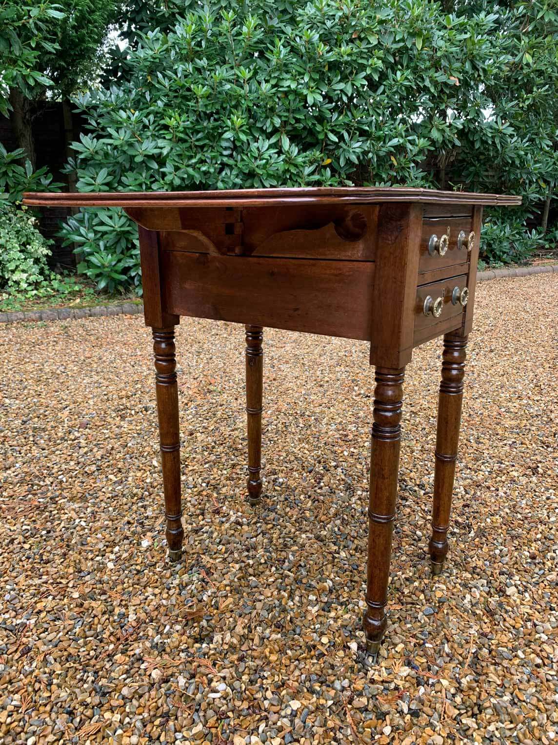 A small 19th Century Georgian Mahogany Drop Leaf Work Table, fitted with two oak lined drawers, brass handles, raised on turned legs and brass castors.