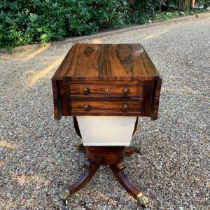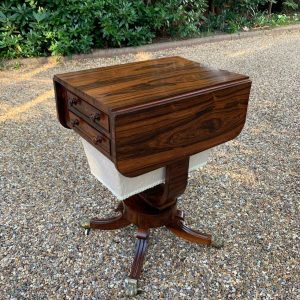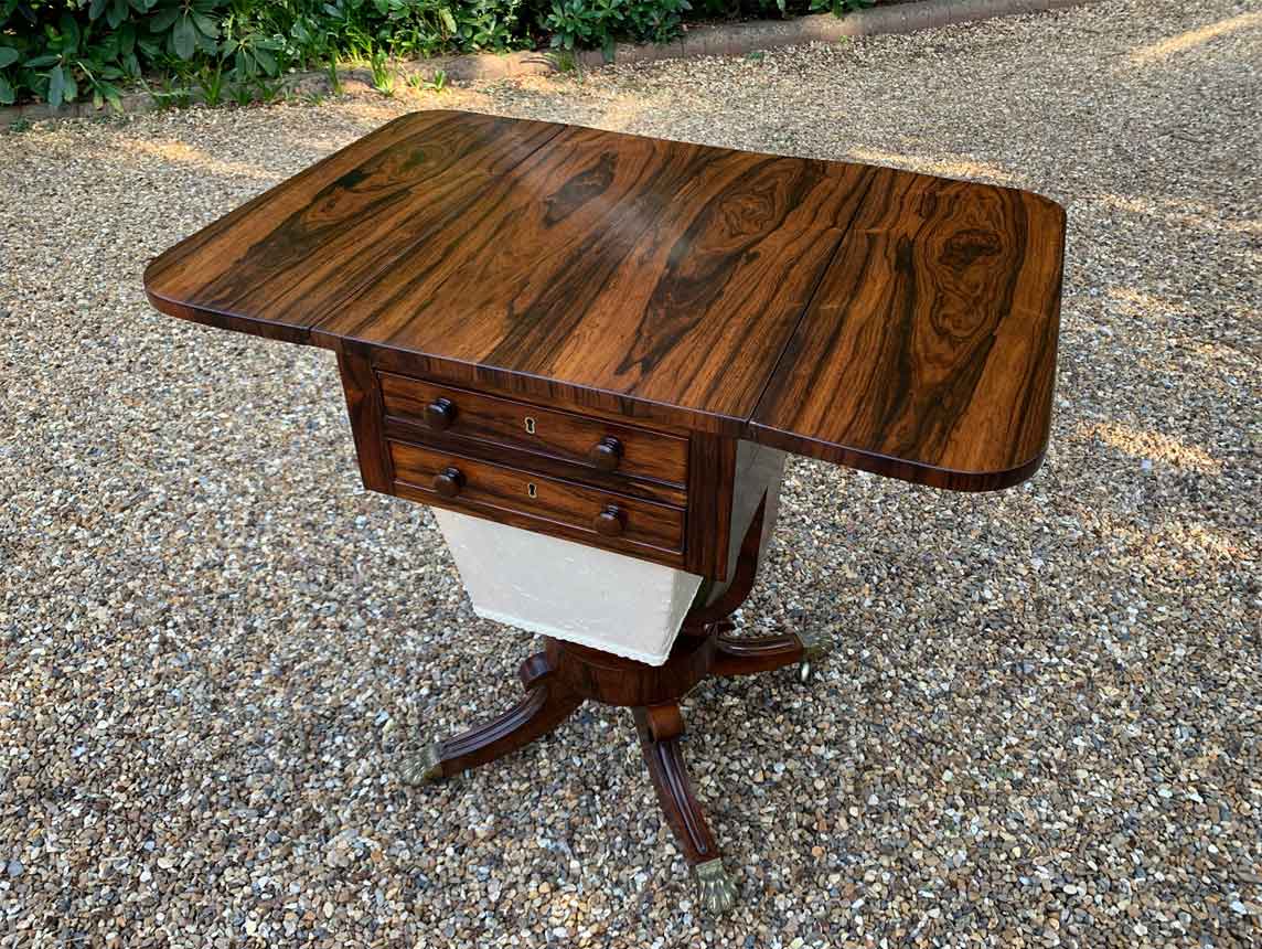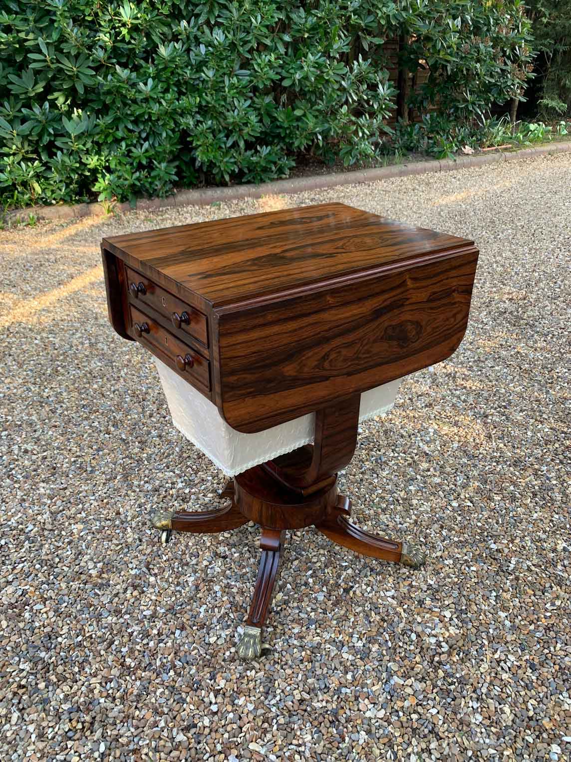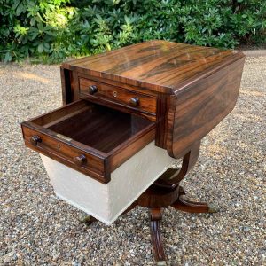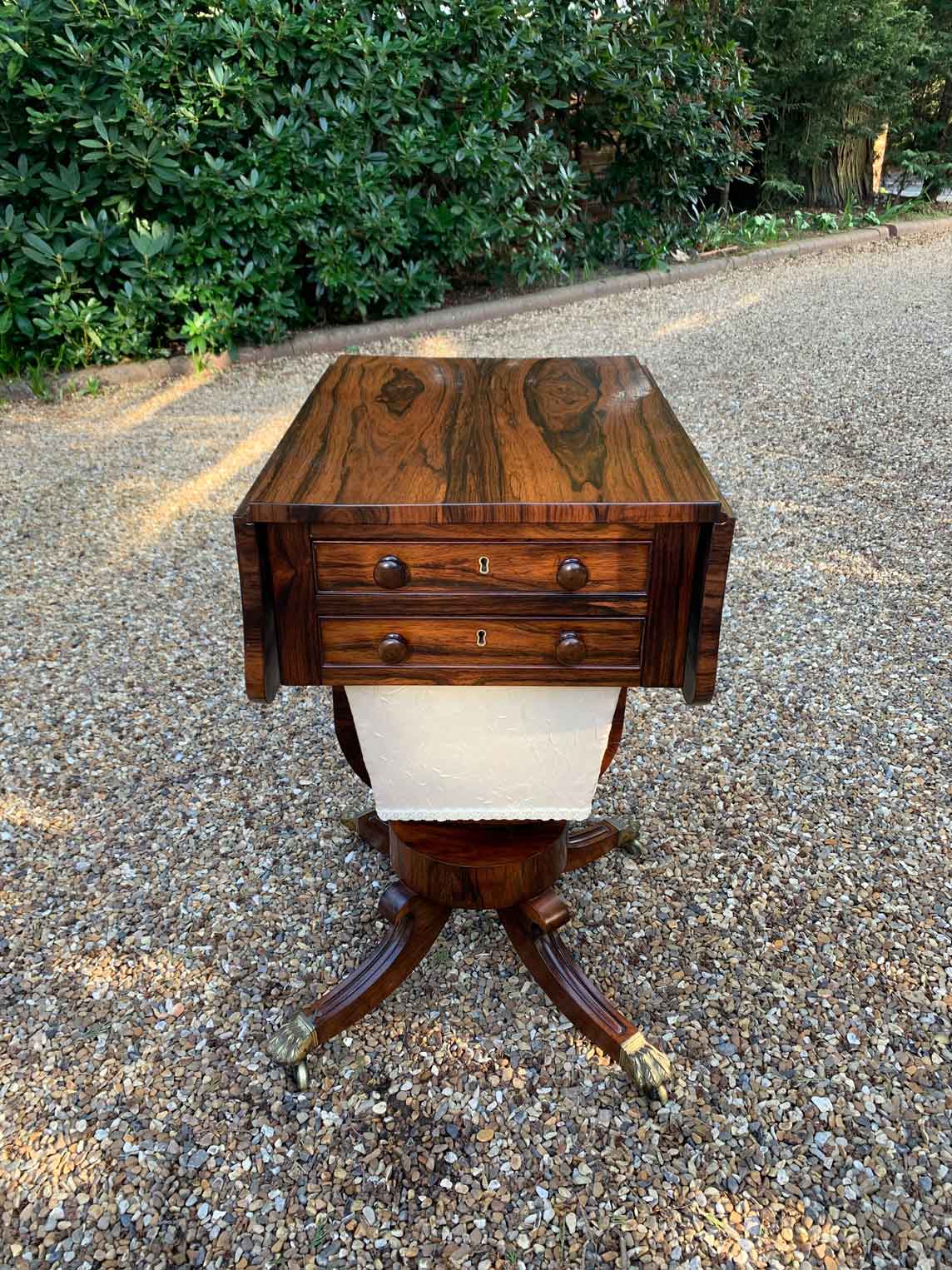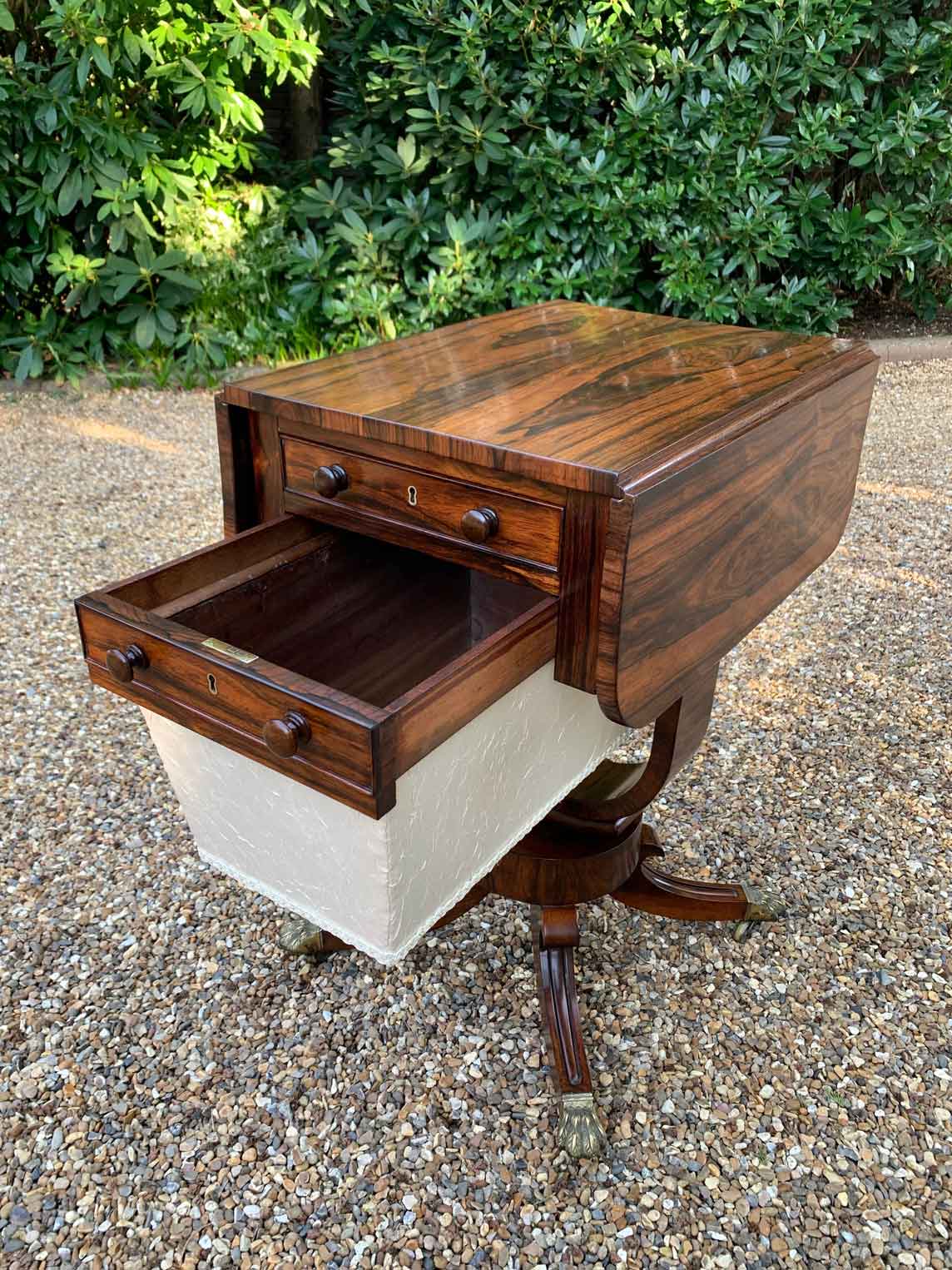 A Regency Rosewood Drop Leaf Work Table, fitted with a drawer and well, on a platform base