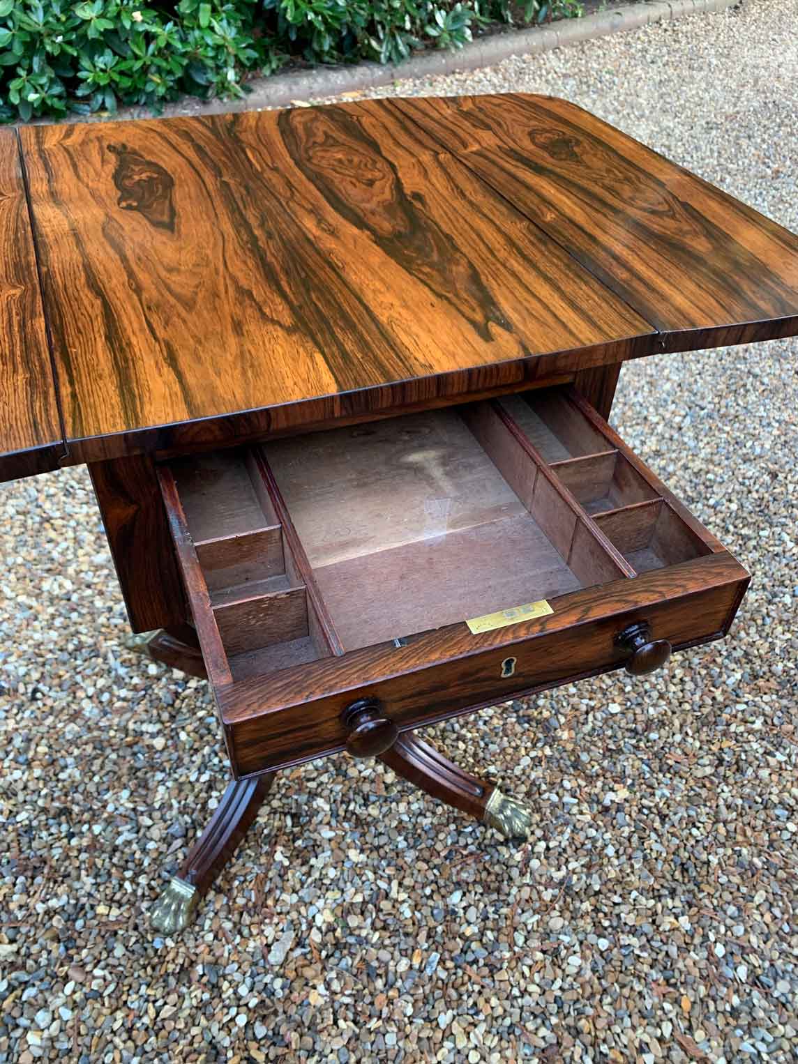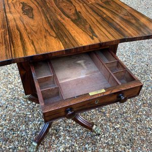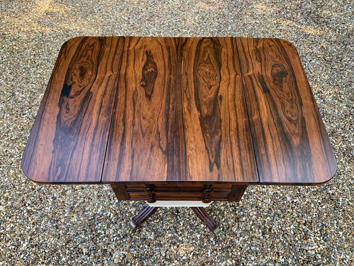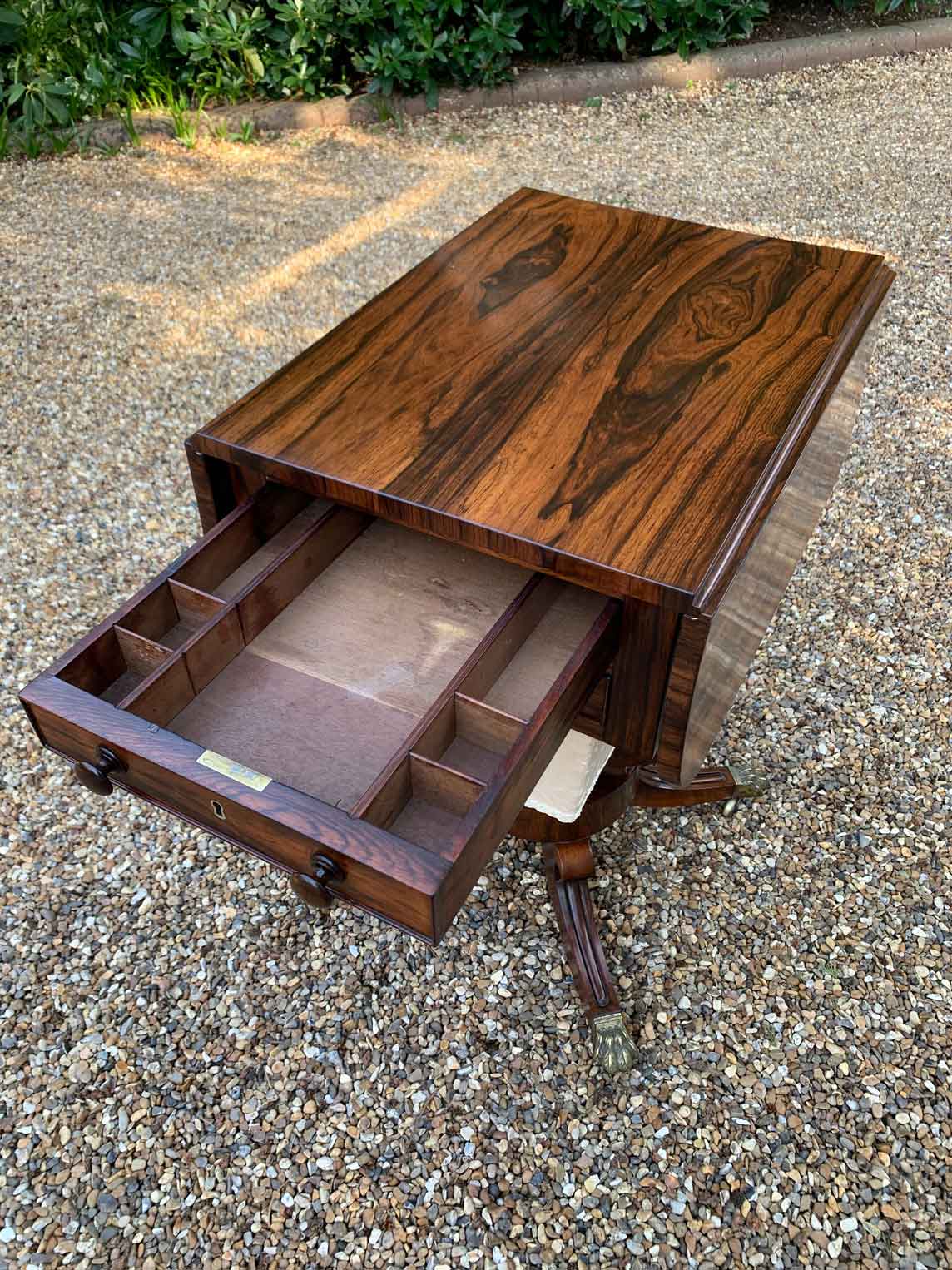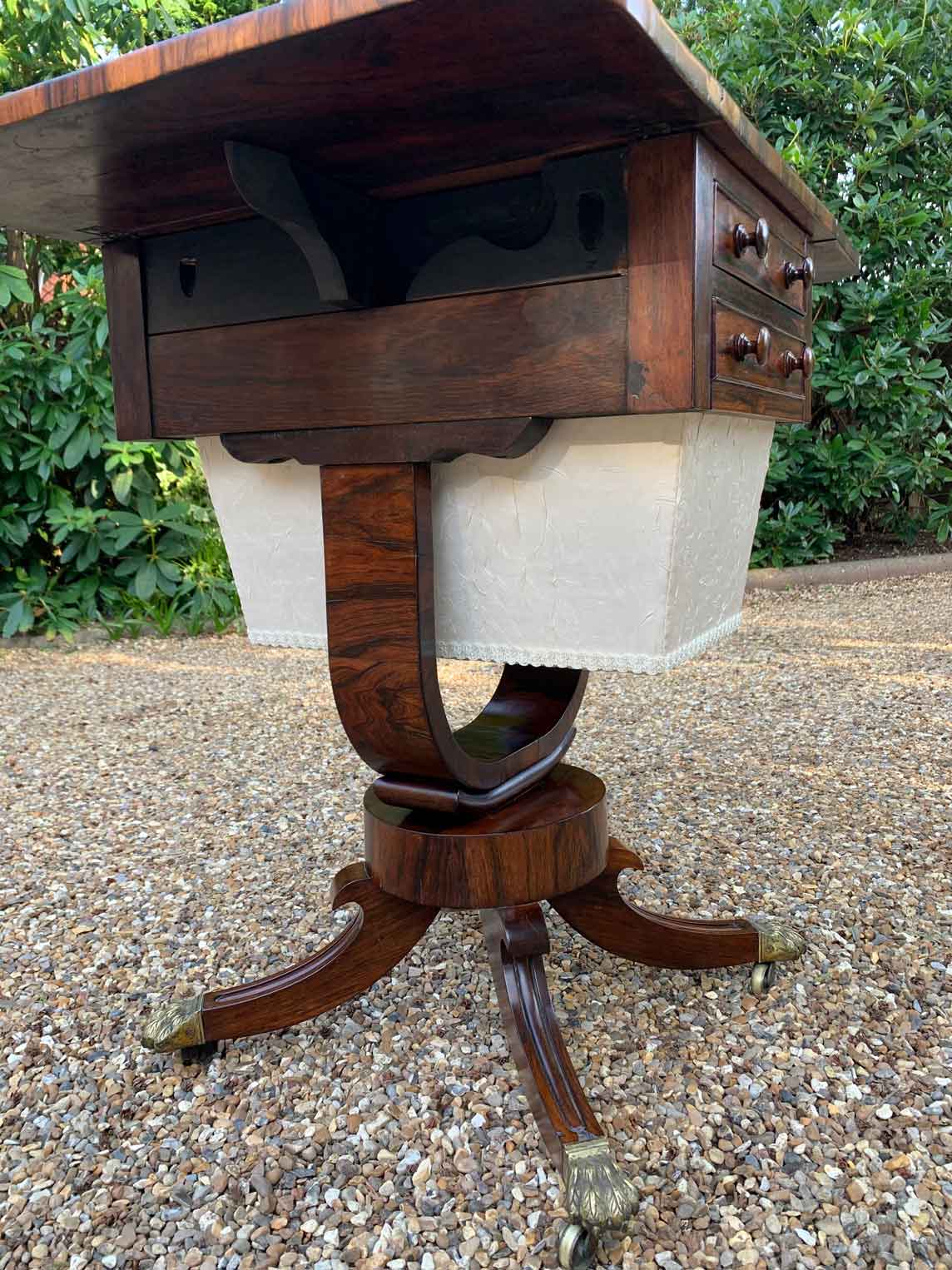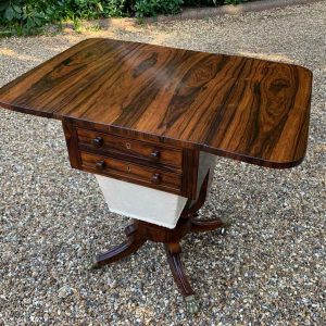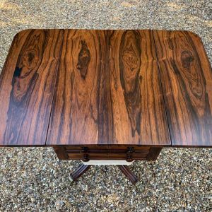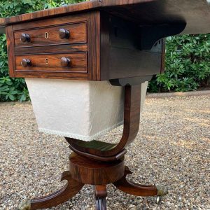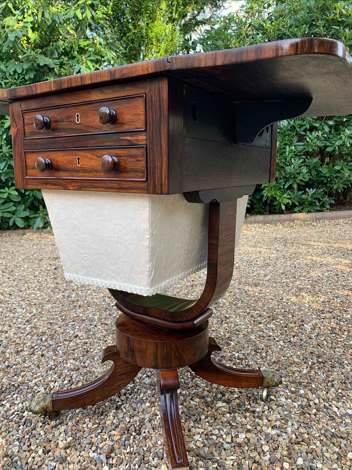 A Regency Rosewood Drop Leaf Work Table, fitted with a drawer and well, on a platform base