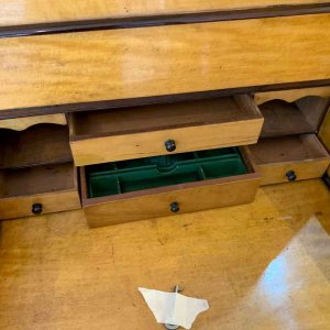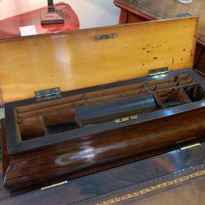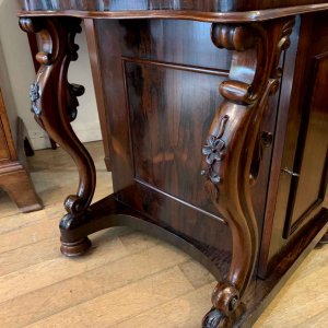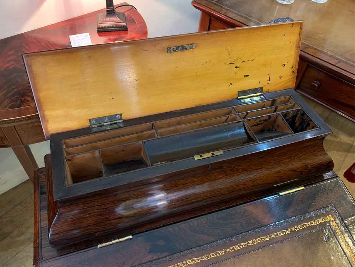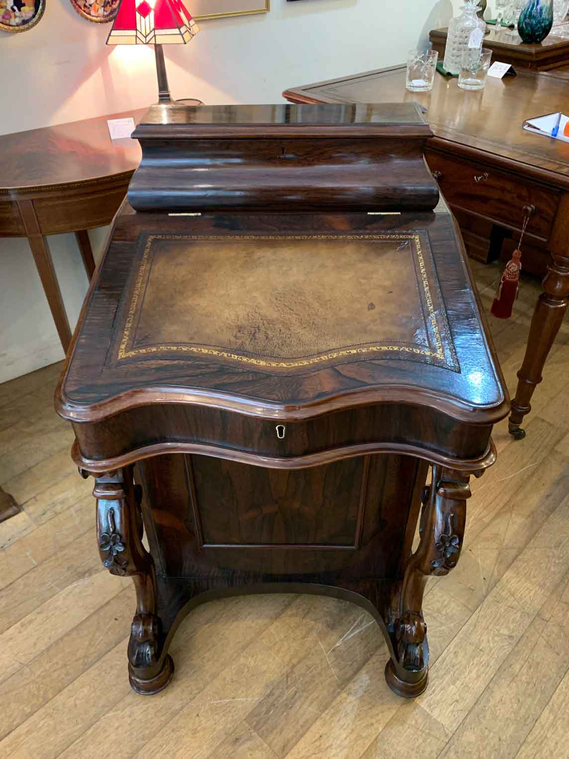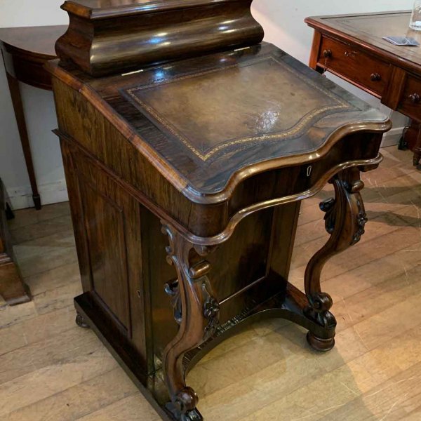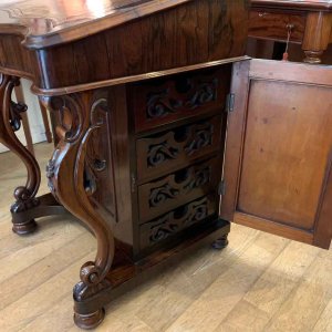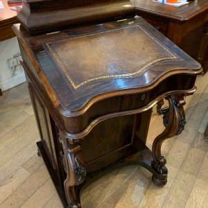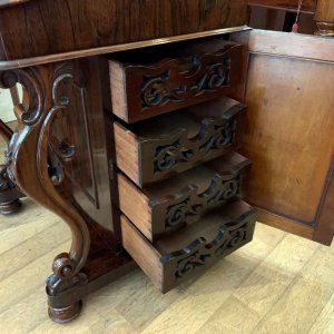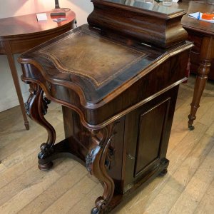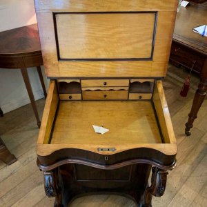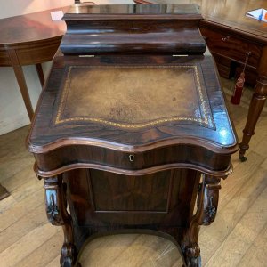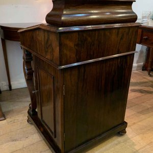 19th Century William IV Rosewood Davenport with a sloping leather writing surface and ink / pen compartment above. A satinwood interior inside with four drawers and bun handles / two pigeon holes.
