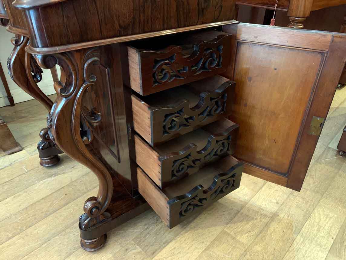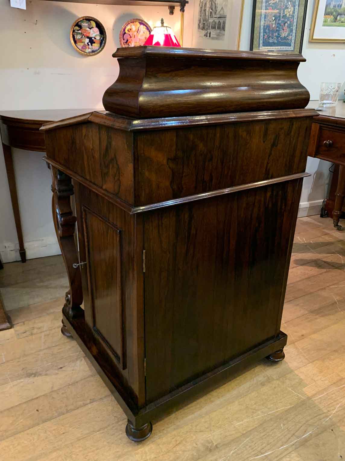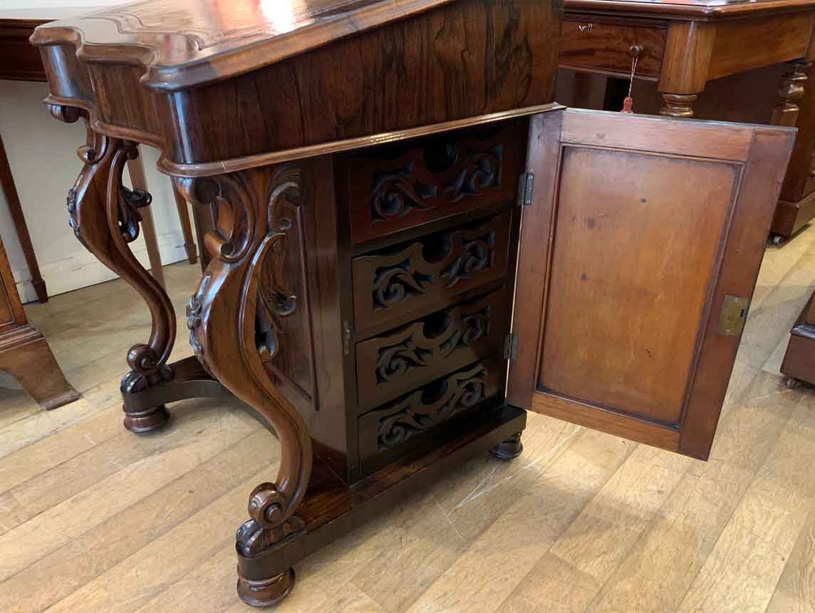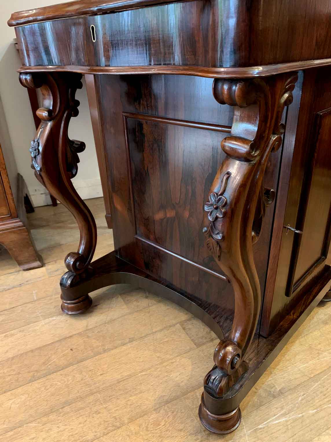 Below the writing surface has two carved cabriole supports and a side cupboard with working key enclosing four pierced fretwork drawers. The desk stands on a plinth with turned feet and brass castors.