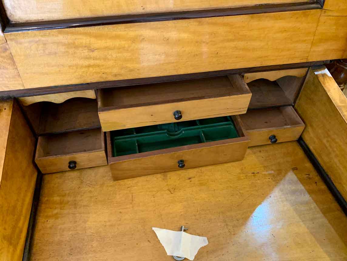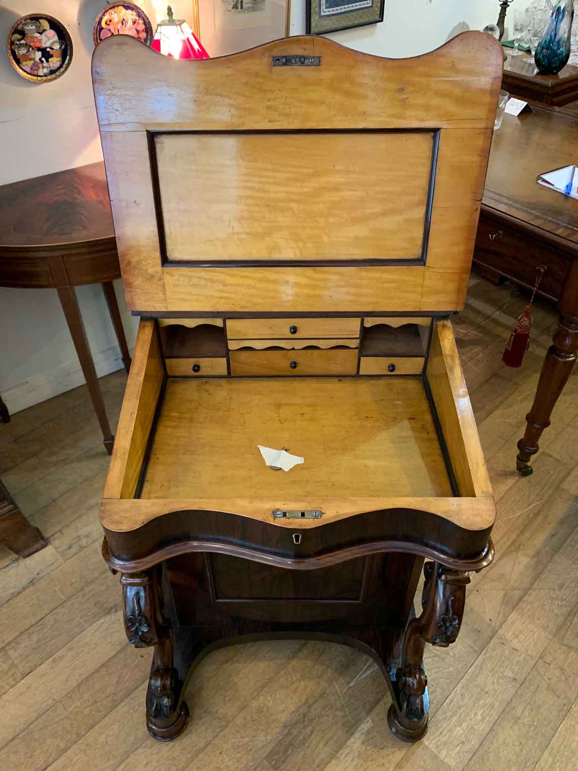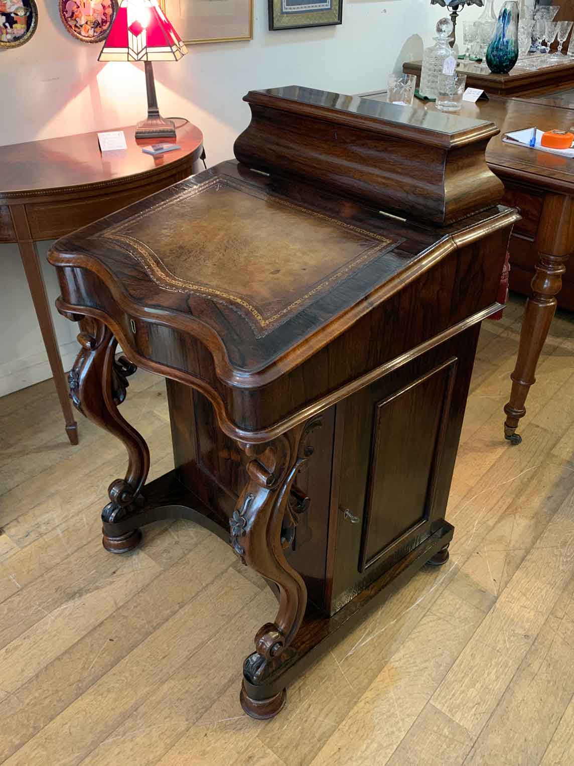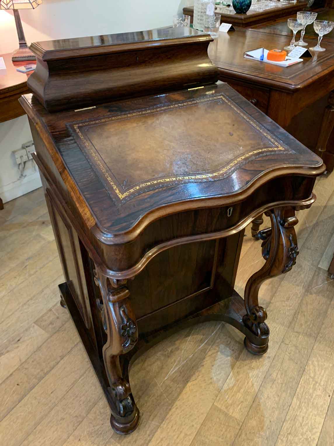 Below the writing surface has two carved cabriole supports and a side cupboard with working key enclosing four pierced fretwork drawers. The desk stands on a plinth with turned feet and brass castors.