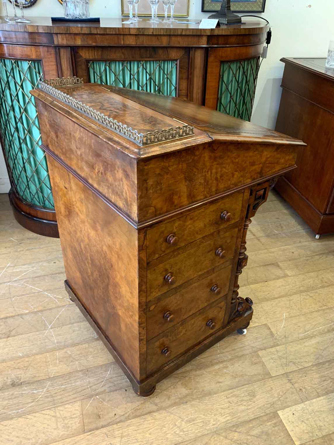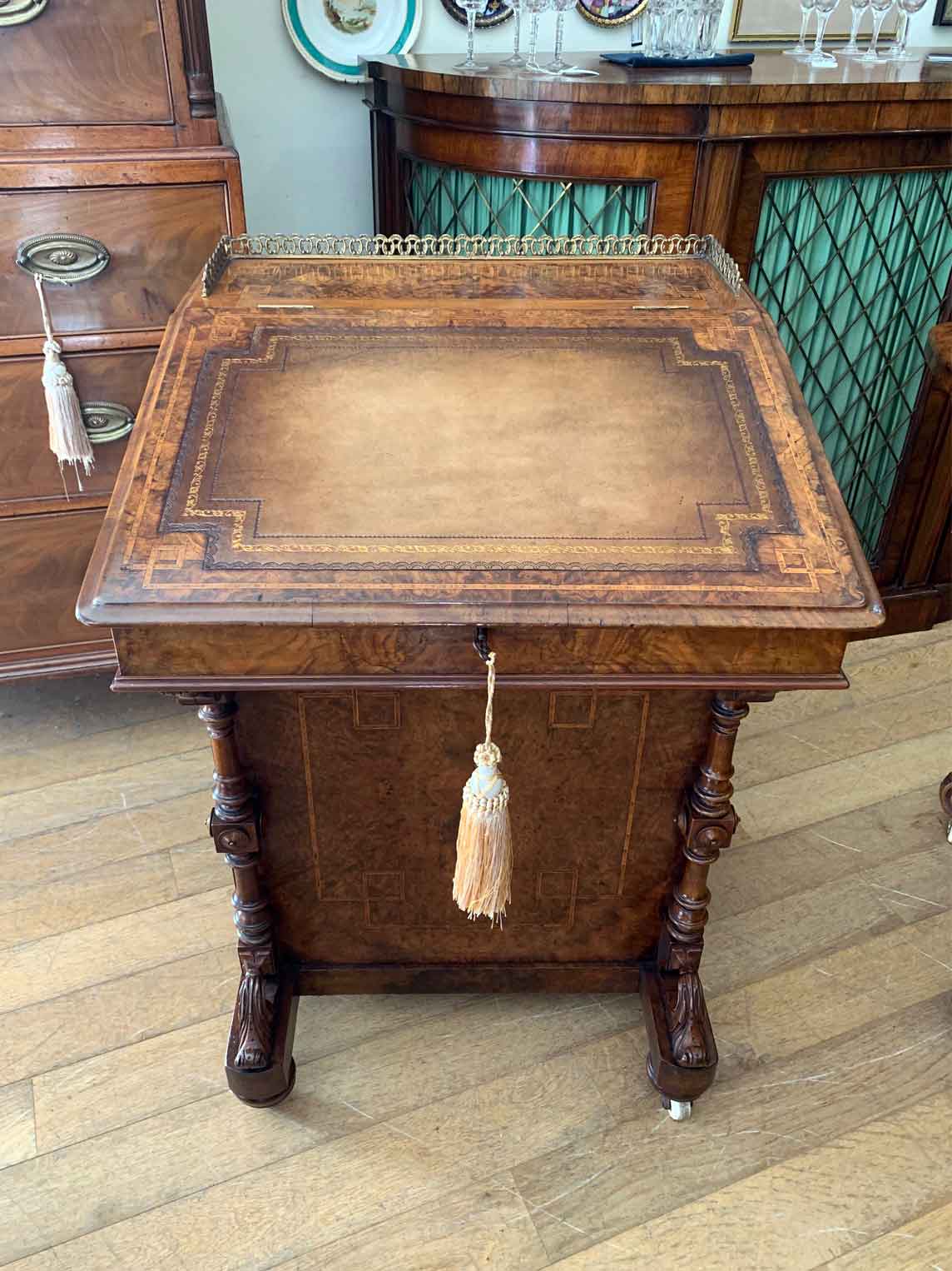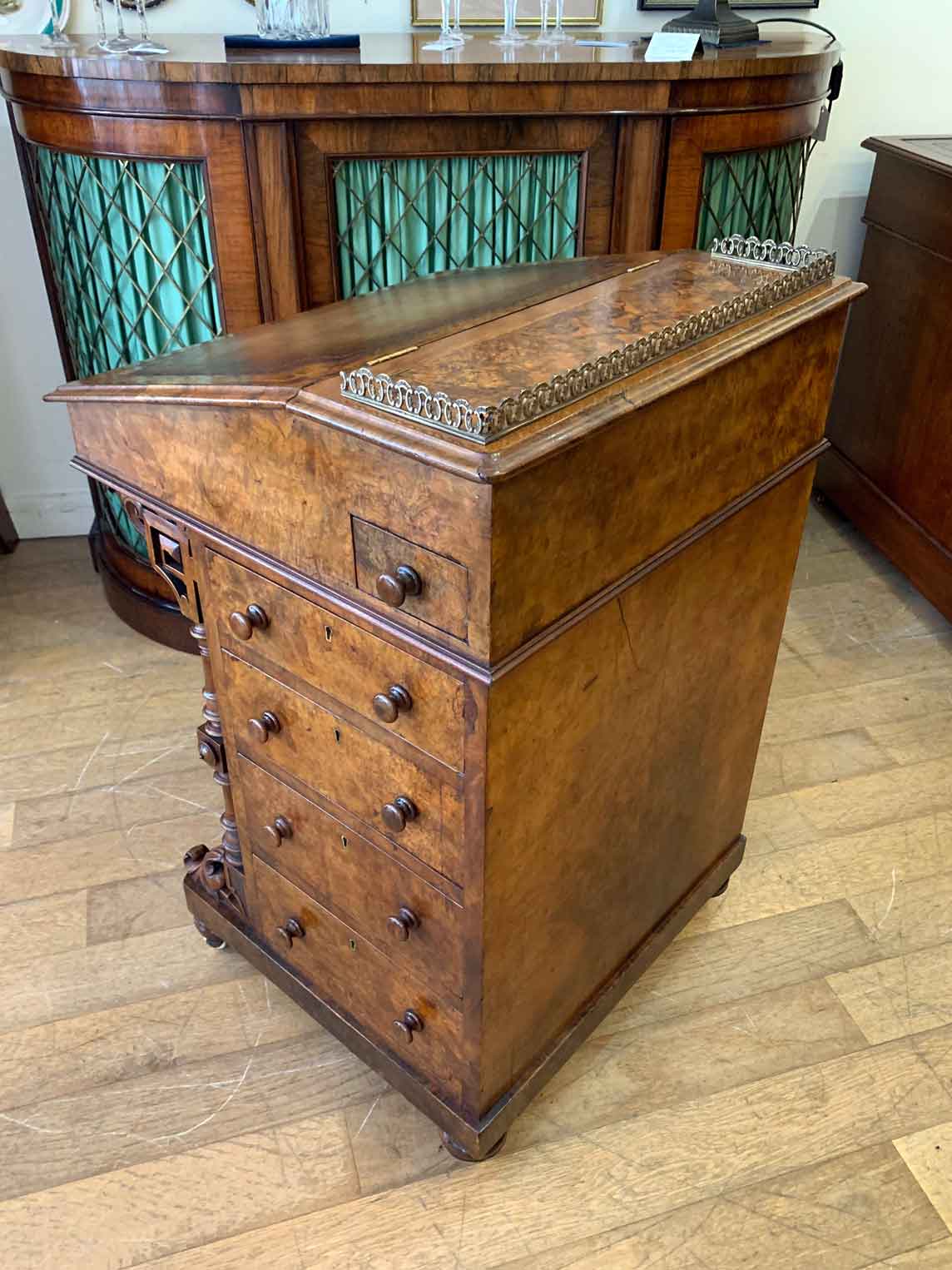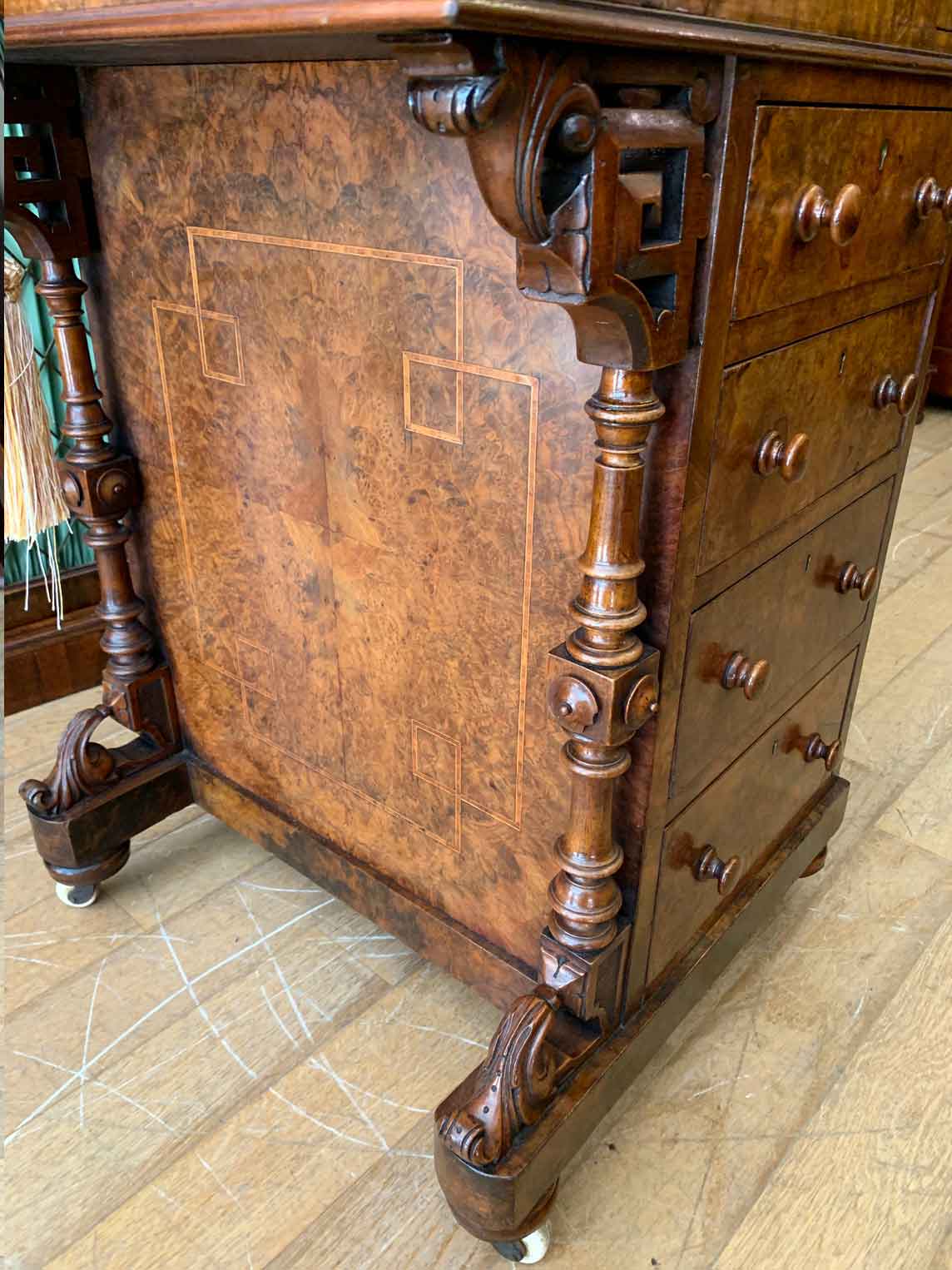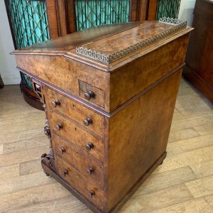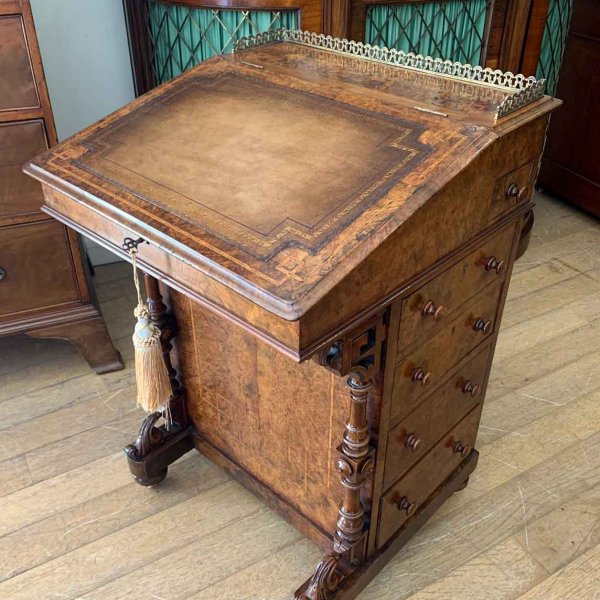 19th Century Victorian Burr Walnut Inlaid Davenport on a sloping green leather writing surface with solid brass rail on the top. A satinwood interior inside with two drawers and bun handles. Below on the right hand side of the desk has an small pull out drawer with ink well and pen holder, below has four fitted mahogany lined drawers. The left hand side there are four dummy drawers. All with turned wooden bun handles on both sides. The desk stands on turned column supports, a plinth with carved bun feet and castors.