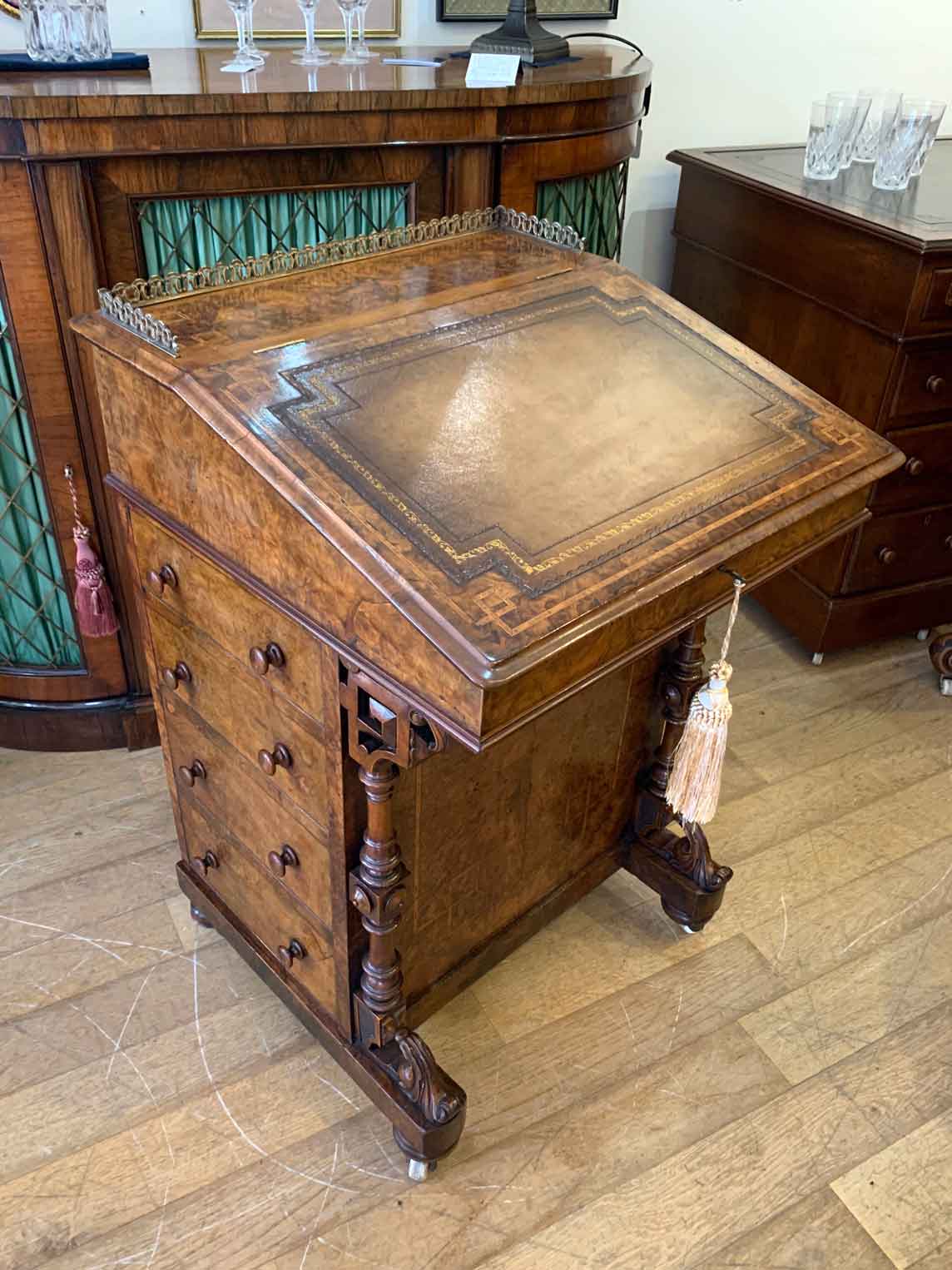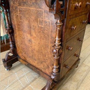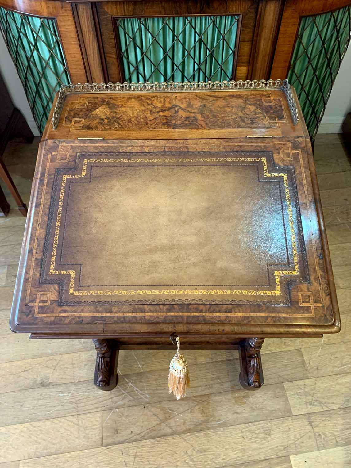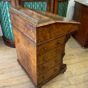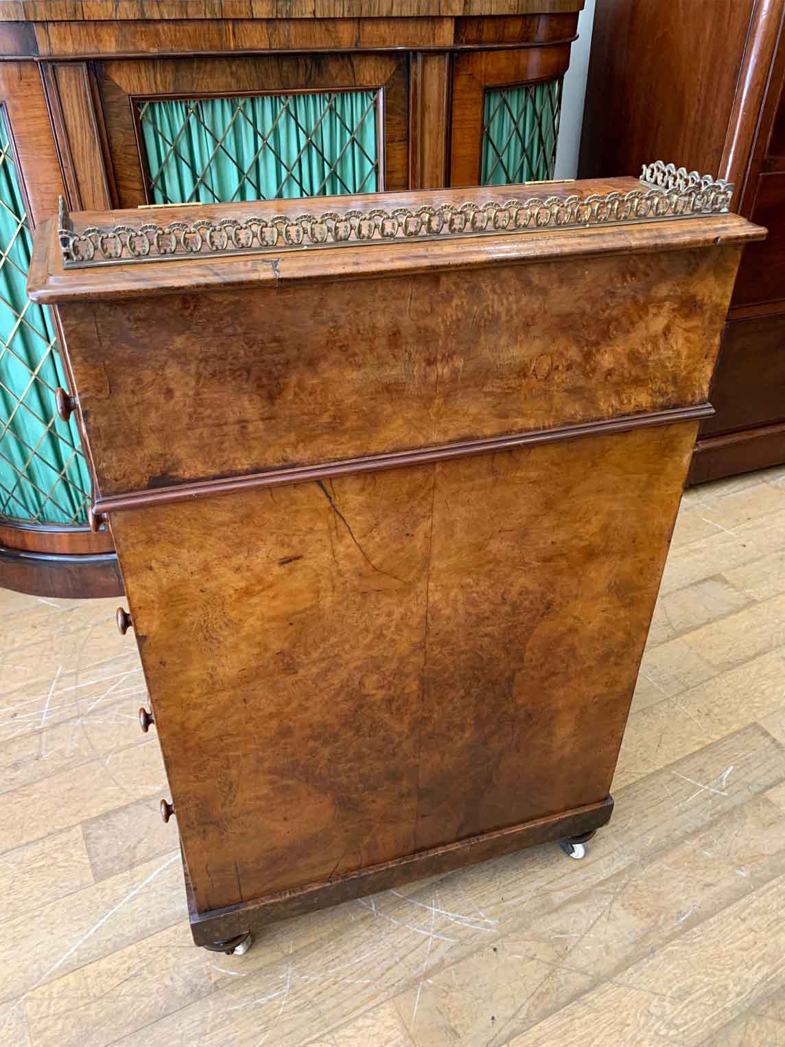 19th Century Victorian Burr Walnut Inlaid Davenport on a sloping green leather writing surface with solid brass rail on the top. A satinwood interior inside with two drawers and bun handles. Below on the right hand side of the desk has an small pull out drawer with ink well and pen holder, below has four fitted mahogany lined drawers. The left hand side there are four dummy drawers. All with turned wooden bun handles on both sides. The desk stands on turned column supports, a plinth with carved bun feet and castors.