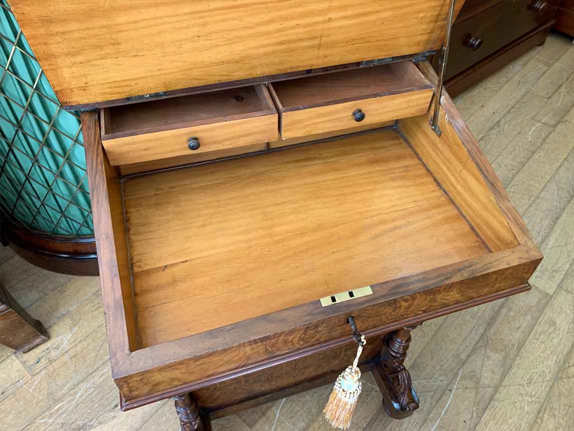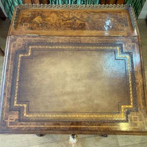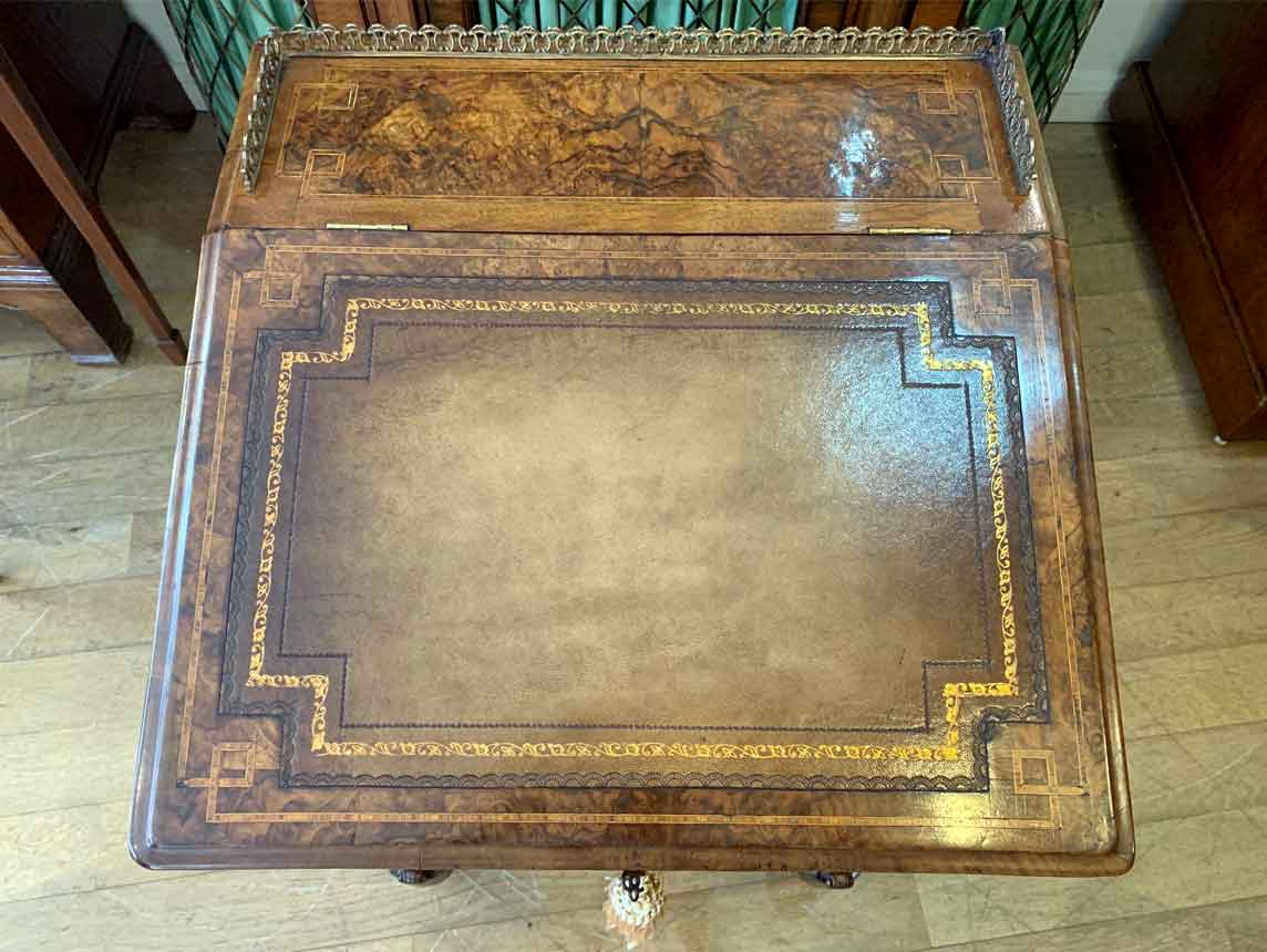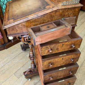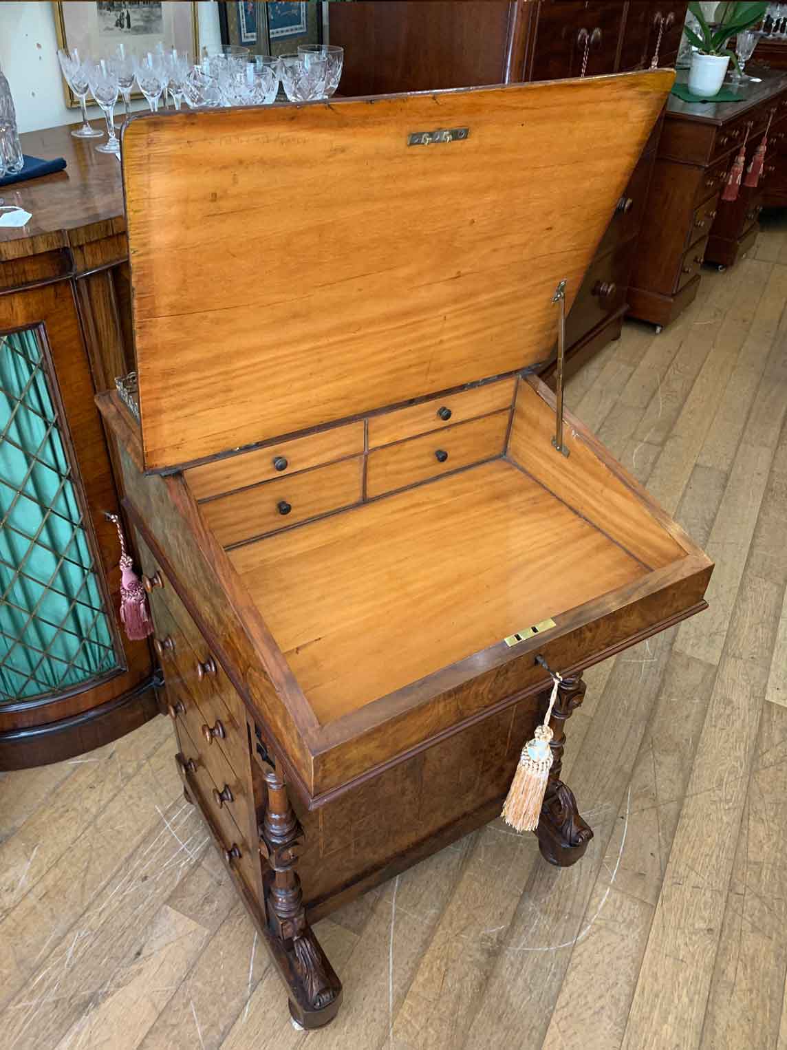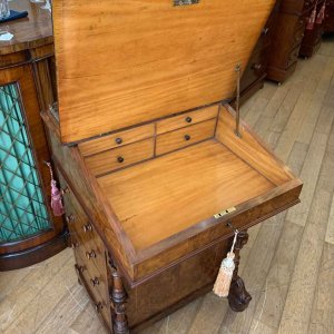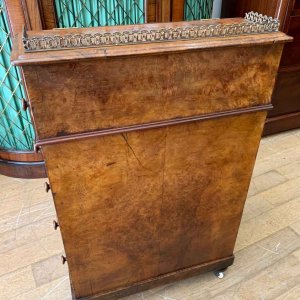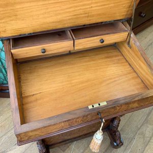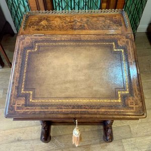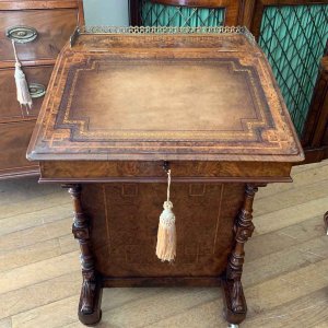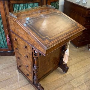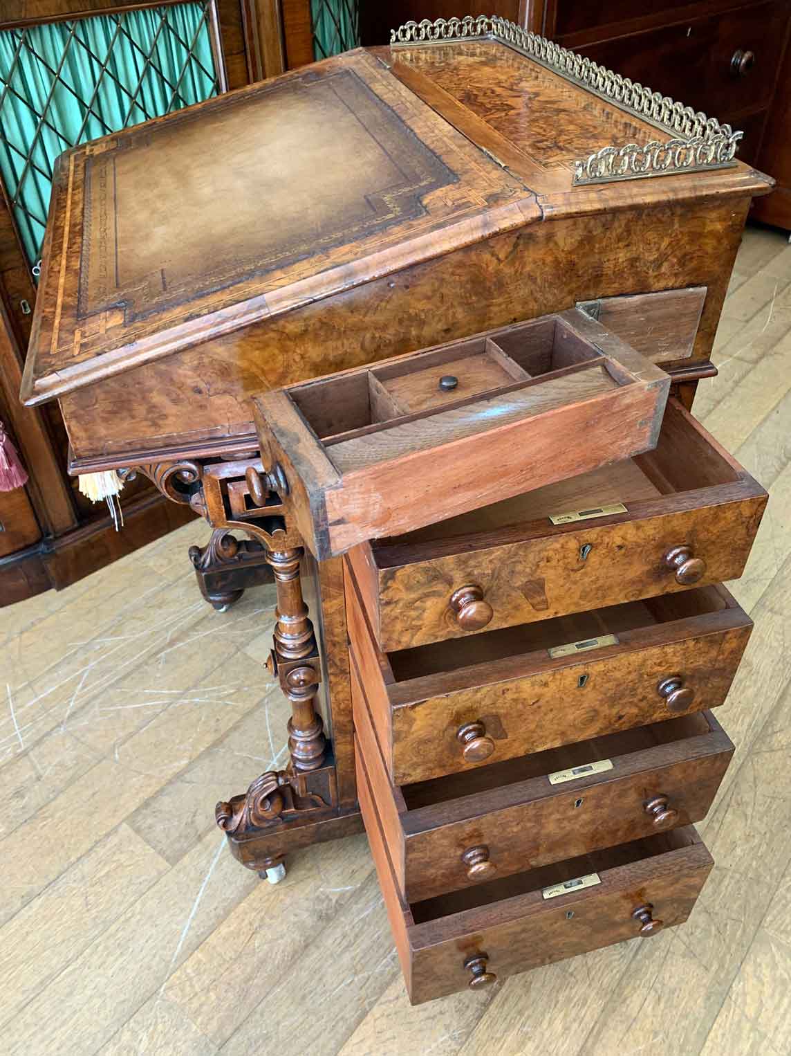 19th Century Victorian Burr Walnut Inlaid Davenport on a sloping green leather writing surface with solid brass rail on the top. A satinwood interior inside with two drawers and bun handles. Below on the right hand side of the desk has an small pull out drawer with ink well and pen holder, below has four fitted mahogany lined drawers. The left hand side there are four dummy drawers. All with turned wooden bun handles on both sides. The desk stands on turned column supports, a plinth with carved bun feet and castors.