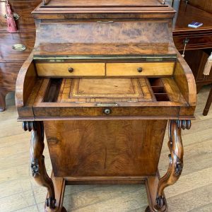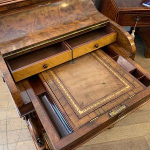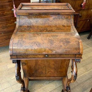 A High Quality 19th Century figured Victorian Burr Walnut Piano Davenport with a pop up top. The pull-out fitted interior, includes: green leather adjustable writing surface slope with and pen/ink wells and two small drawers.