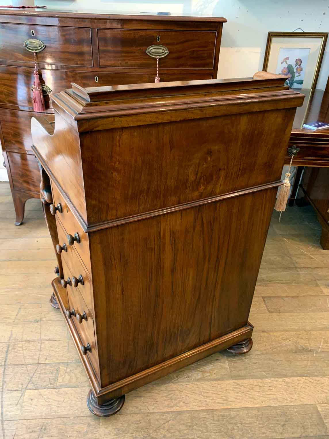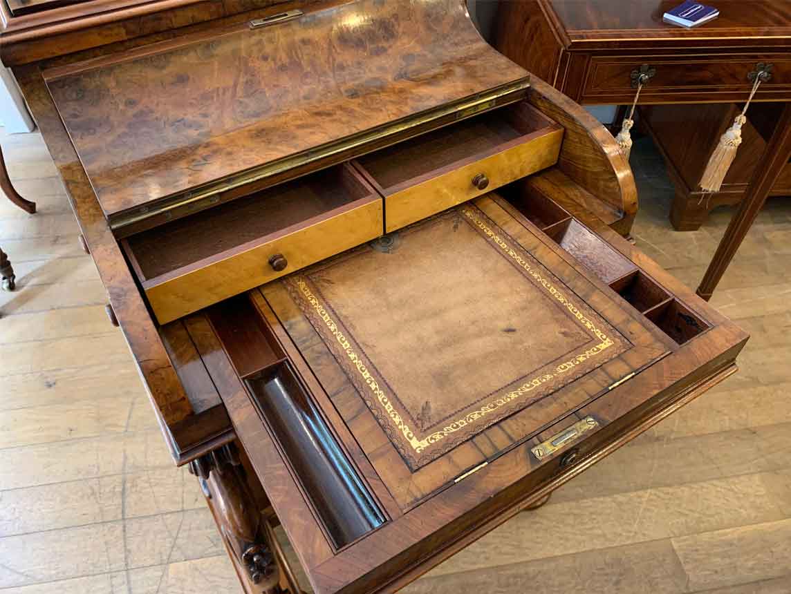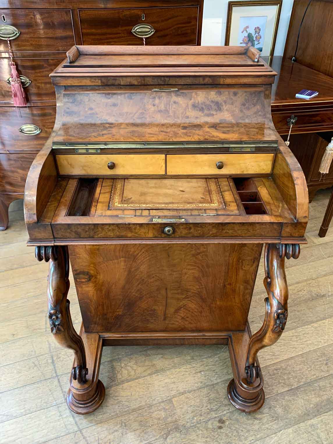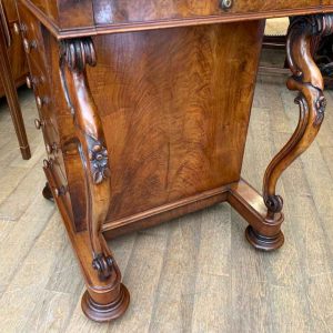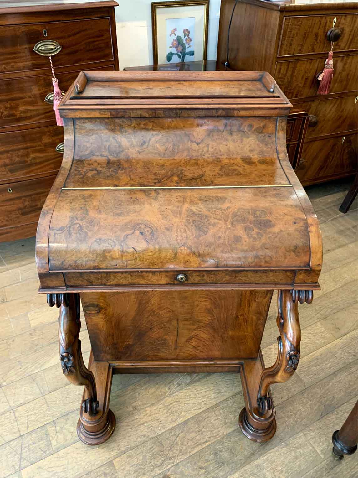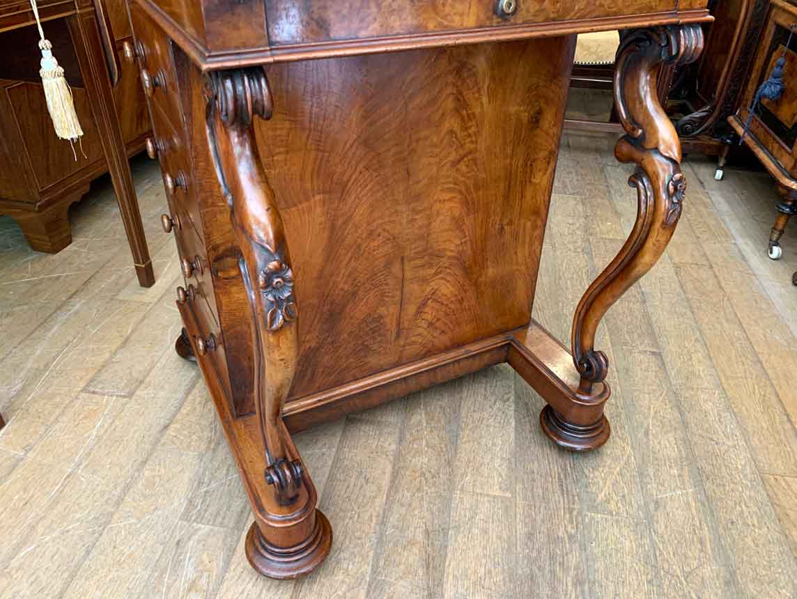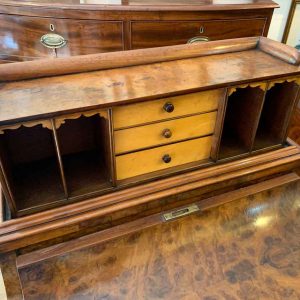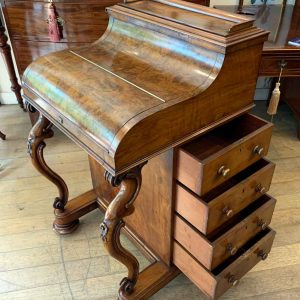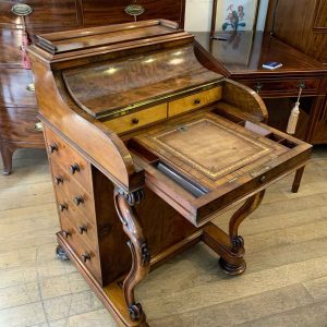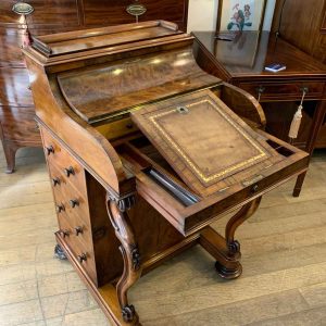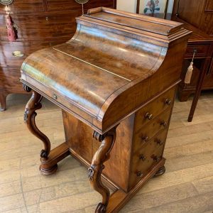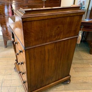 The ‘pop up top’ is activated by pressing a lever above the inside right hand drawer, which lifts up the secret compartment on the top of the Davenport to reveal: four fitted pigeons holes and three small drawers. This can be pressed back down which clicks back into place. Below on the right hand side of the Davenport has four fitted mahogany lined drawers with turned bun handles. The left hand side there are a four dummy drawers. Flanked by fluted turned columns with a carved floral decoration on a plinth base with castors.