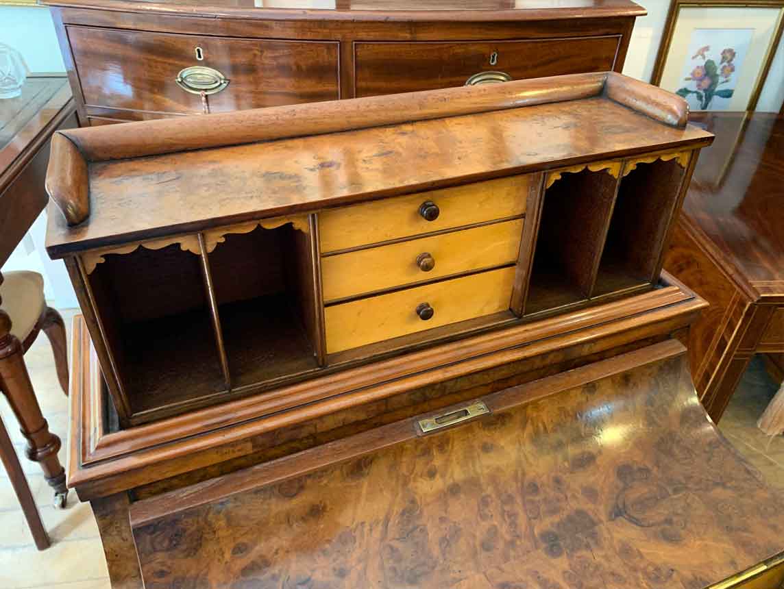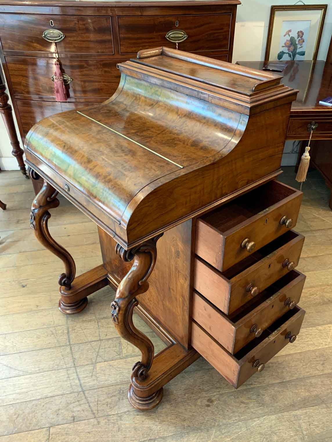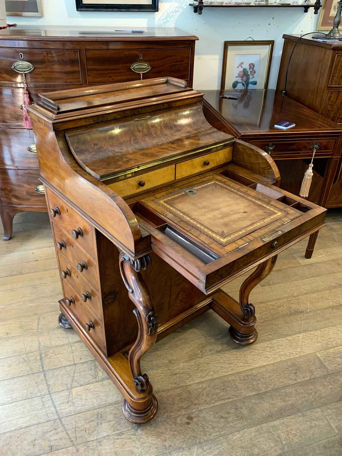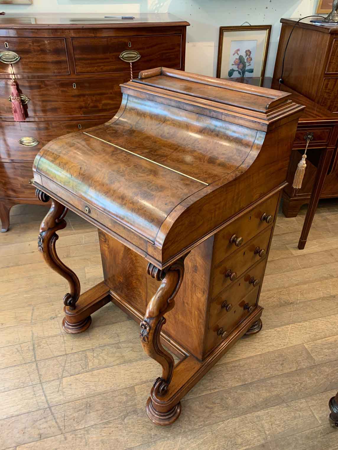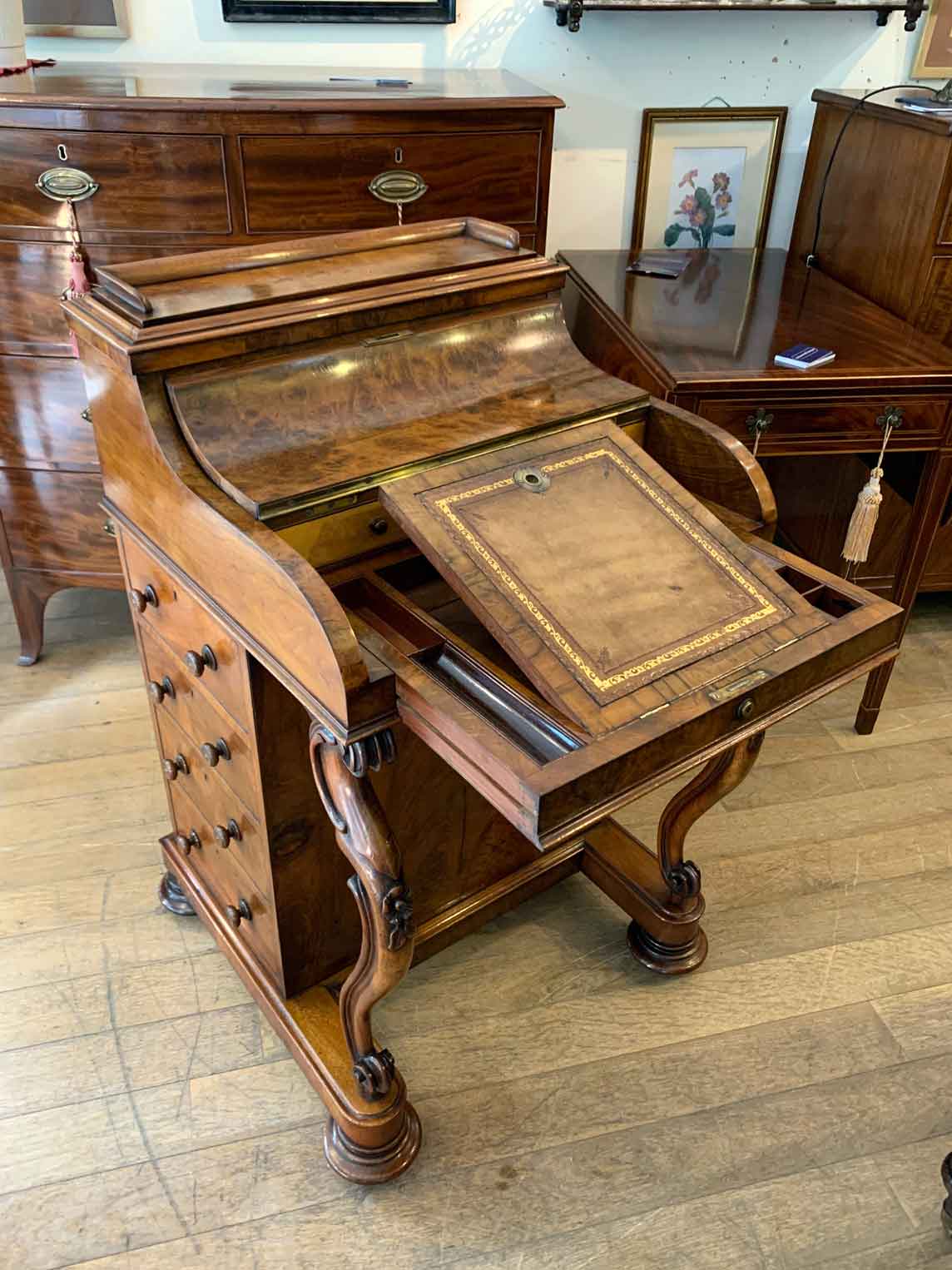 The ‘pop up top’ is activated by pressing a lever above the inside right hand drawer, which lifts up the secret compartment on the top of the Davenport to reveal: four fitted pigeons holes and three small drawers. This can be pressed back down which clicks back into place. Below on the right hand side of the Davenport has four fitted mahogany lined drawers with turned bun handles. The left hand side there are a four dummy drawers. Flanked by fluted turned columns with a carved floral decoration on a plinth base with castors.