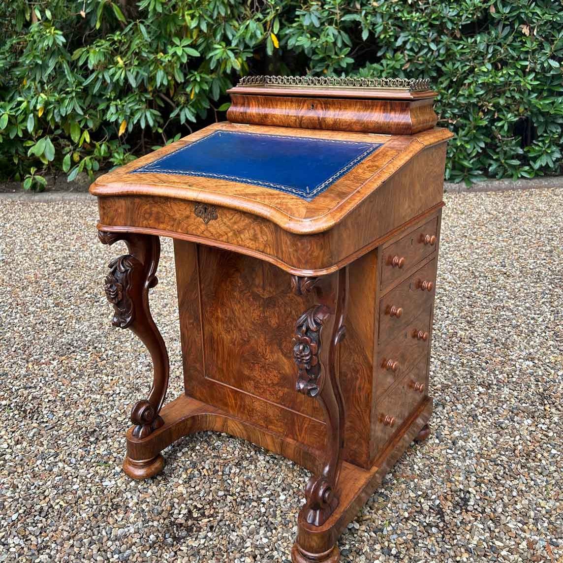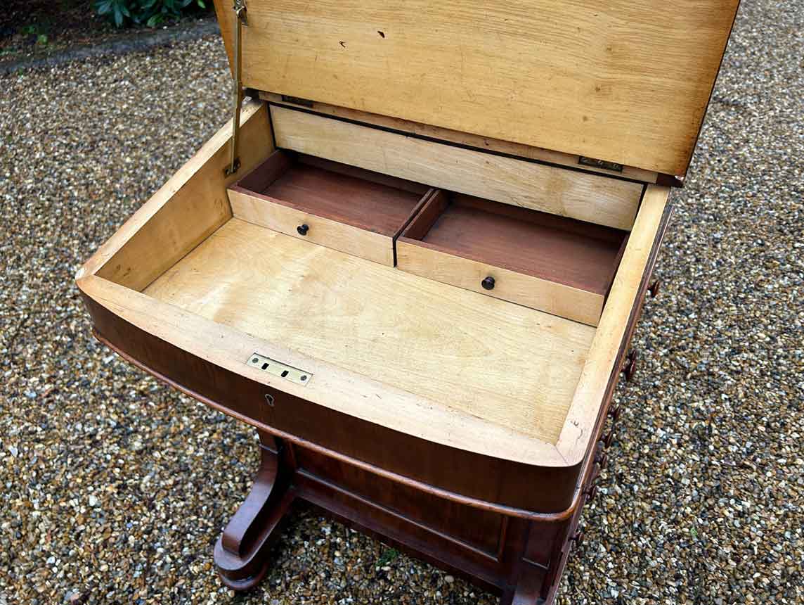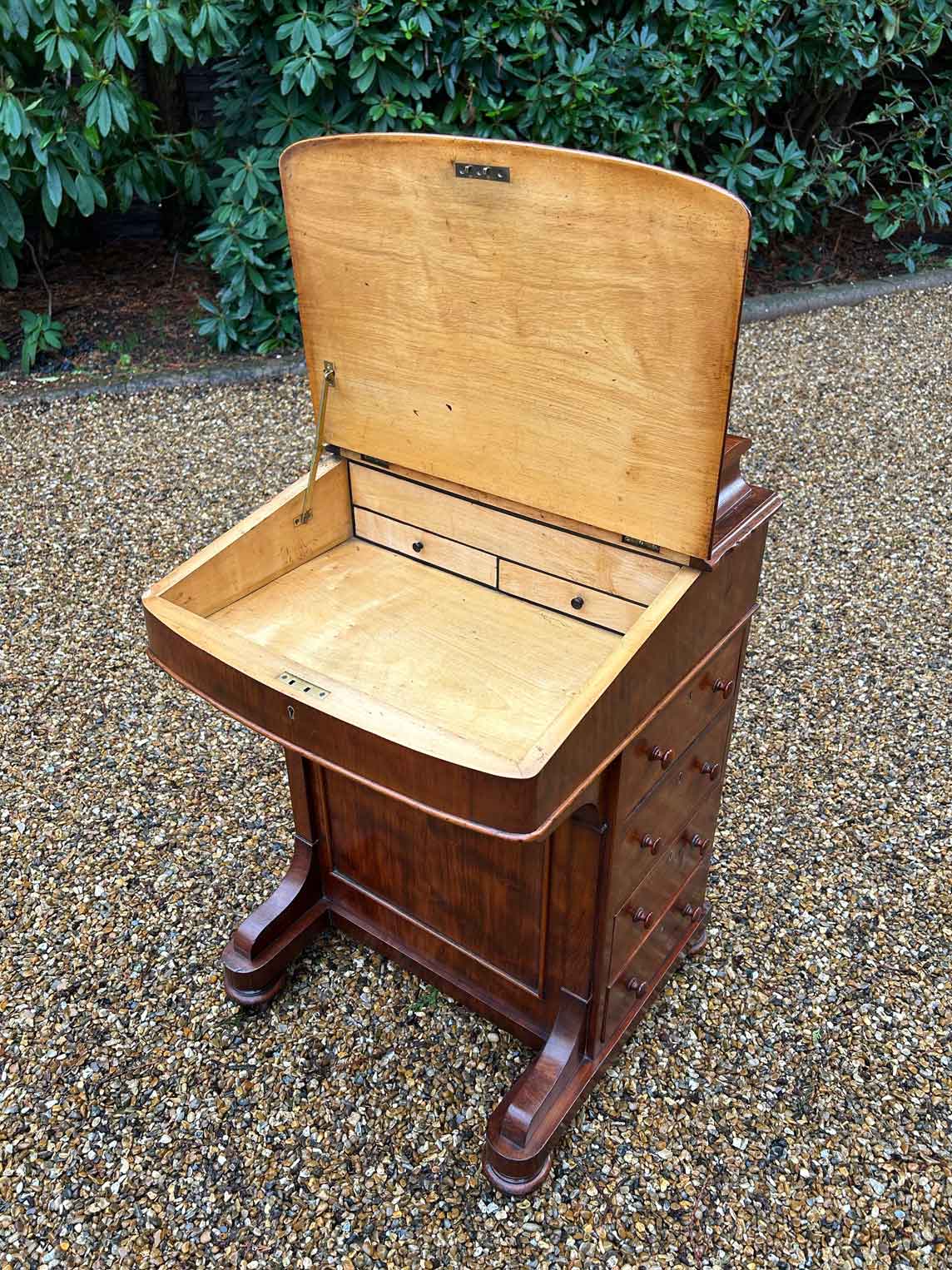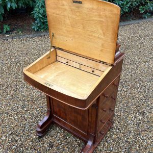 The writing surface lifts up to reveal a satinwood interior with two small working drawers. On the left side of the Davenport has four dummy drawers with four working mahogany lined drawers the right hand side. The top drawer above the writing slope opens up to reveal five letter compartments, a fitted ink pen & well fittings. On a plinth base, with turned bun feet and castors.