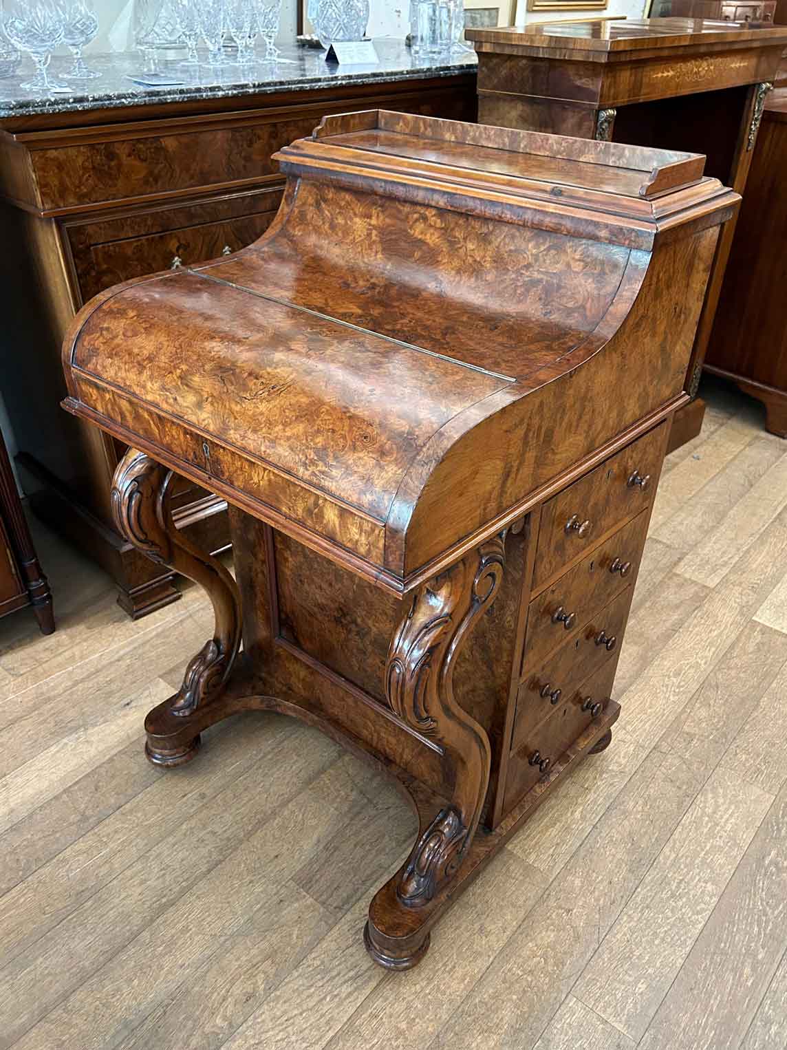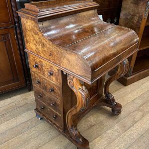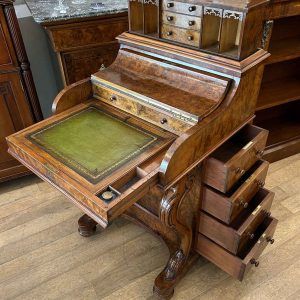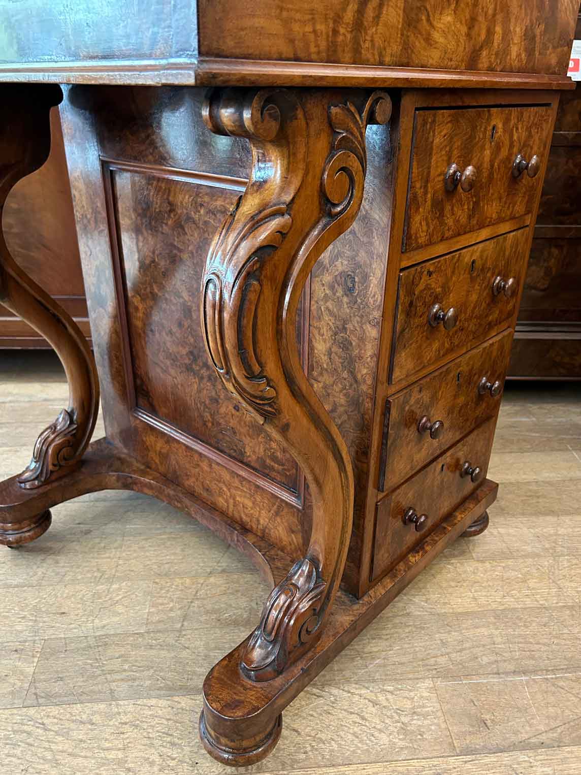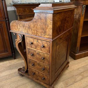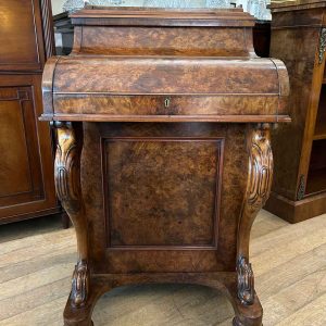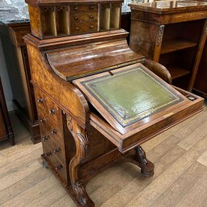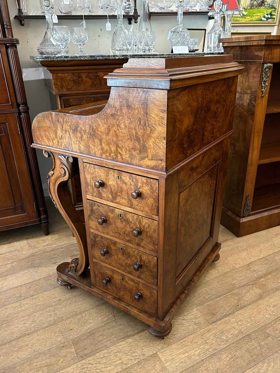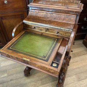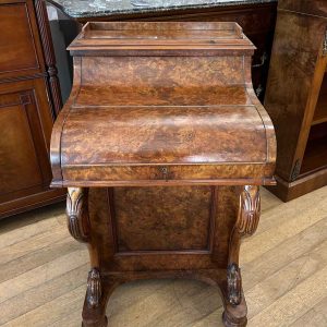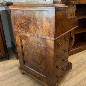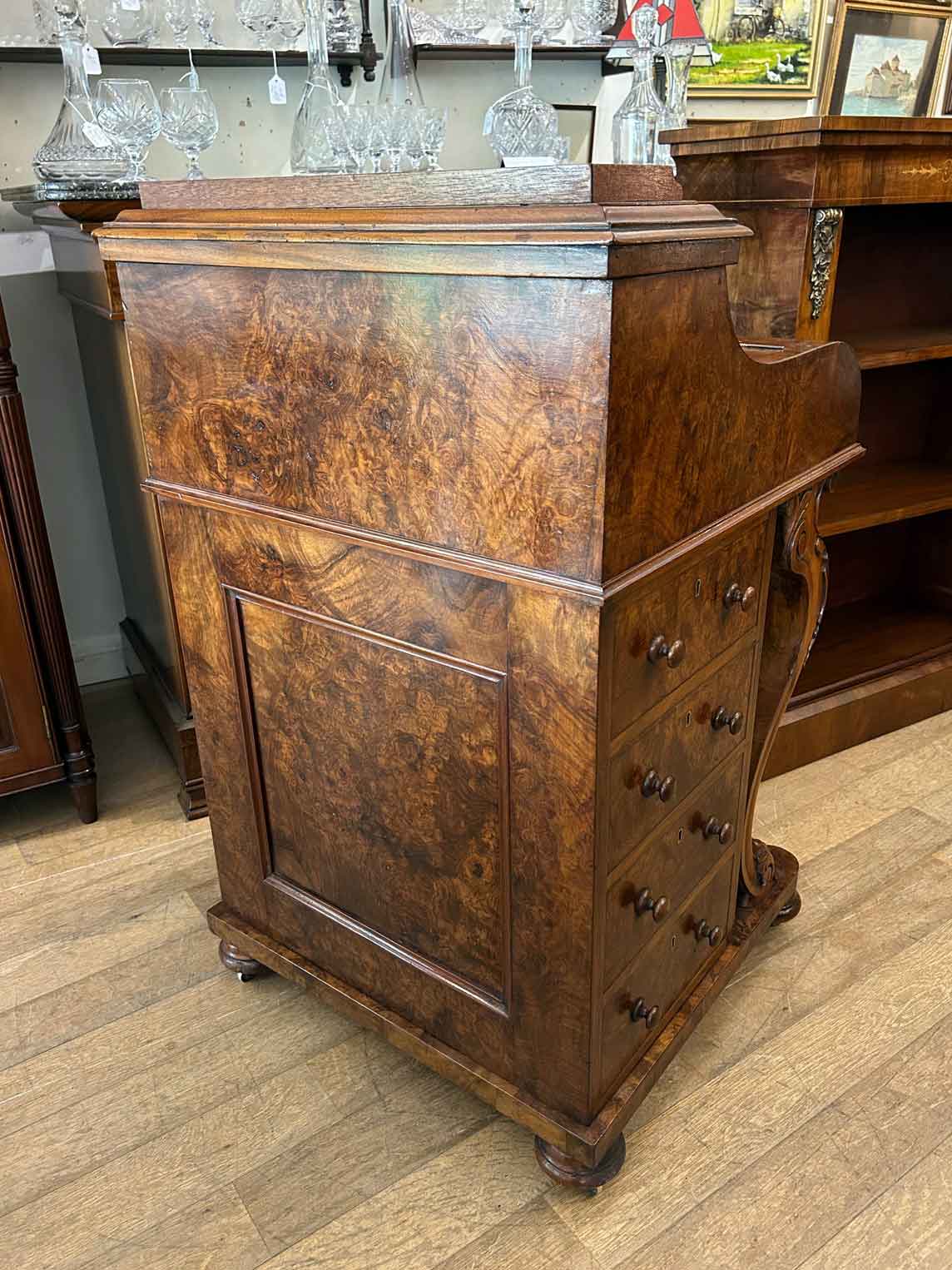 A High Quality 19th Century figured Victorian Burr Walnut Piano Davenport with a pop up top. The pull-out fitted interior, includes: green leather adjustable writing surface slope with and pen/ink wells and two small drawers.