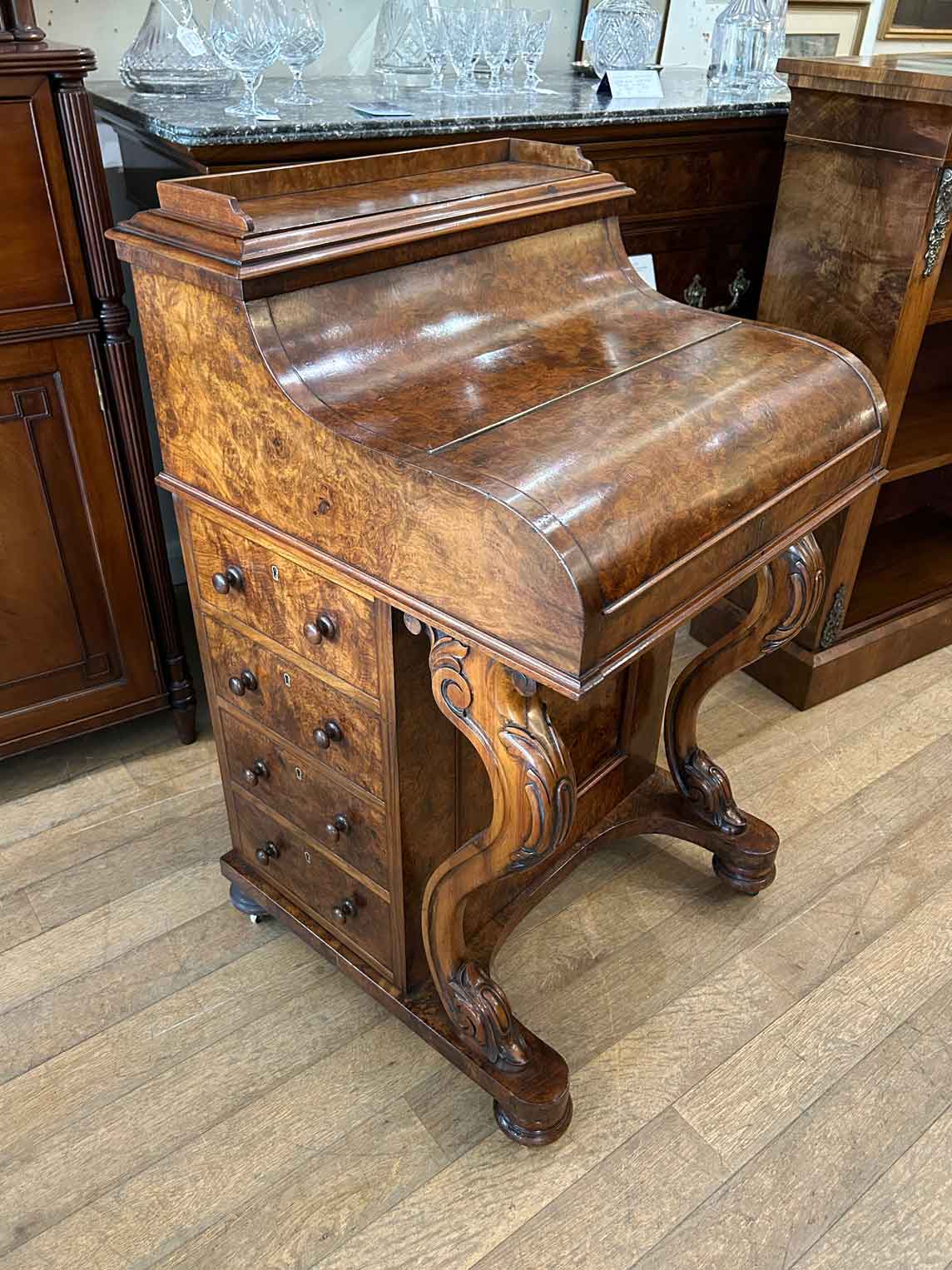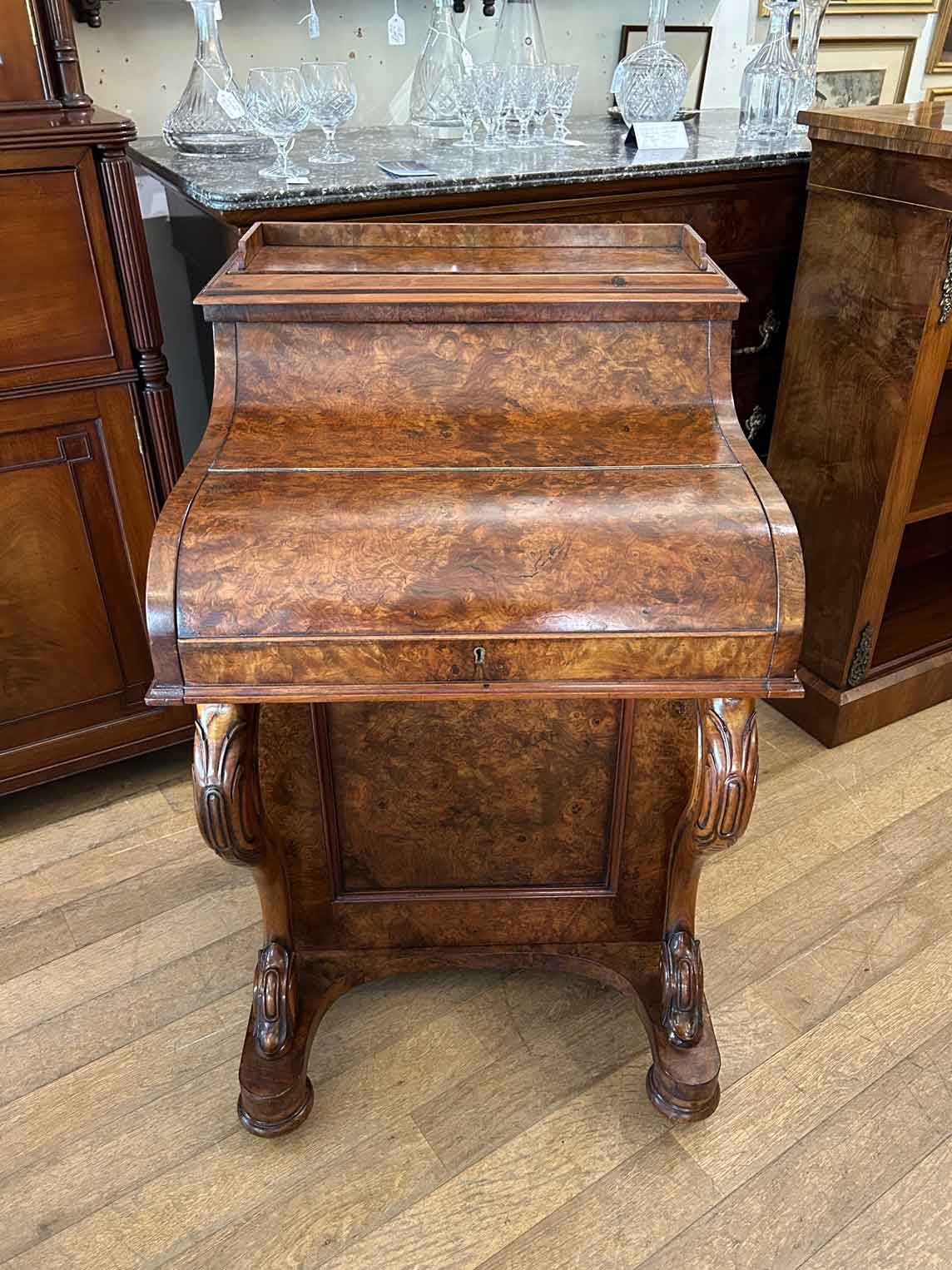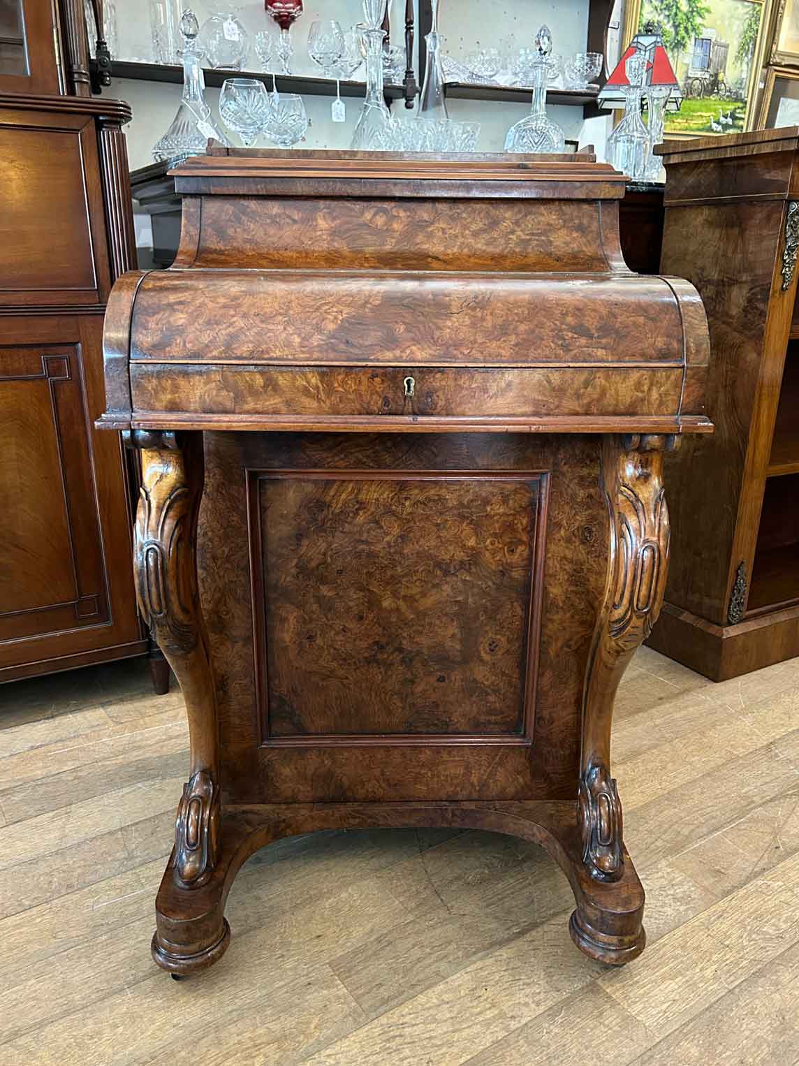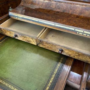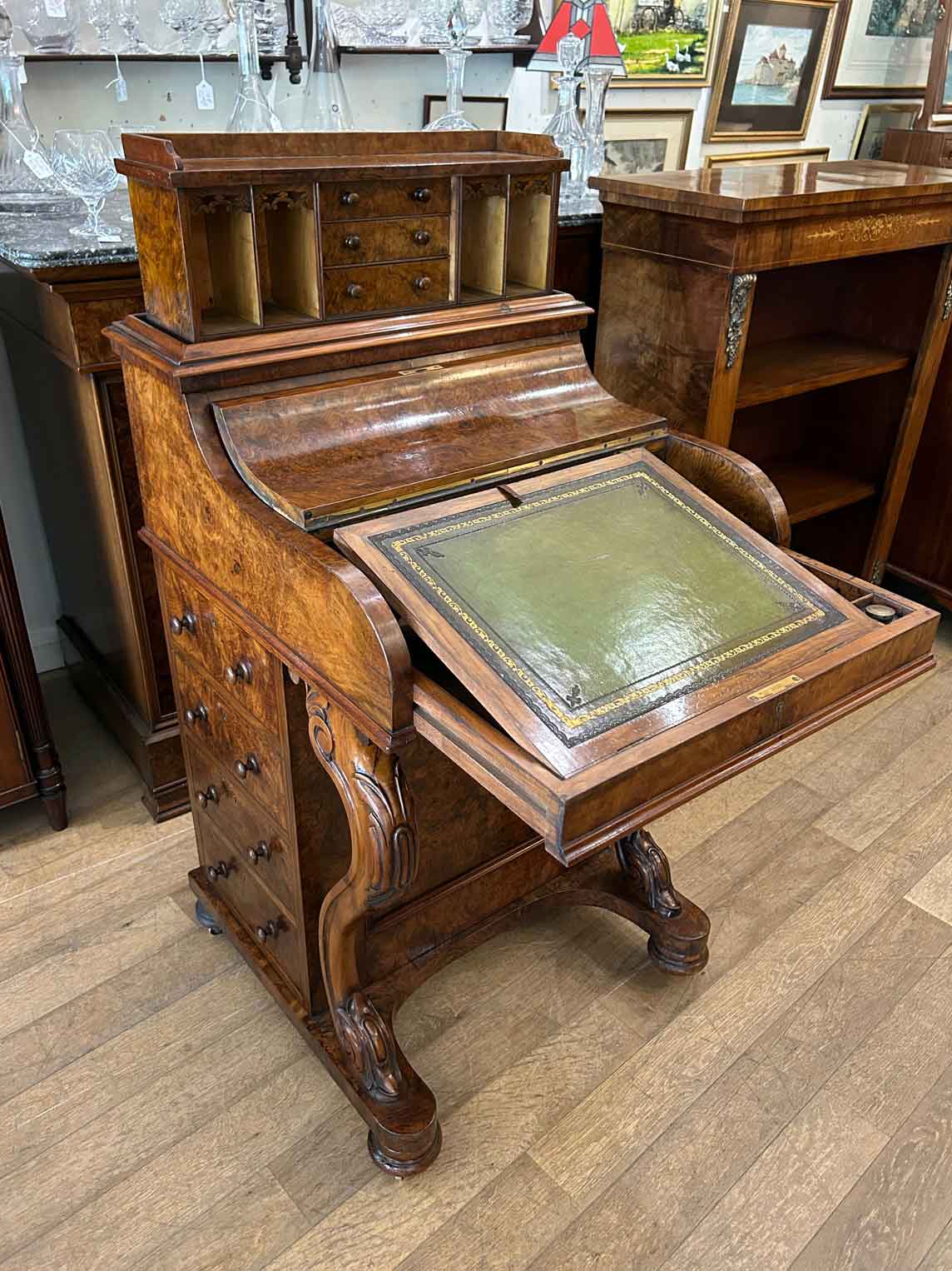 A High Quality 19th Century figured Victorian Burr Walnut Piano Davenport with a pop up top. The pull-out fitted interior, includes: green leather adjustable writing surface slope with and pen/ink wells and two small drawers.