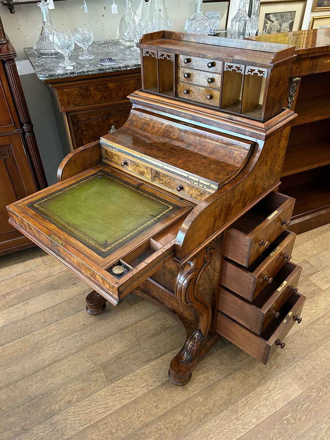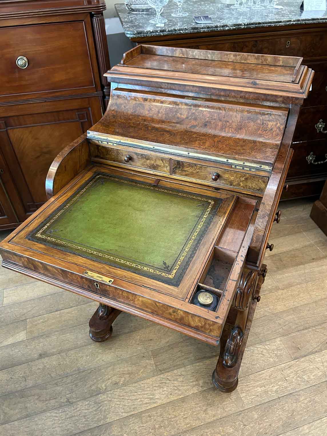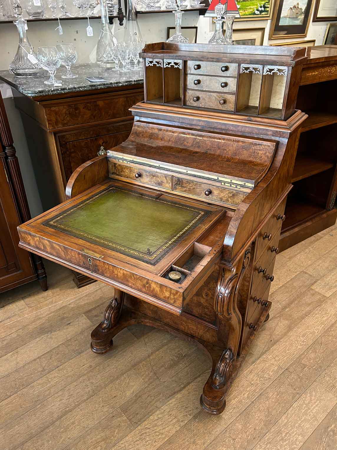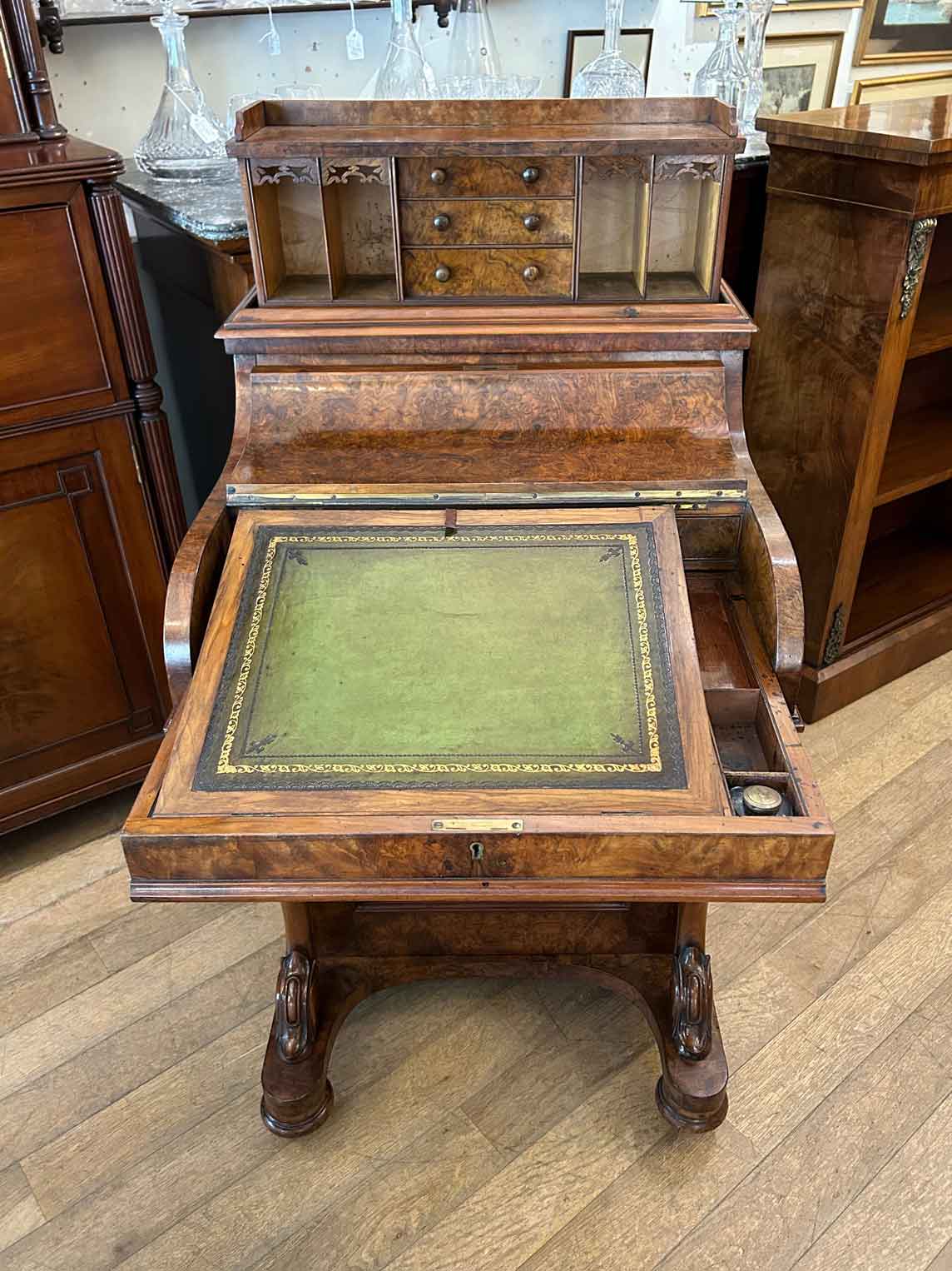 A High Quality 19th Century figured Victorian Burr Walnut Piano Davenport with a pop up top. The pull-out fitted interior, includes: green leather adjustable writing surface slope with and pen/ink wells and two small drawers.