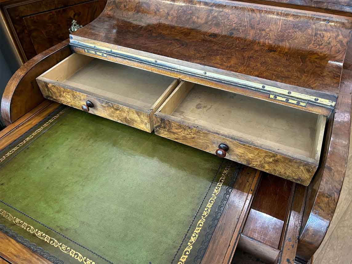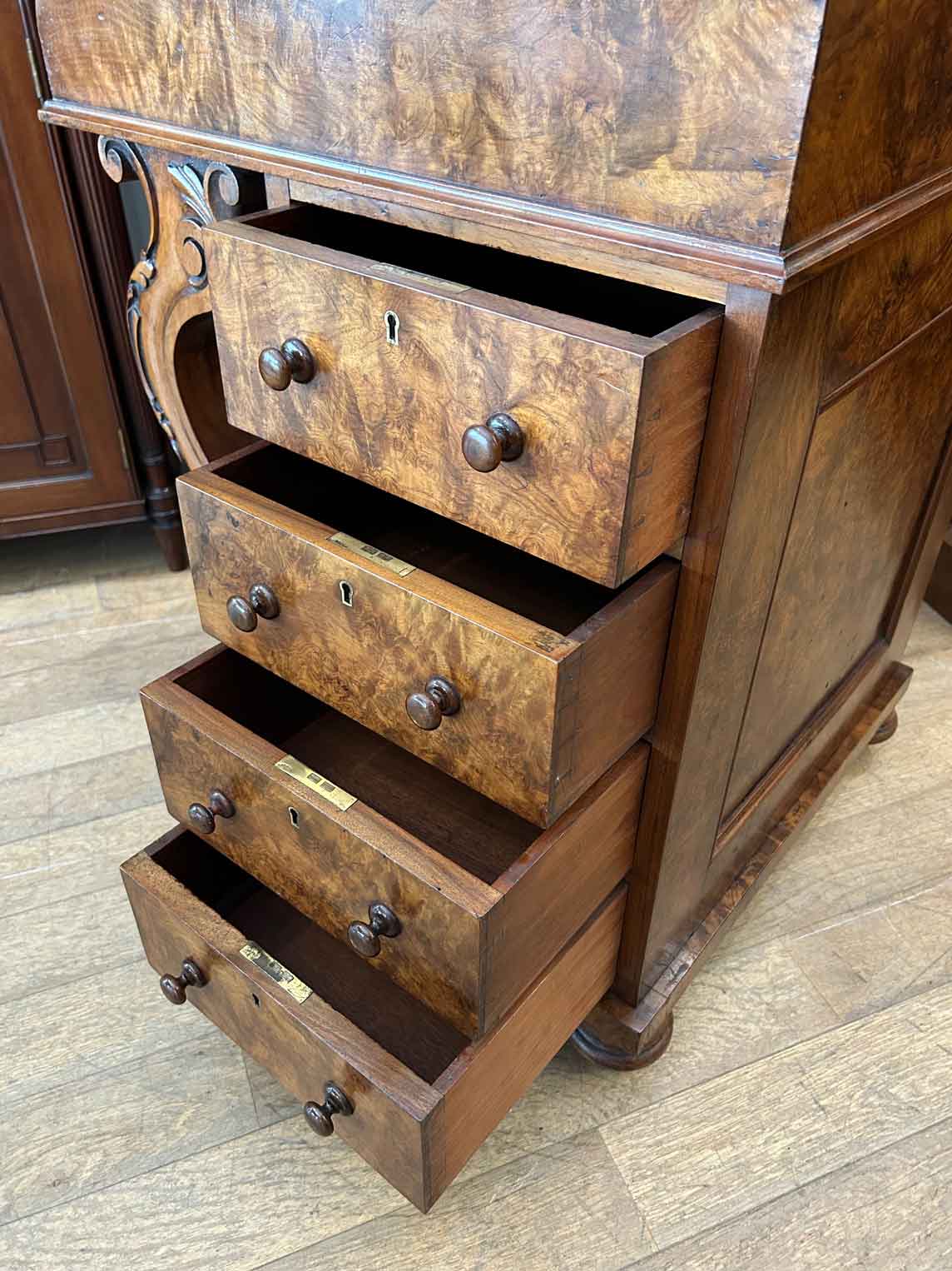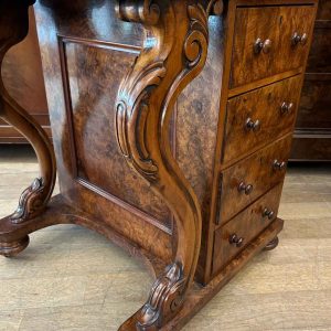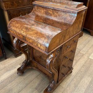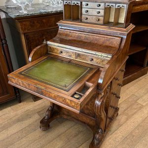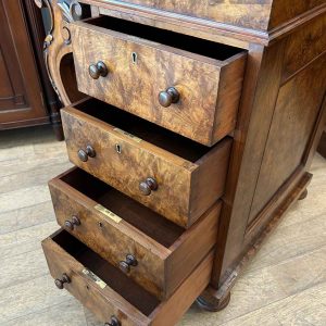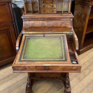 The ‘pop up top’ is activated by pulling a secret lever above the inside right hand drawer, which lifts up the secret compartment on the top of the Davenport to reveal: four fitted pigeons holes and three small drawers. This can be pushed / pressed back down which clicks back into place. Below on the right hand side of the Davenport has four fitted mahogany lined drawers with turned bun handles. The left hand side there are a four dummy drawers. Flanked by fluted turned columns with a carved floral decoration on a plinth base with castors.