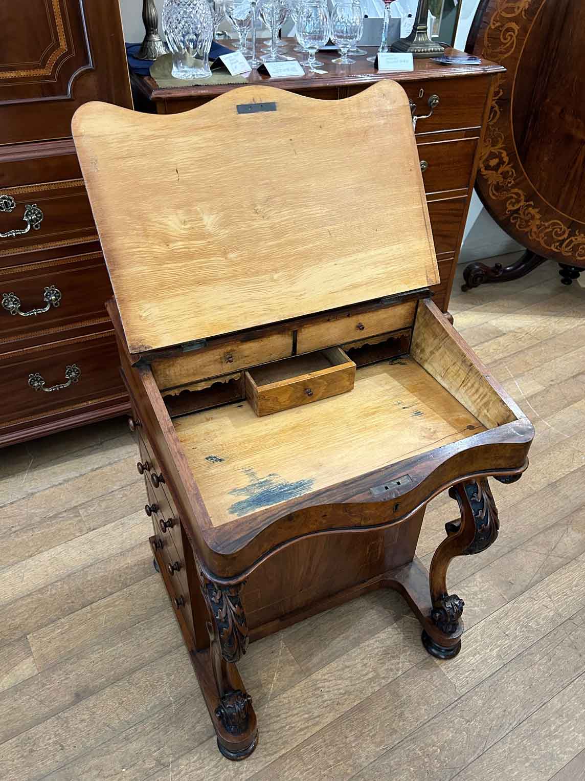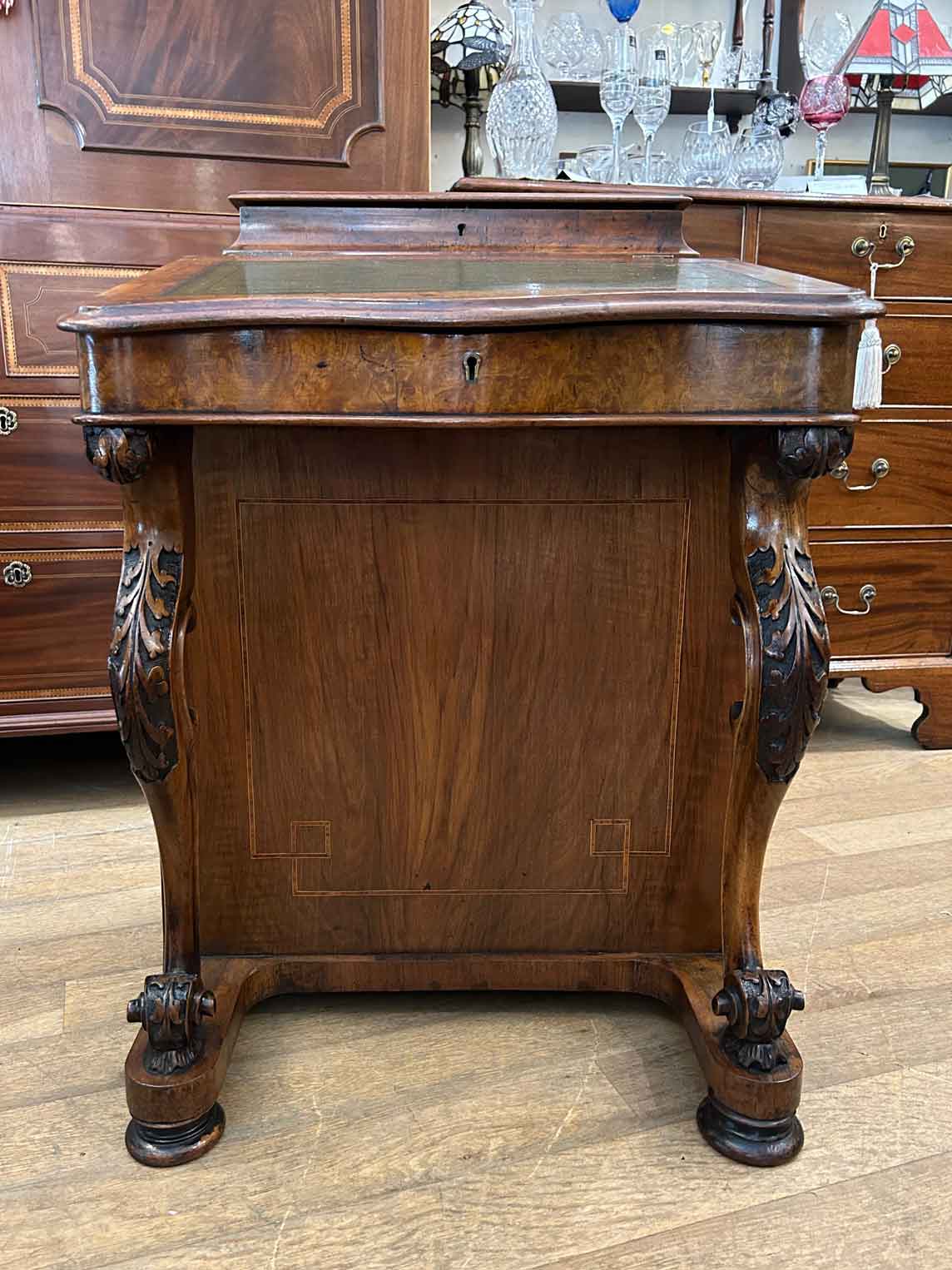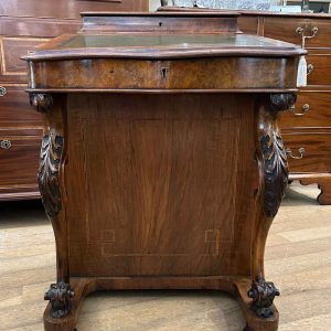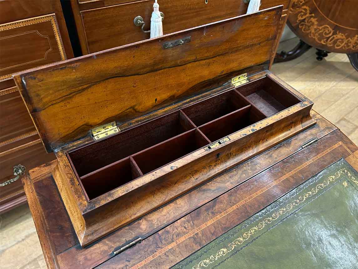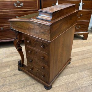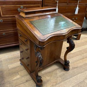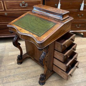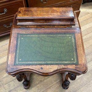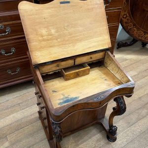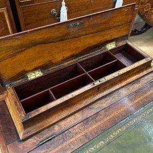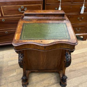19th Century Victorian Burr Walnut Inlaid Davenport on a sloping green leather writing surface, Satinwood fitted interior inside with one drawer and two dummy drawers above. The lift up top opens to reveal a letter racks and a pen tray compartments inside. The right hand side of the desk has 4 solid mahogany lined drawers and to the left hand side there are four dummy drawers, all with turned wooden knobs. The desk stands on a plinth with castors.