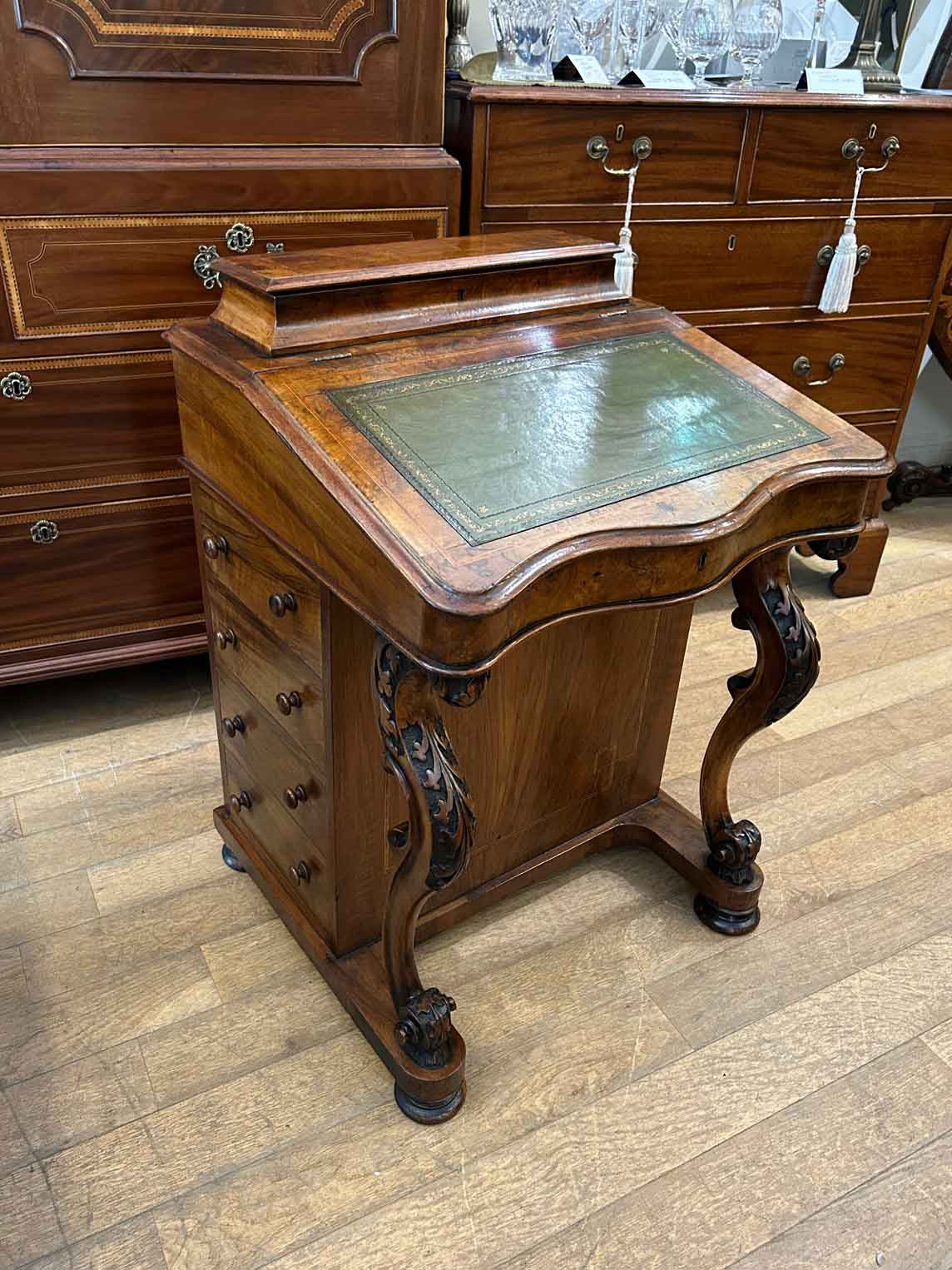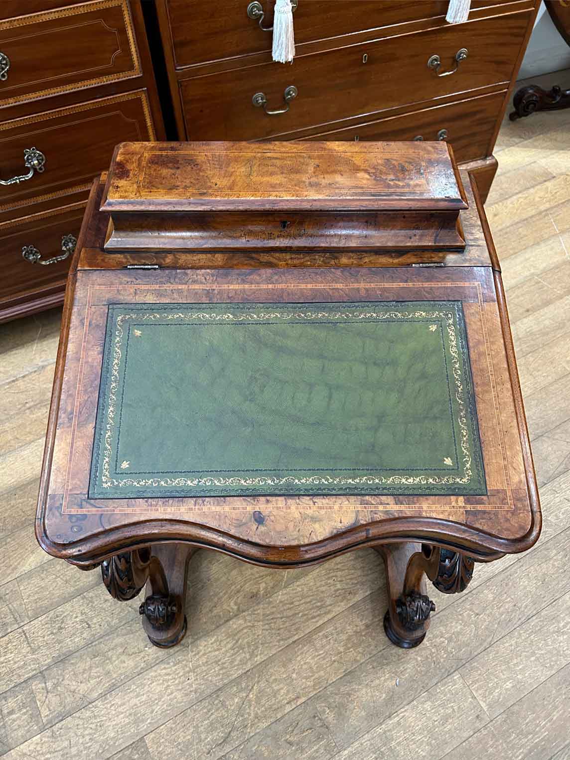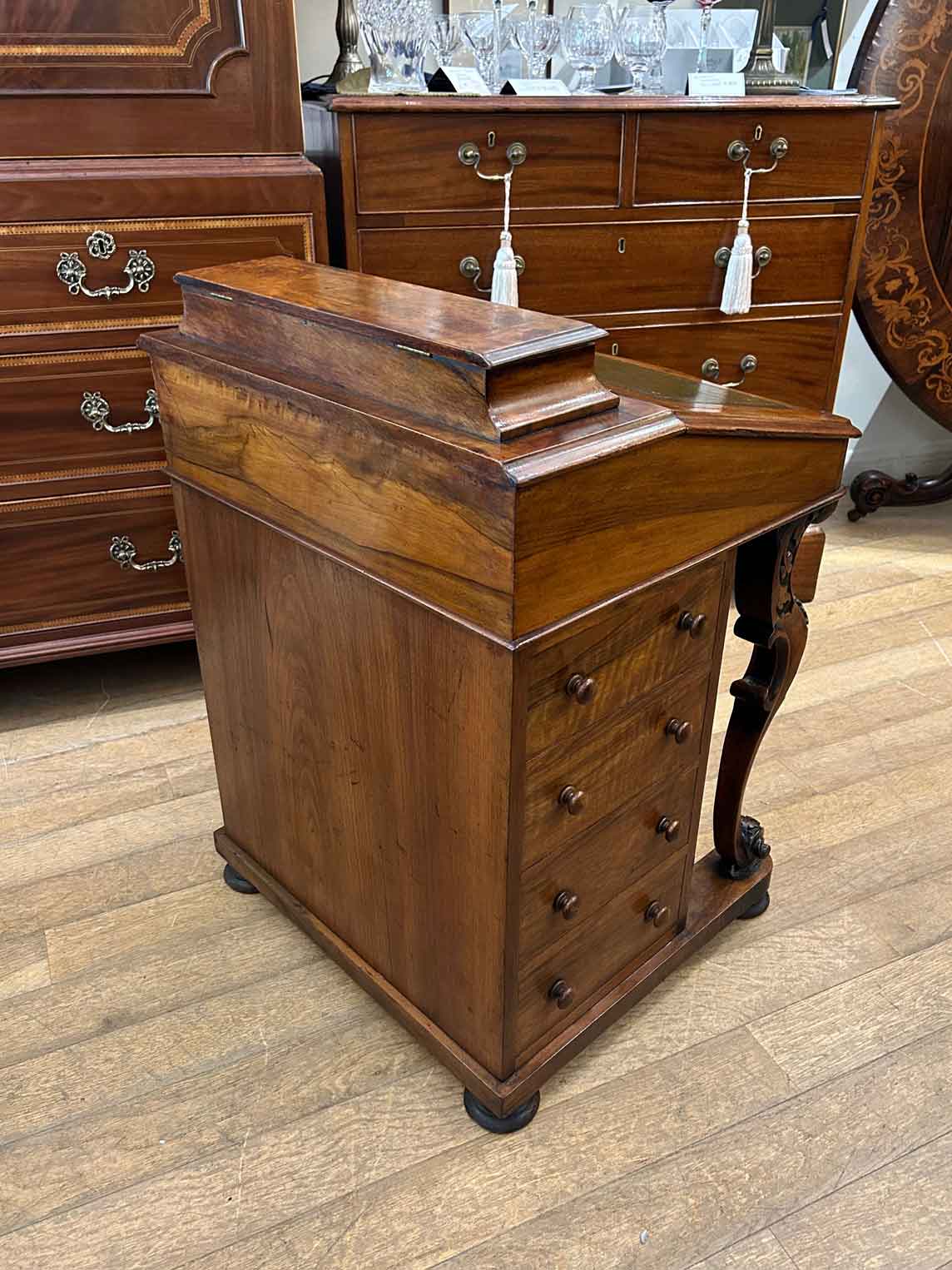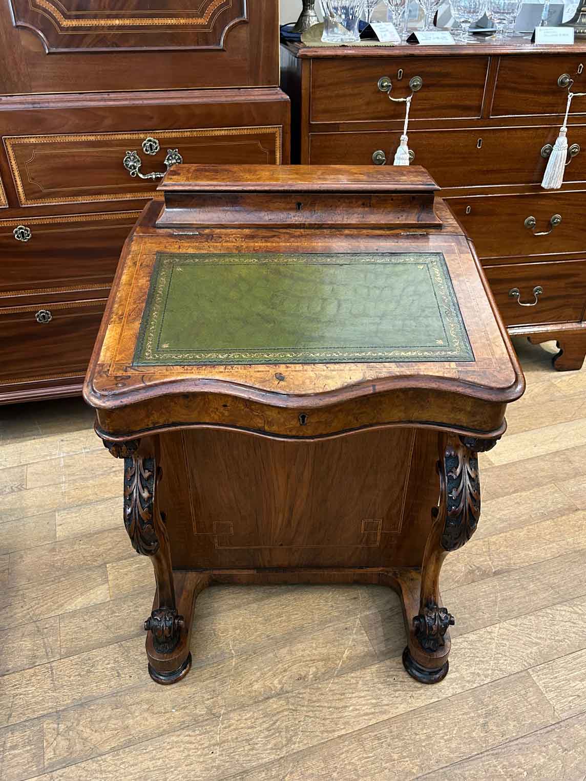 19th Century Victorian Burr Walnut Inlaid Davenport on a sloping green leather writing surface, Satinwood fitted interior inside with one drawer and two dummy drawers above. The lift up top opens to reveal a letter racks and a pen tray compartments inside. The right hand side of the desk has 4 solid mahogany lined drawers and to the left hand side there are four dummy drawers, all with turned wooden knobs. The desk stands on a plinth with castors.