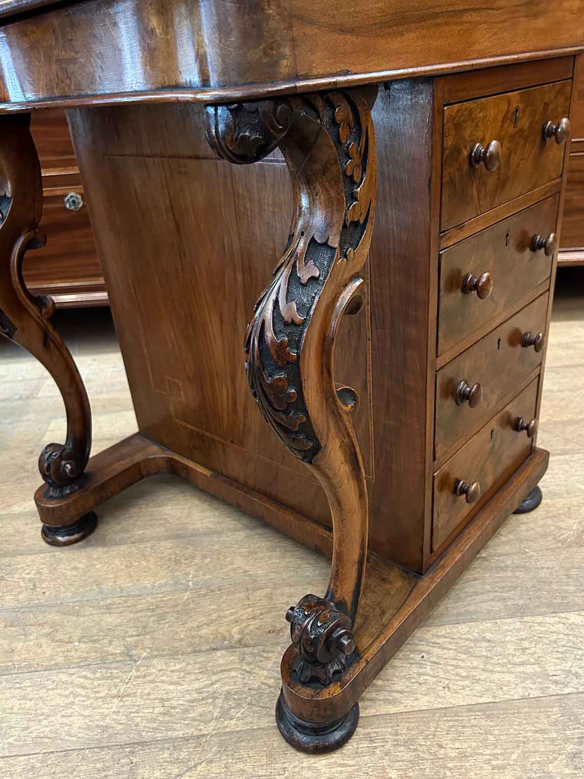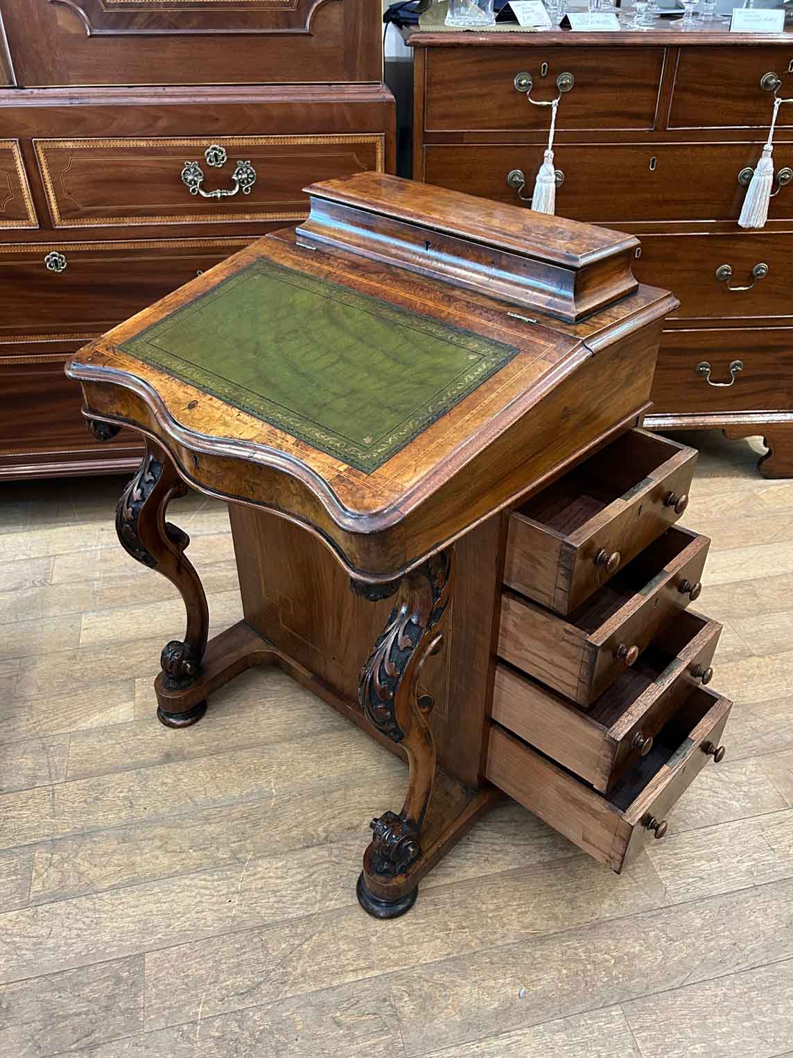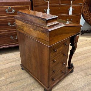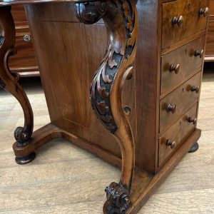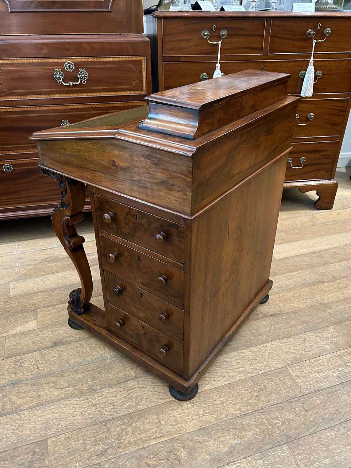 19th Century Victorian Burr Walnut Inlaid Davenport on a sloping green leather writing surface, Satinwood fitted interior inside with one drawer and two dummy drawers above. The lift up top opens to reveal a letter racks and a pen tray compartments inside. The right hand side of the desk has 4 solid mahogany lined drawers and to the left hand side there are four dummy drawers, all with turned wooden knobs. The desk stands on a plinth with castors.