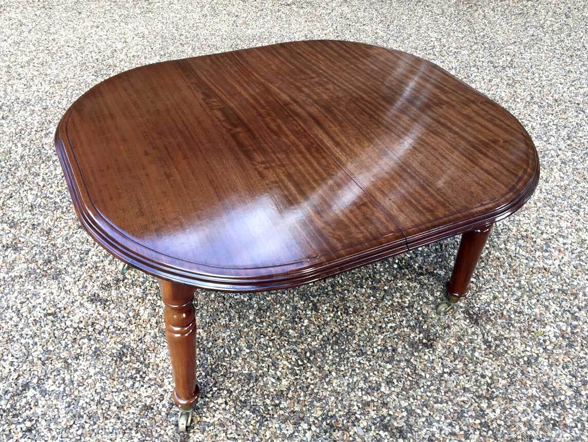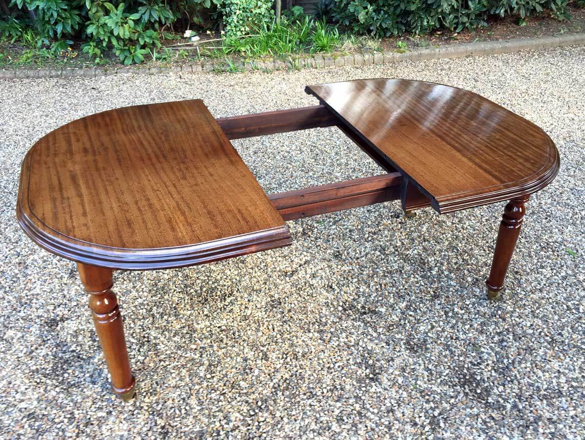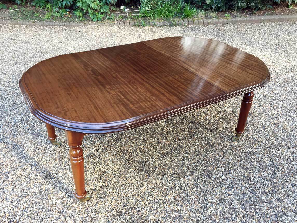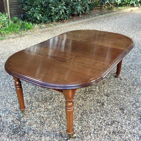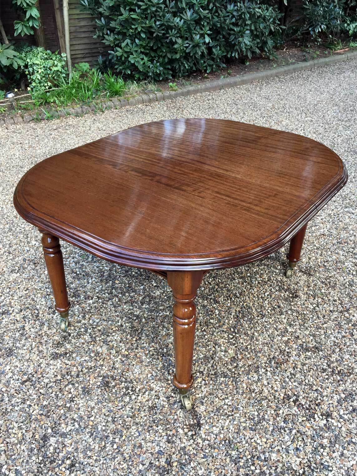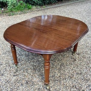 19th Century Extending Dining Table with rounded corners and one original extra leaf. On elegant turned legs and castors to base.