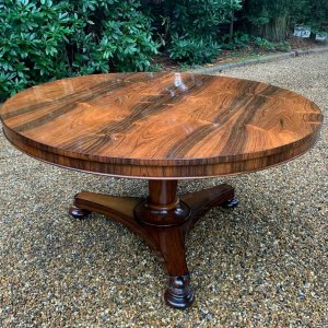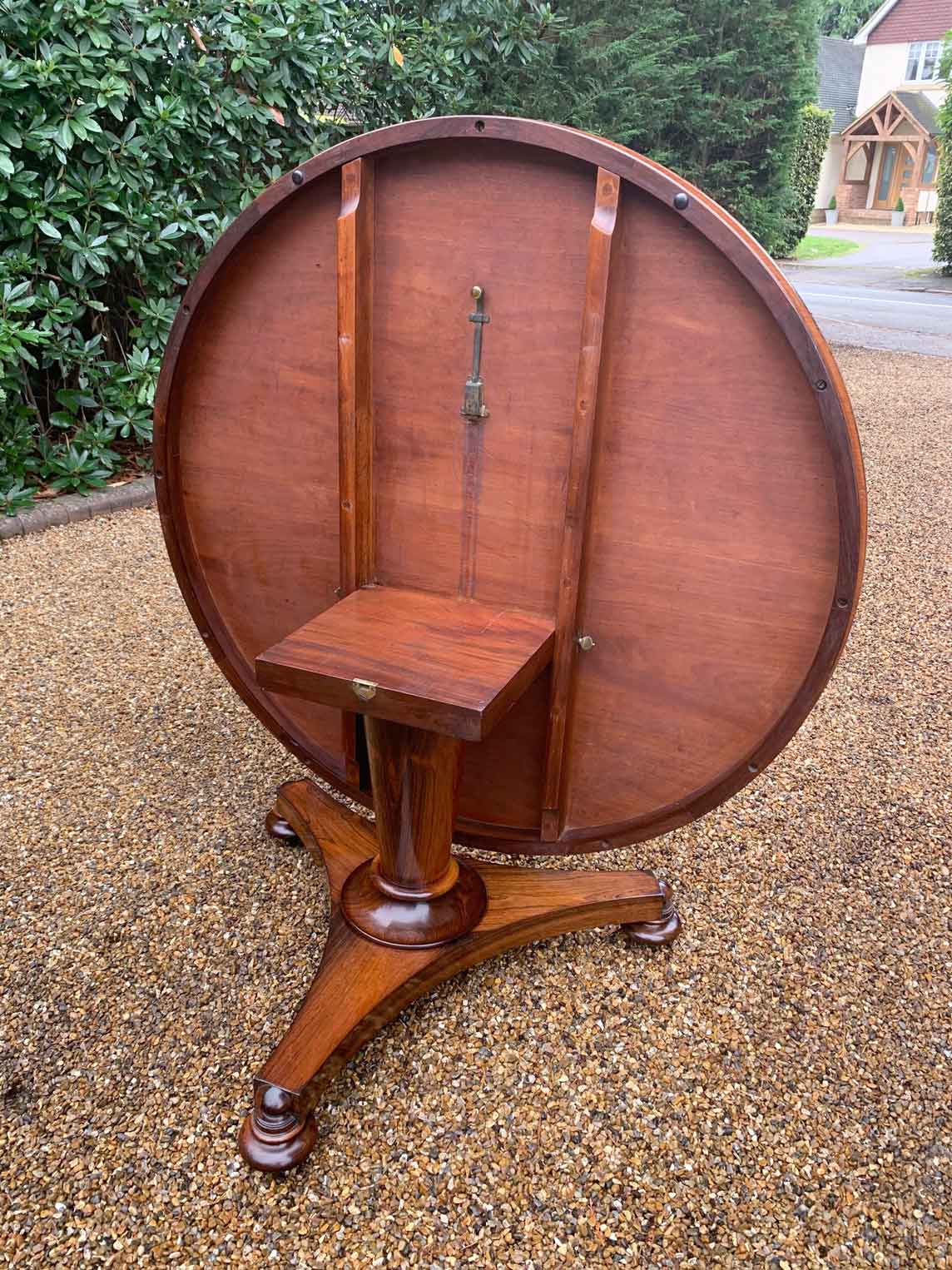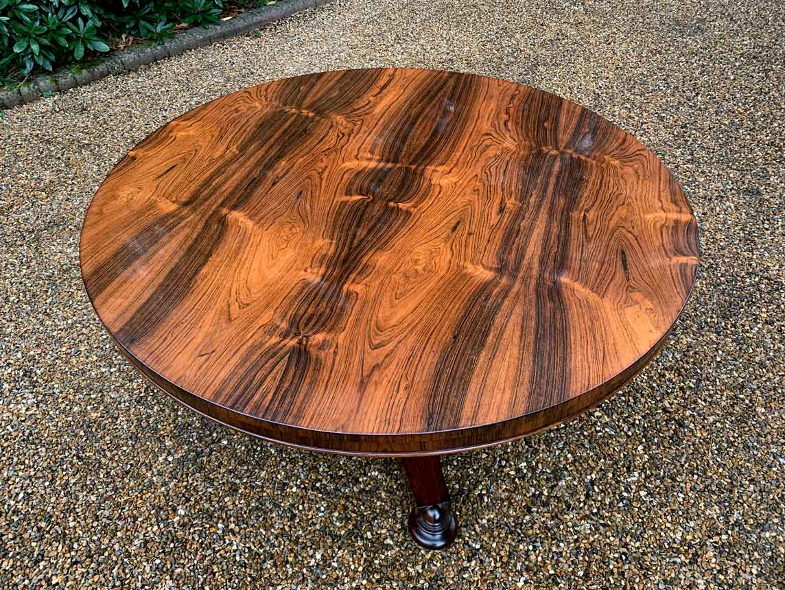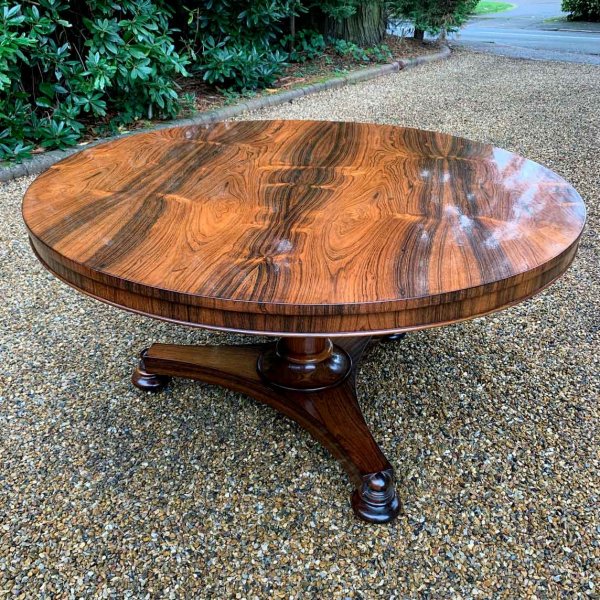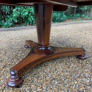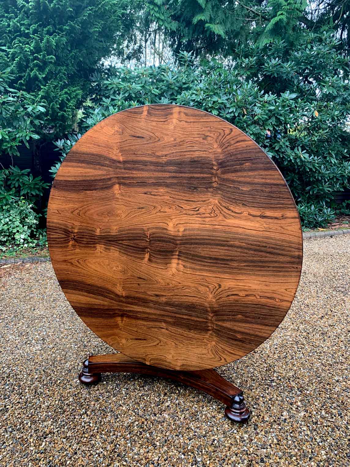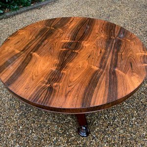 A very high quality 19th Century William IV Rosewood Tilt-Top Breakfast Table, raised on a turned and carved baluster column and three legs on castors.
