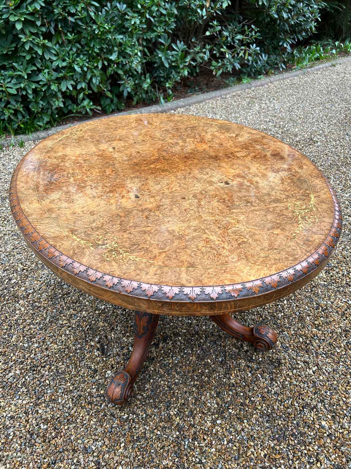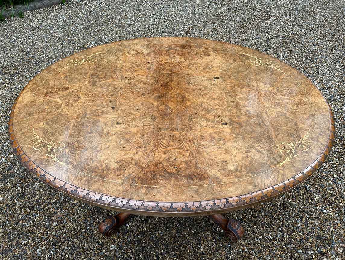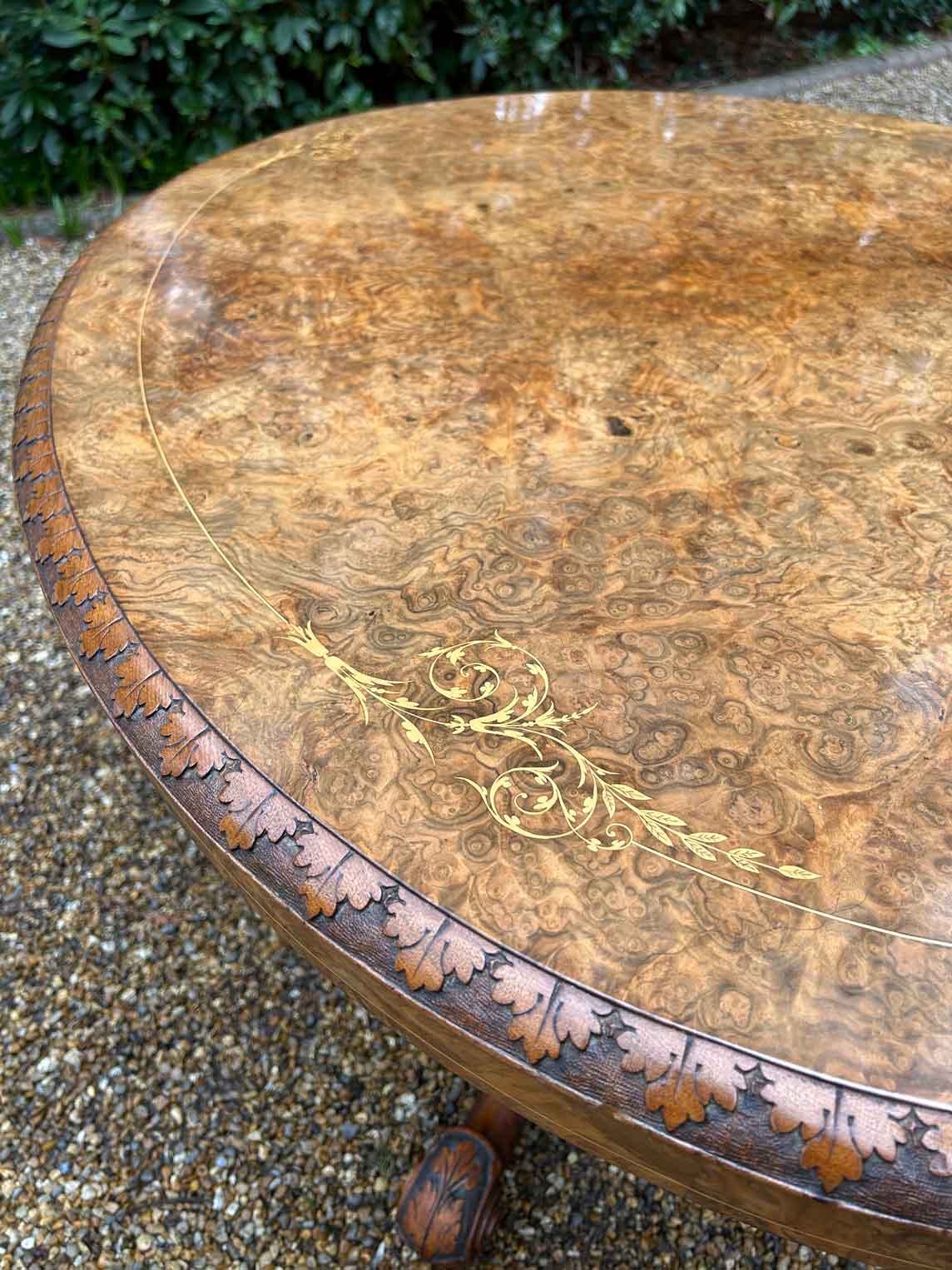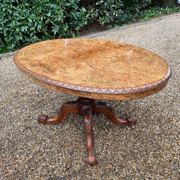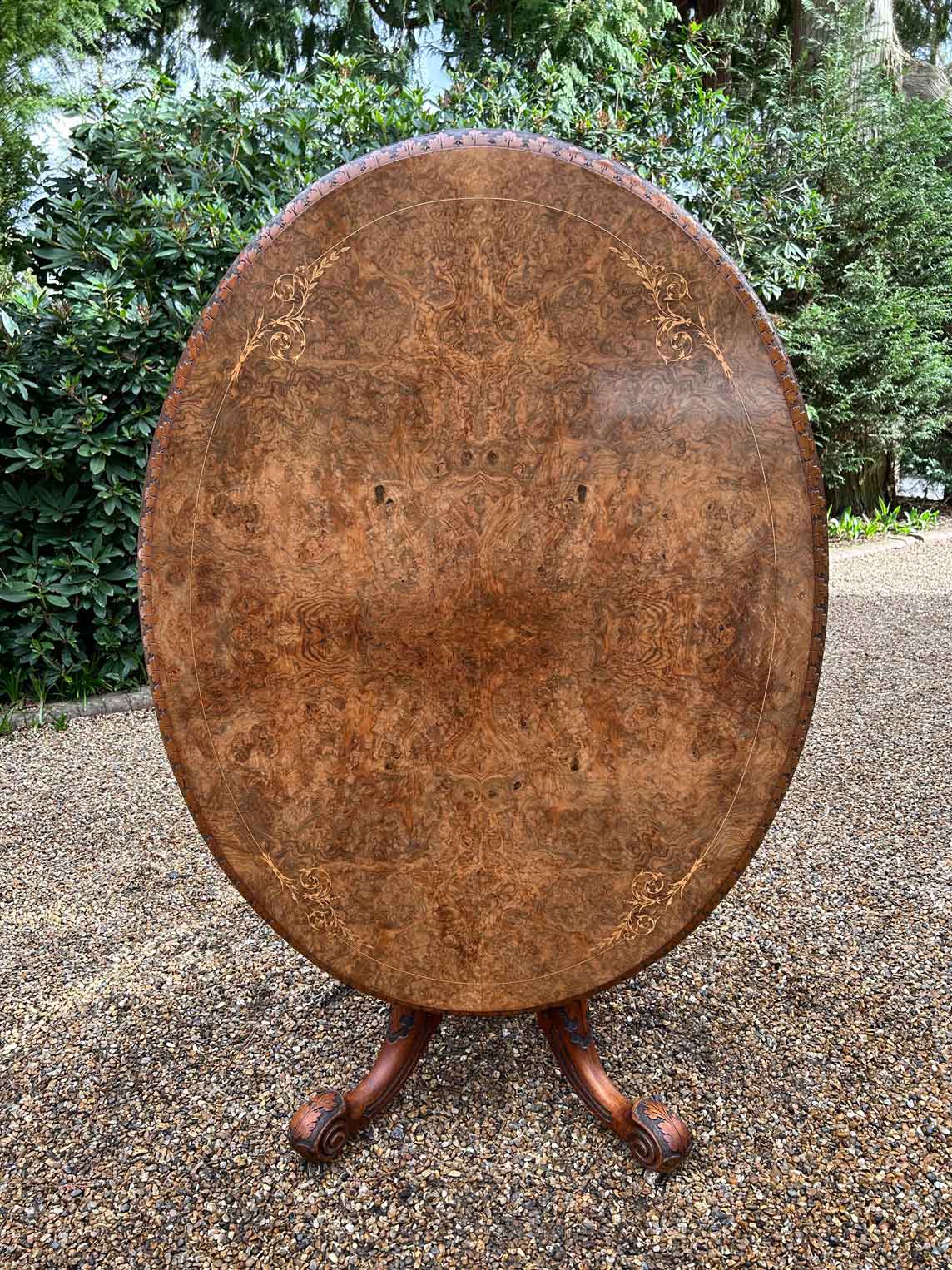19th Century Victorian Burr Walnut Oval Tilt-Top Dining Table with floral carved edging and inlaid decoration, raised on a turned and carved baluster column and four carved cabriole legs.