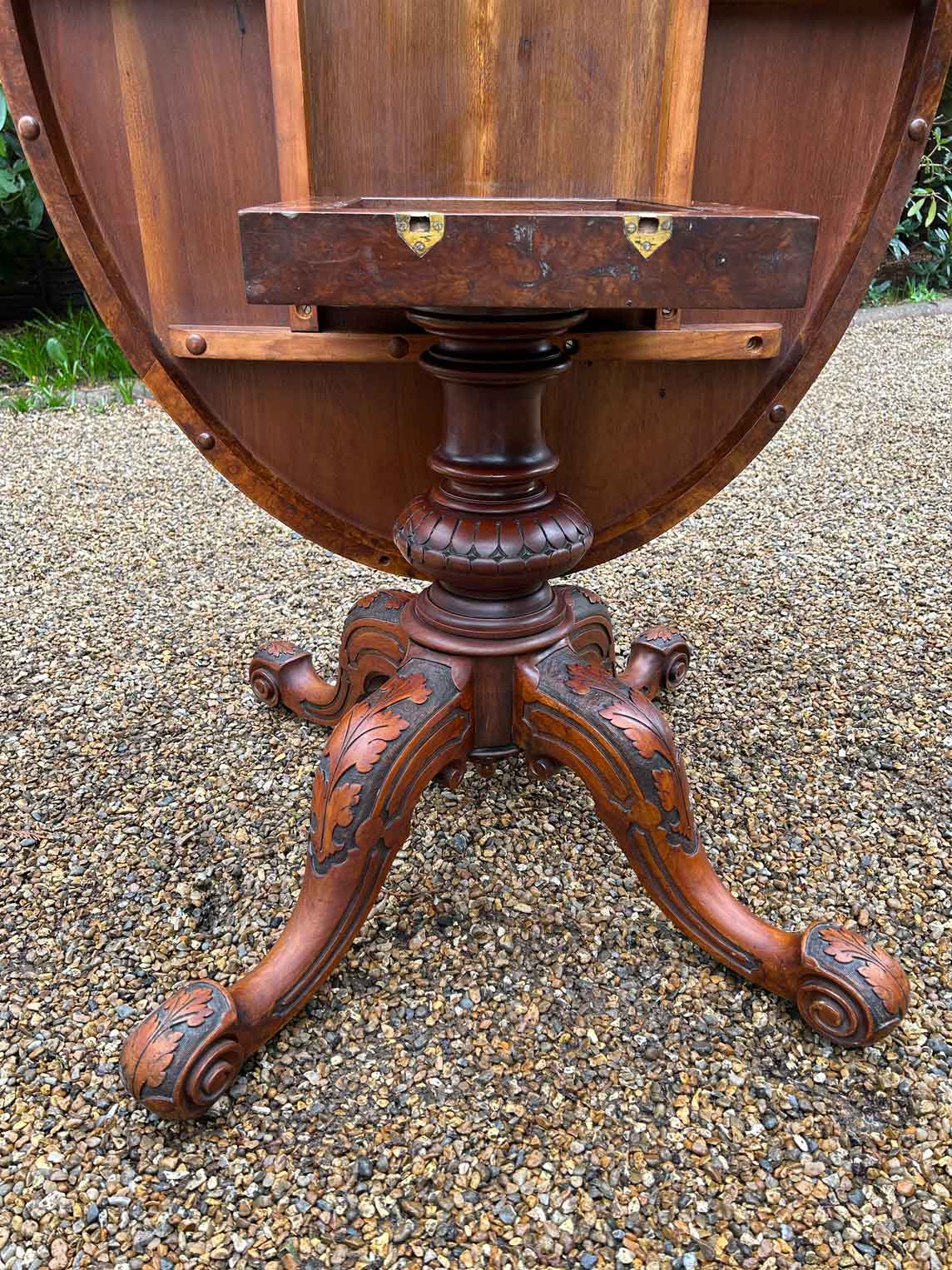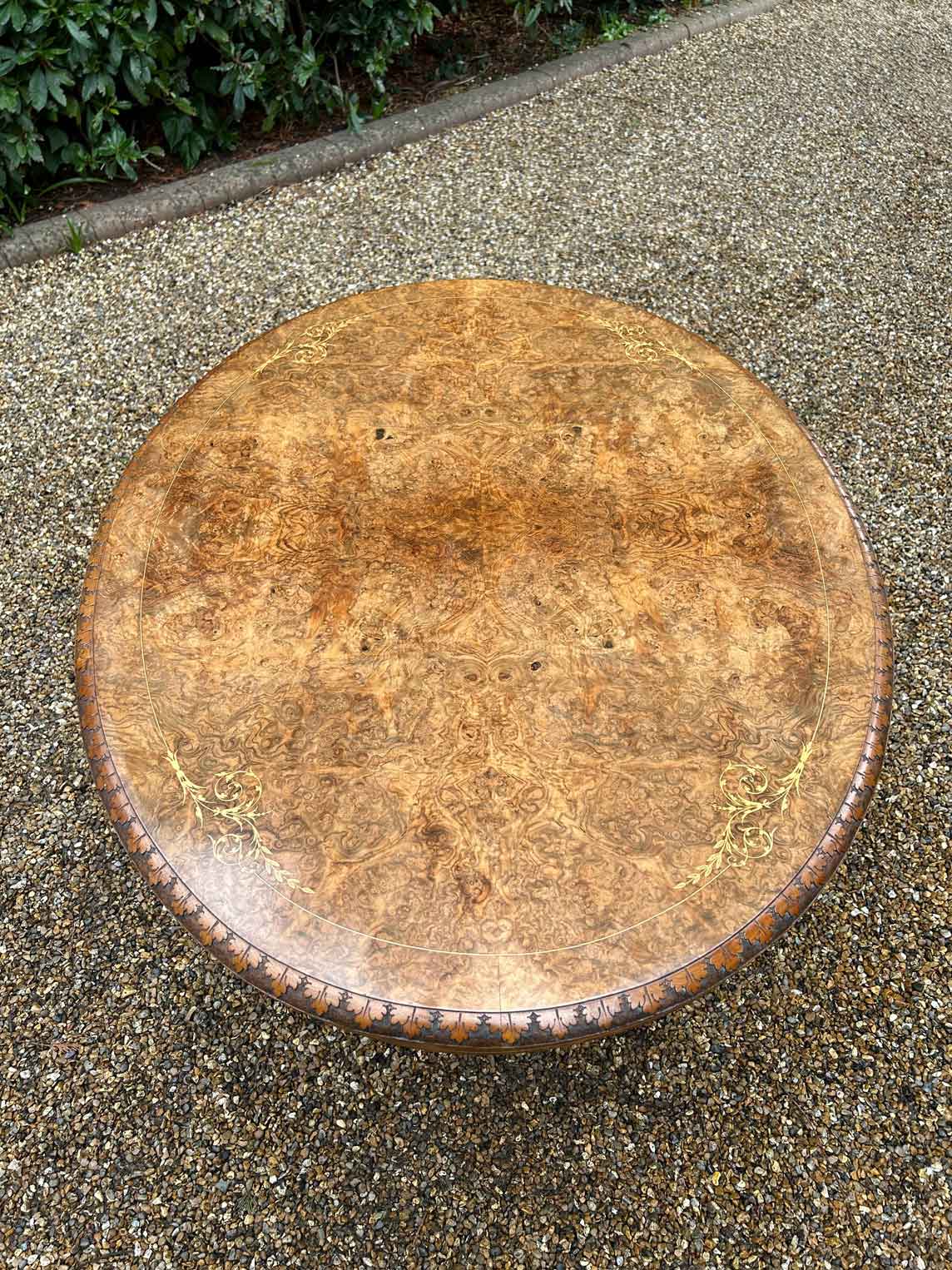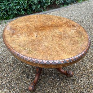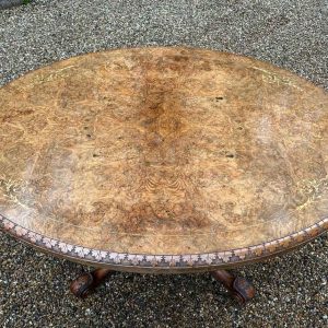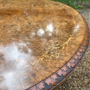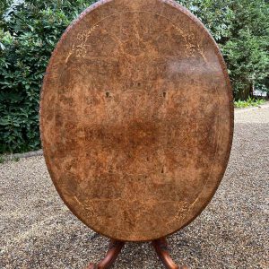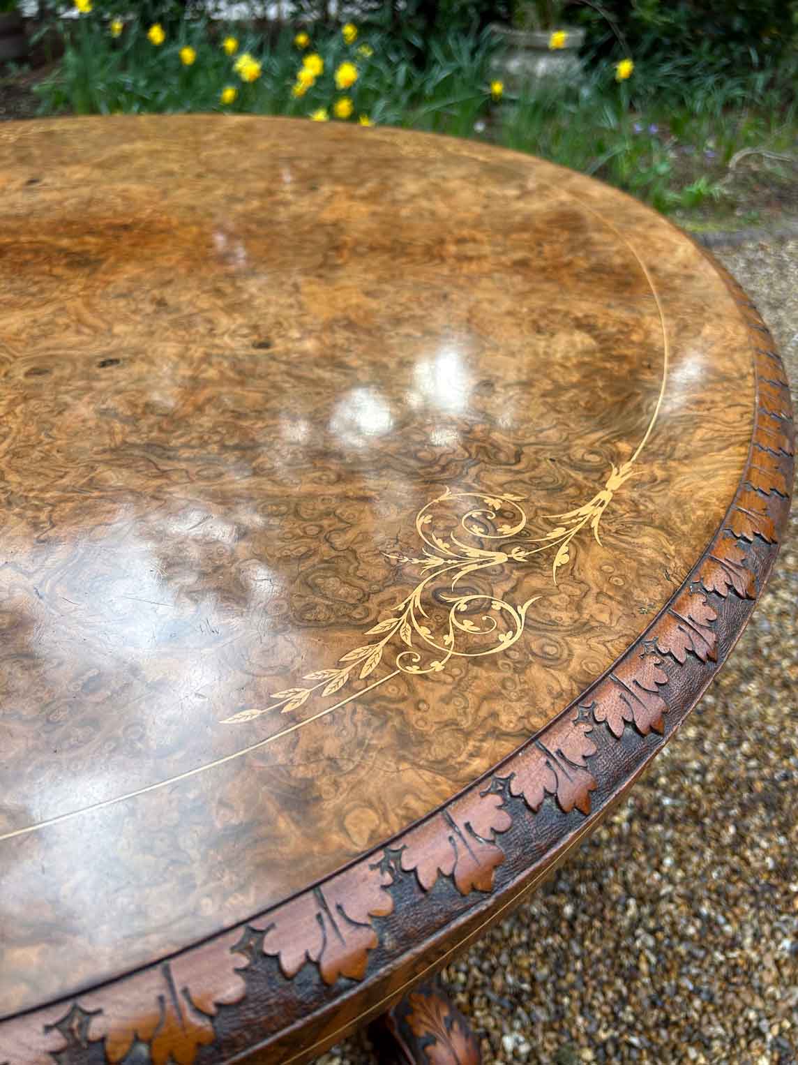 19th Century Victorian Burr Walnut Oval Tilt-Top Dining Table with floral carved edging and inlaid decoration, raised on a turned and carved baluster column and four carved cabriole legs.
