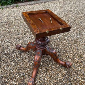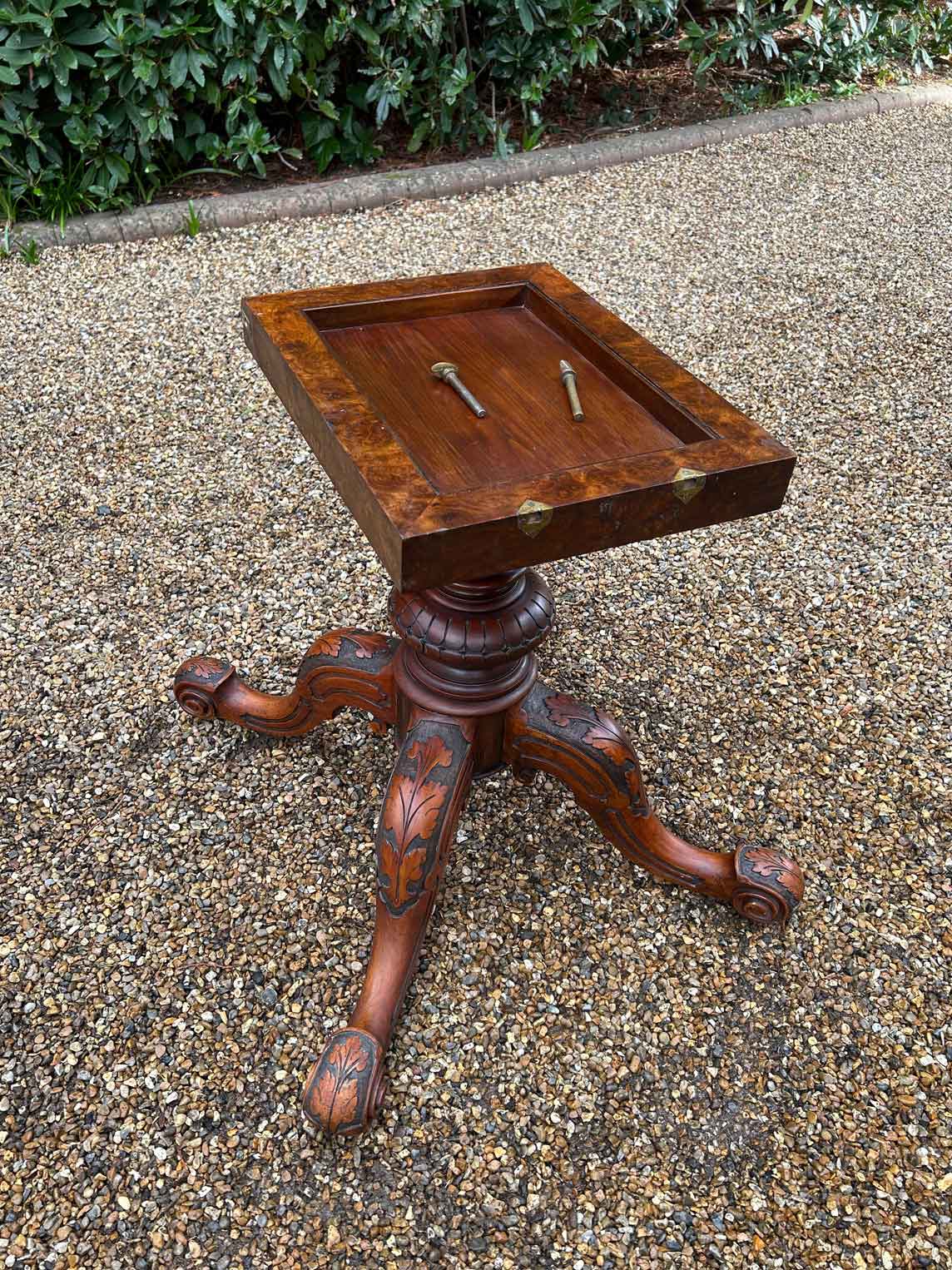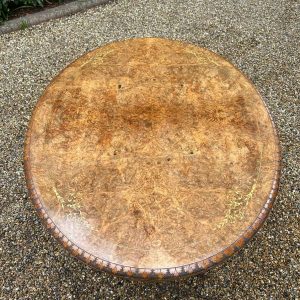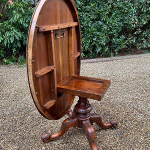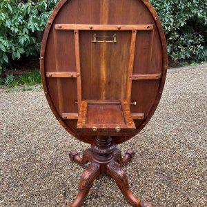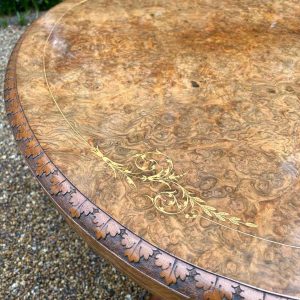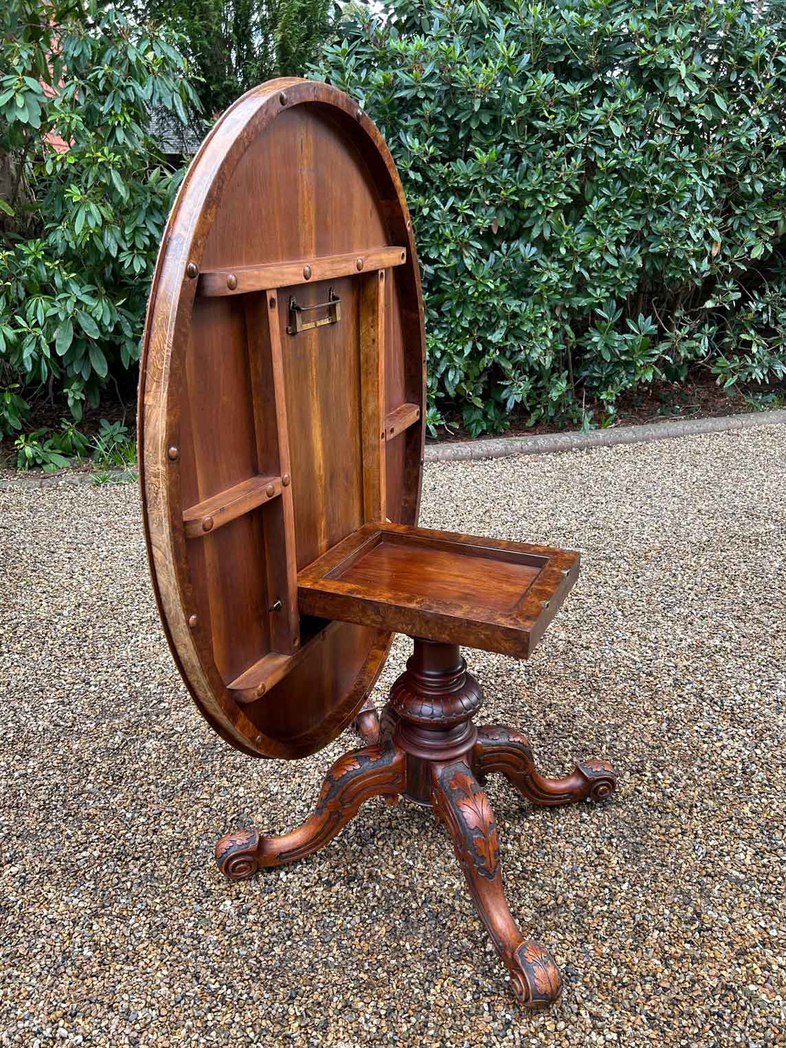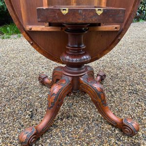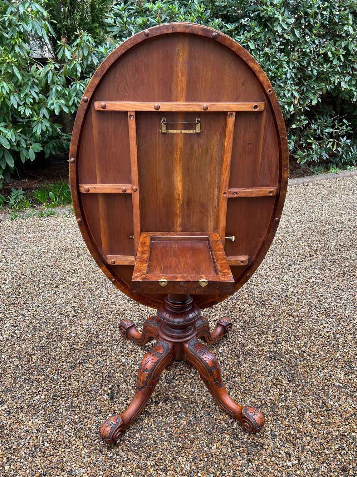 19th Century Victorian Burr Walnut Oval Tilt-Top Dining Table with floral carved edging and inlaid decoration, raised on a turned and carved baluster column and four carved cabriole legs.
