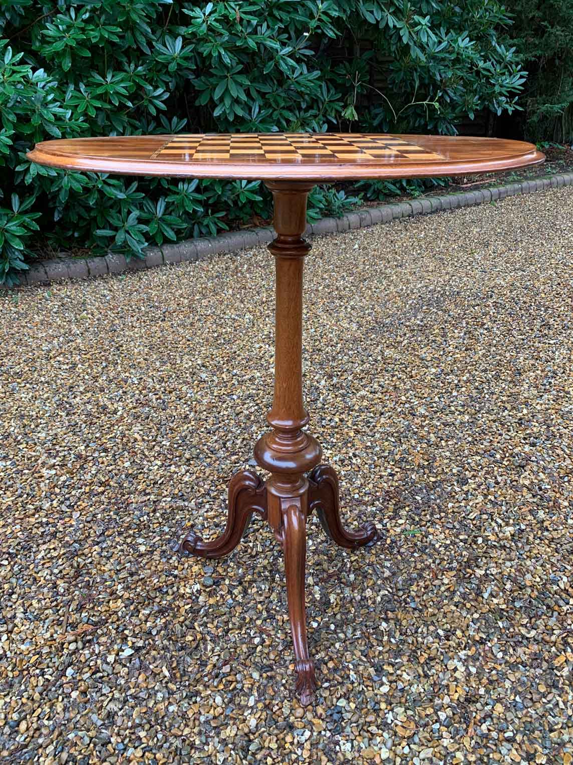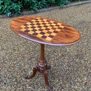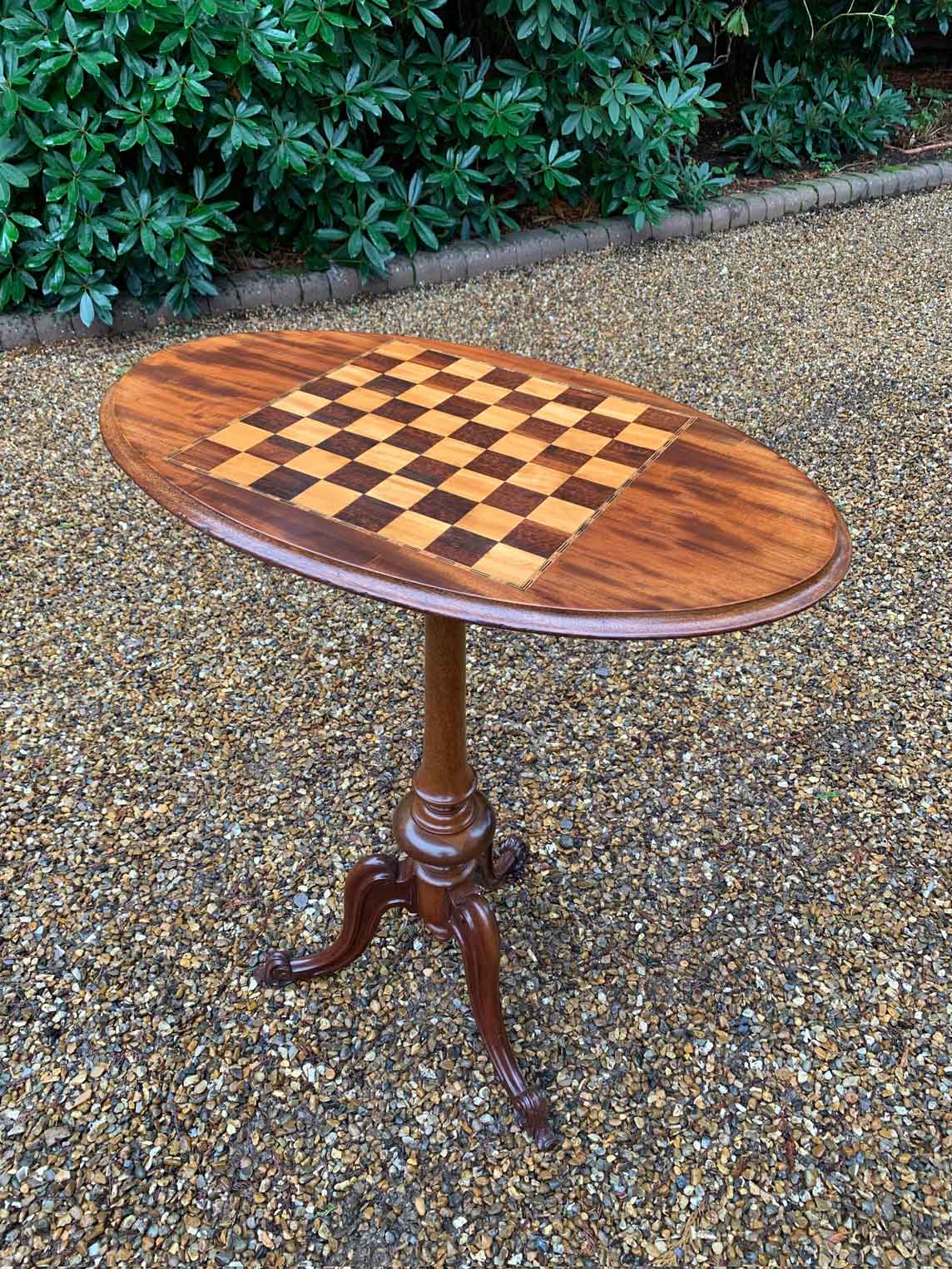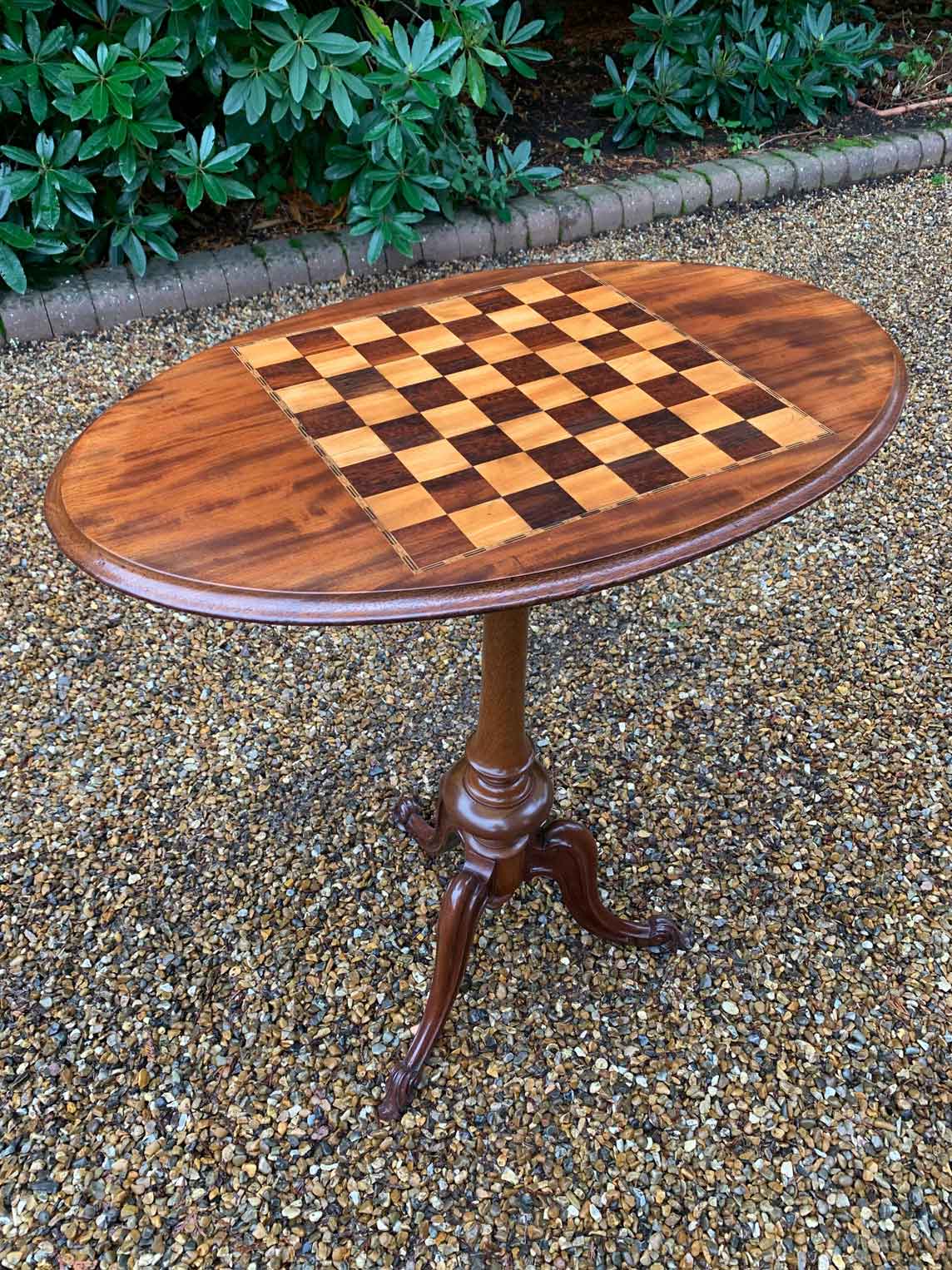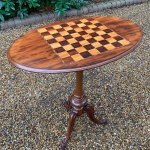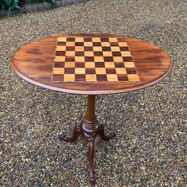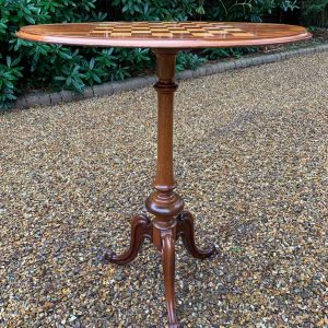 A beautiful Victorian Mahogany Oval Chess Table with an inlaid chequerboard top, raised on a turned column and three splayed feet.