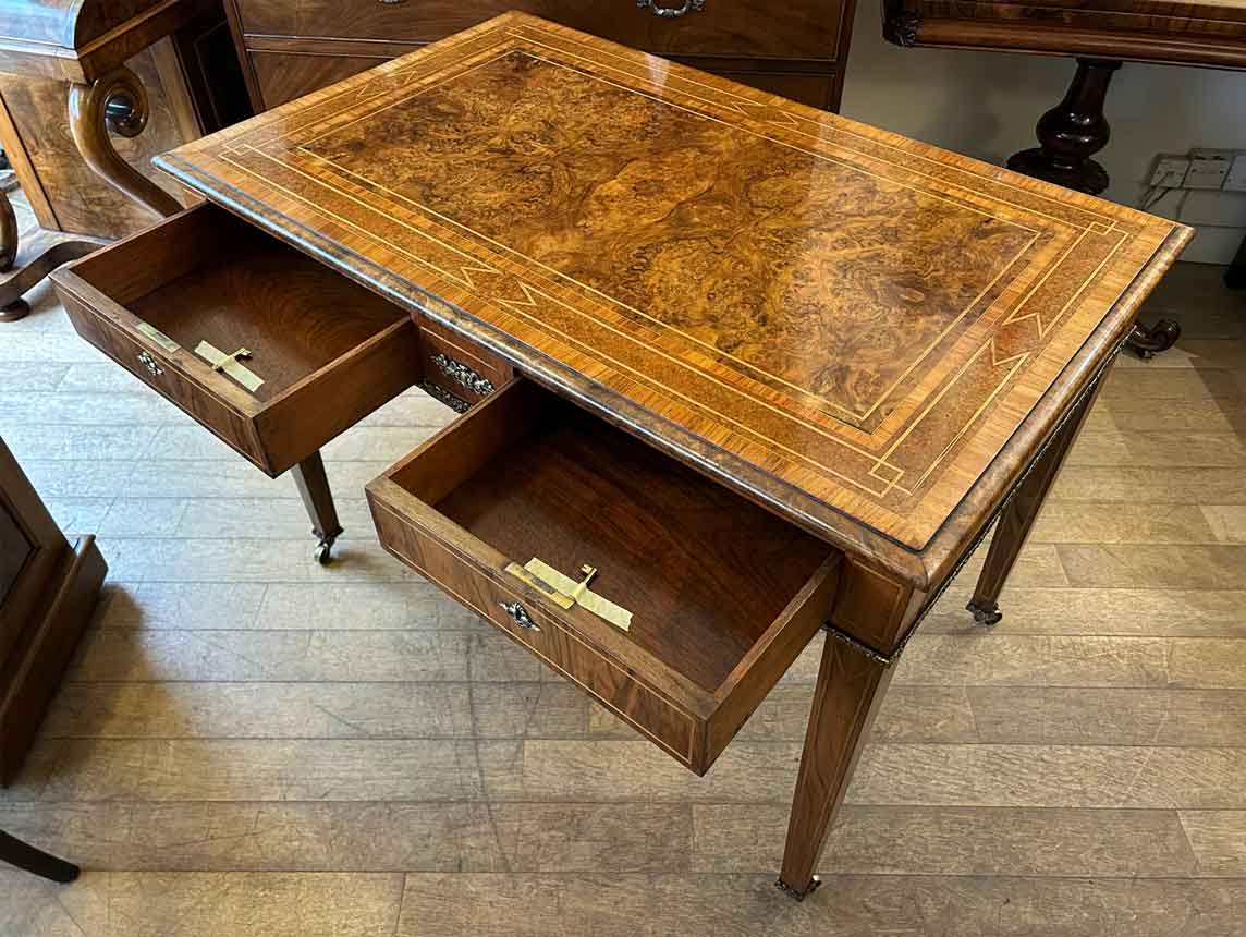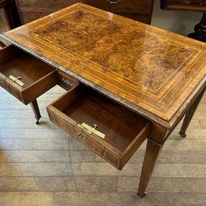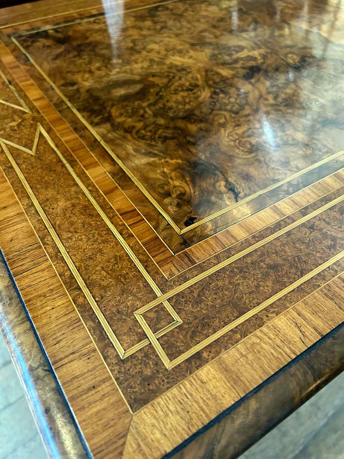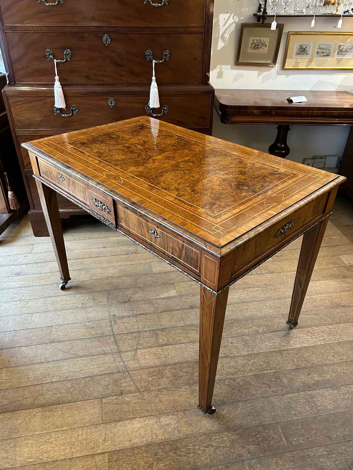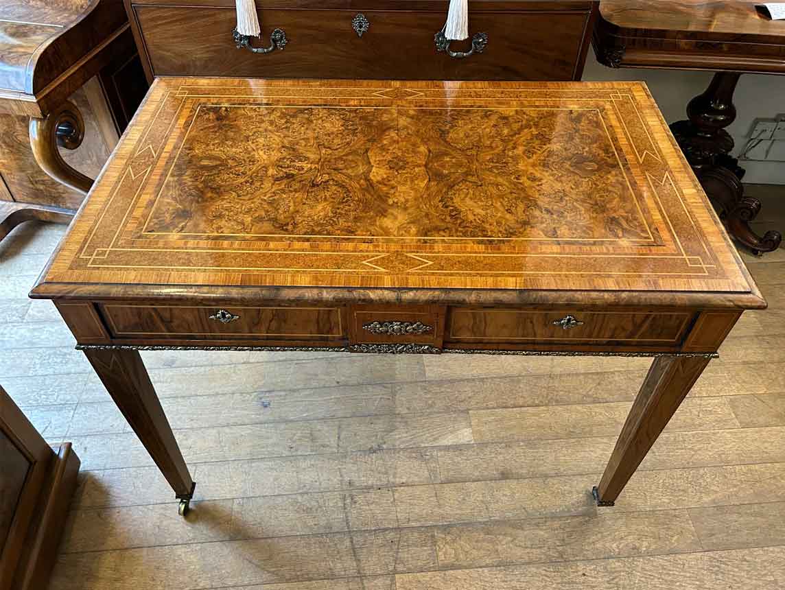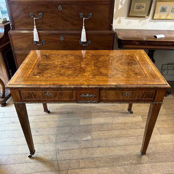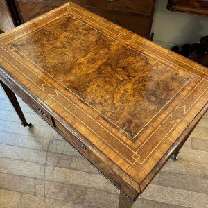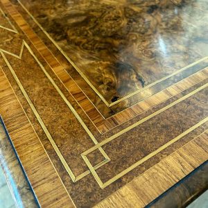 A very high quality 19th Century Victorian Walnut Library / Centre Table Table with a quarter veneered top, inlaid with burr walnut, amboyna, kingwood banding and stringing, fitted with ormolu & brass mounts and working keys. Above two hidden mahogany lined drawers, with dummy drawers to back, on square tapered inlaid legs ending in brass castors.