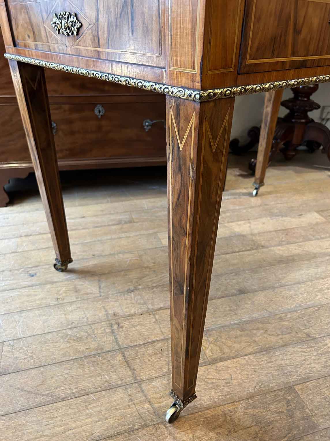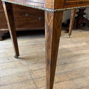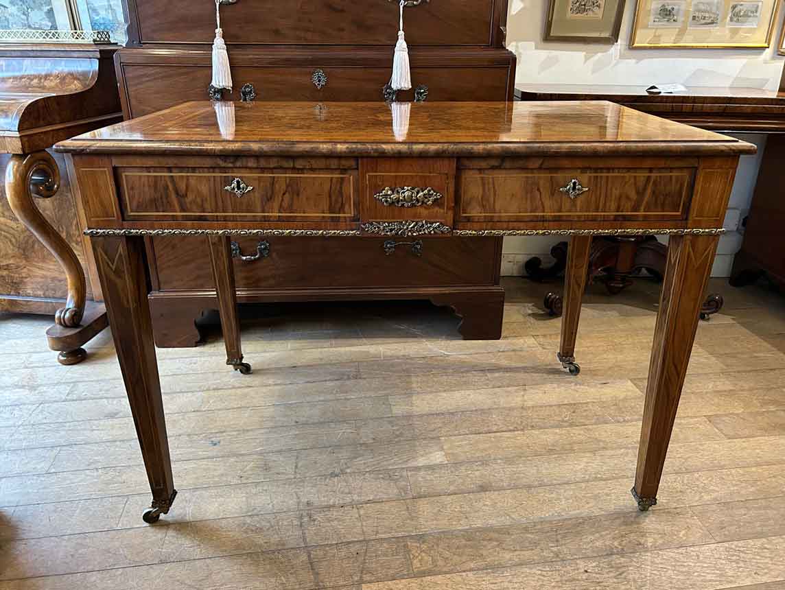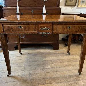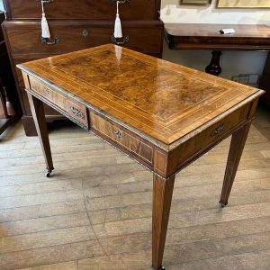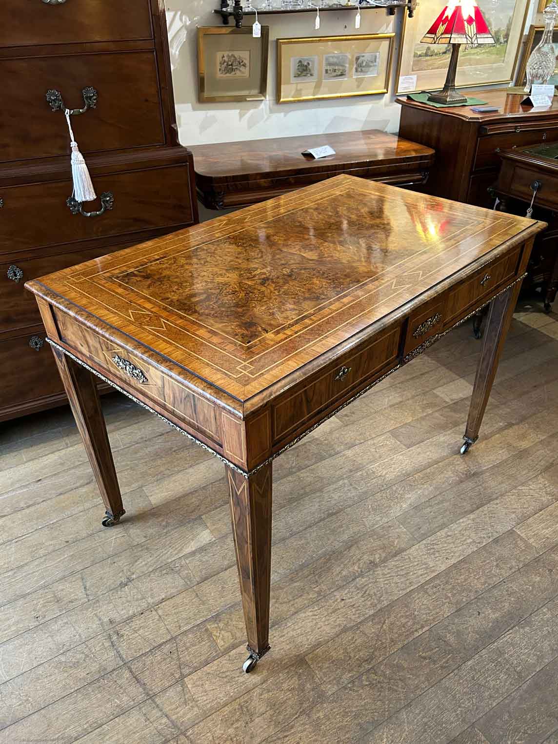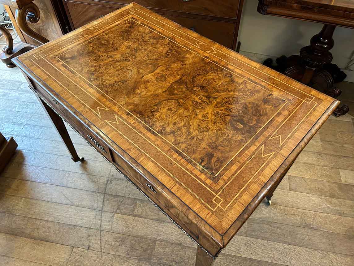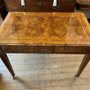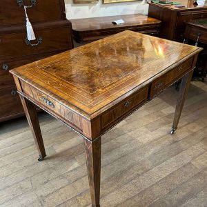 A very high quality 19th Century Victorian Walnut Library / Centre Table Table with a quarter veneered top, inlaid with burr walnut, amboyna, kingwood banding and stringing, fitted with ormolu & brass mounts and working keys. Above two hidden mahogany lined drawers, with dummy drawers to back, on square tapered inlaid legs ending in brass castors.