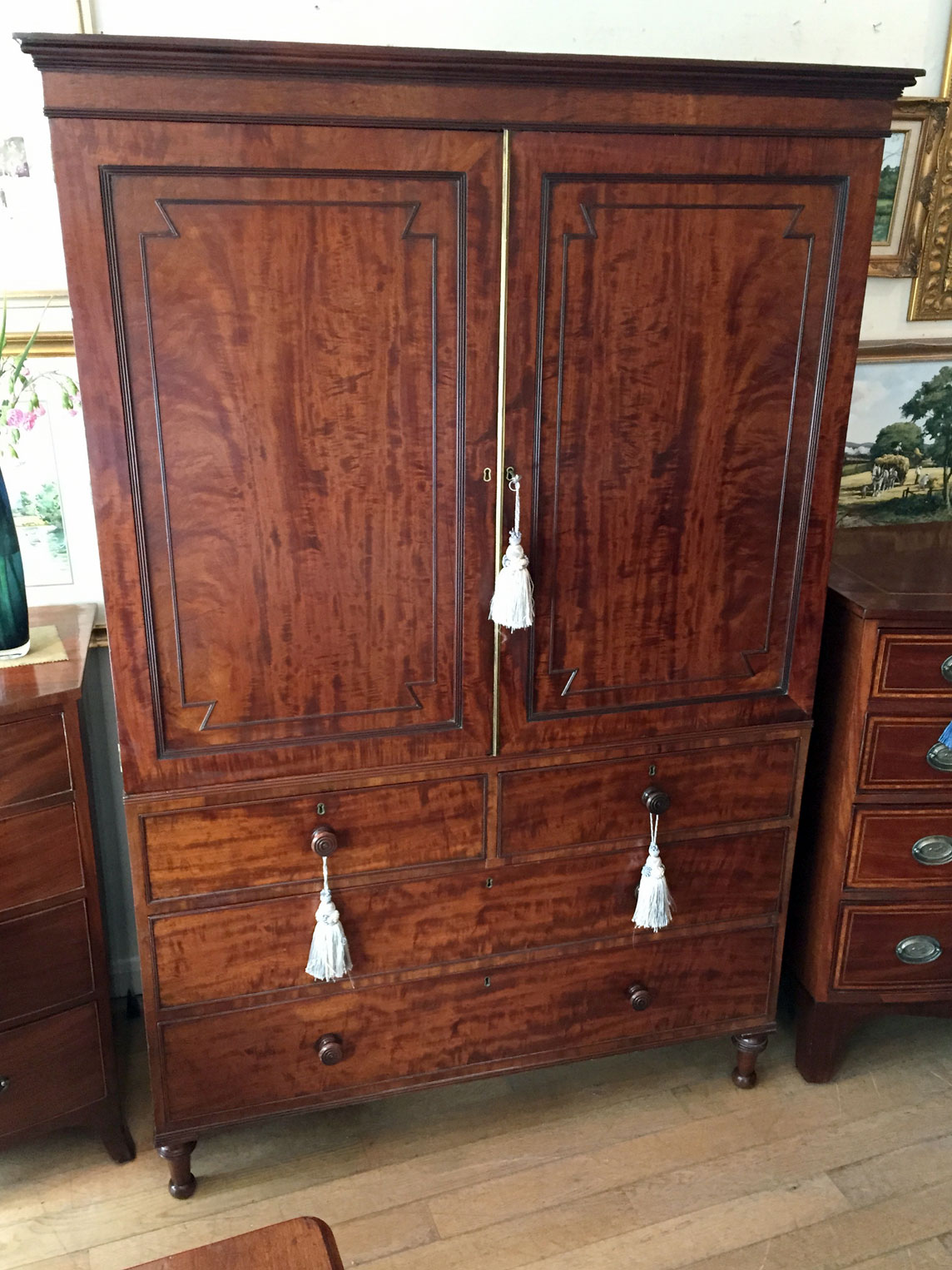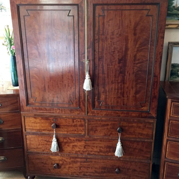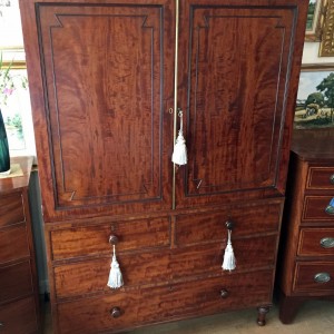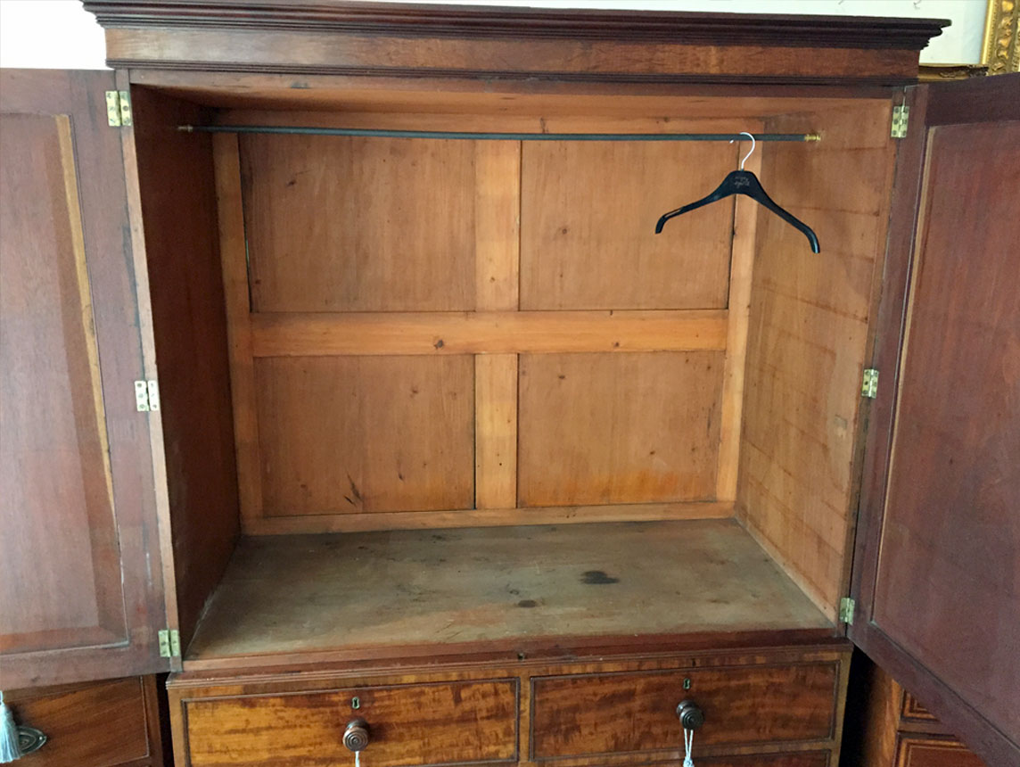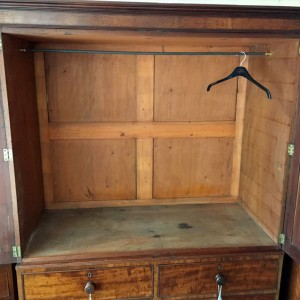 19th Century Mahogany Linen Press with hanging space and pole. Two short and two long solid mahogany drawers with original bun handles on turned feet. Comes apart in two separate sections. Solid Oak lined drawers