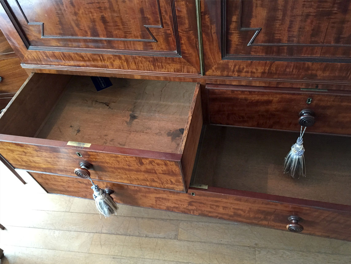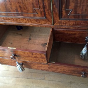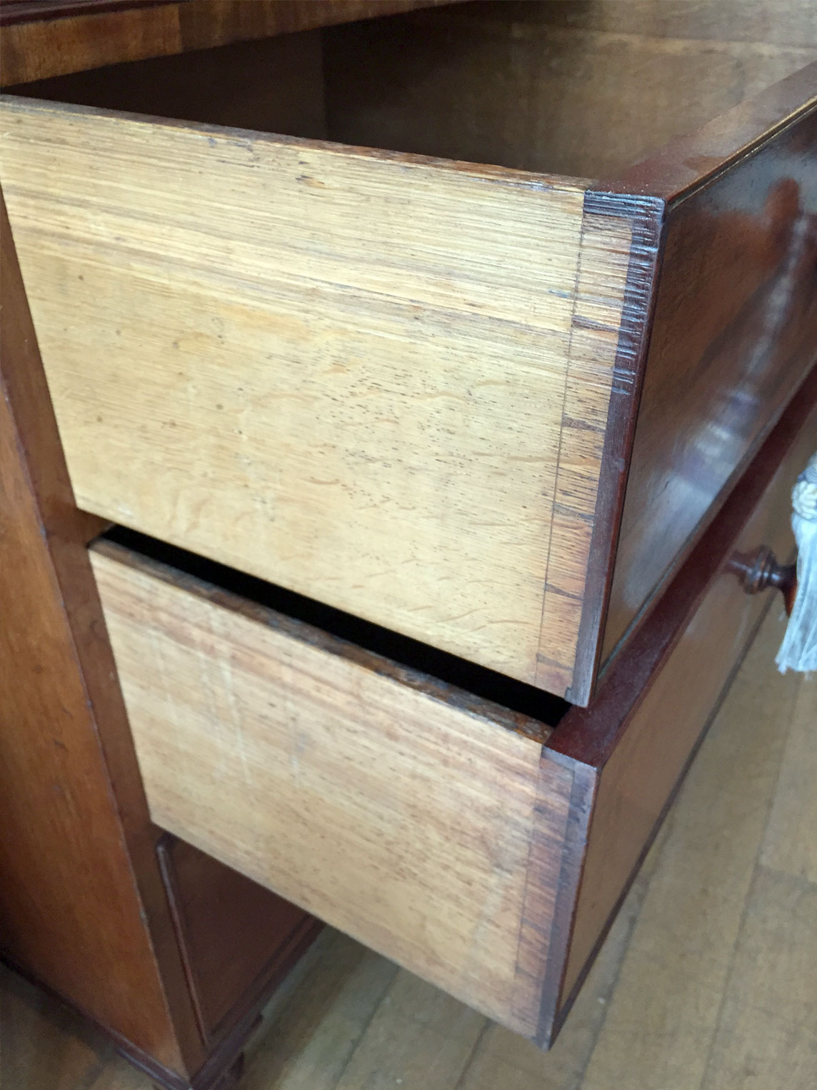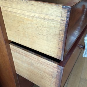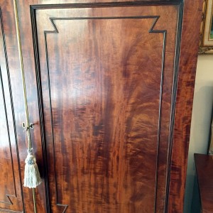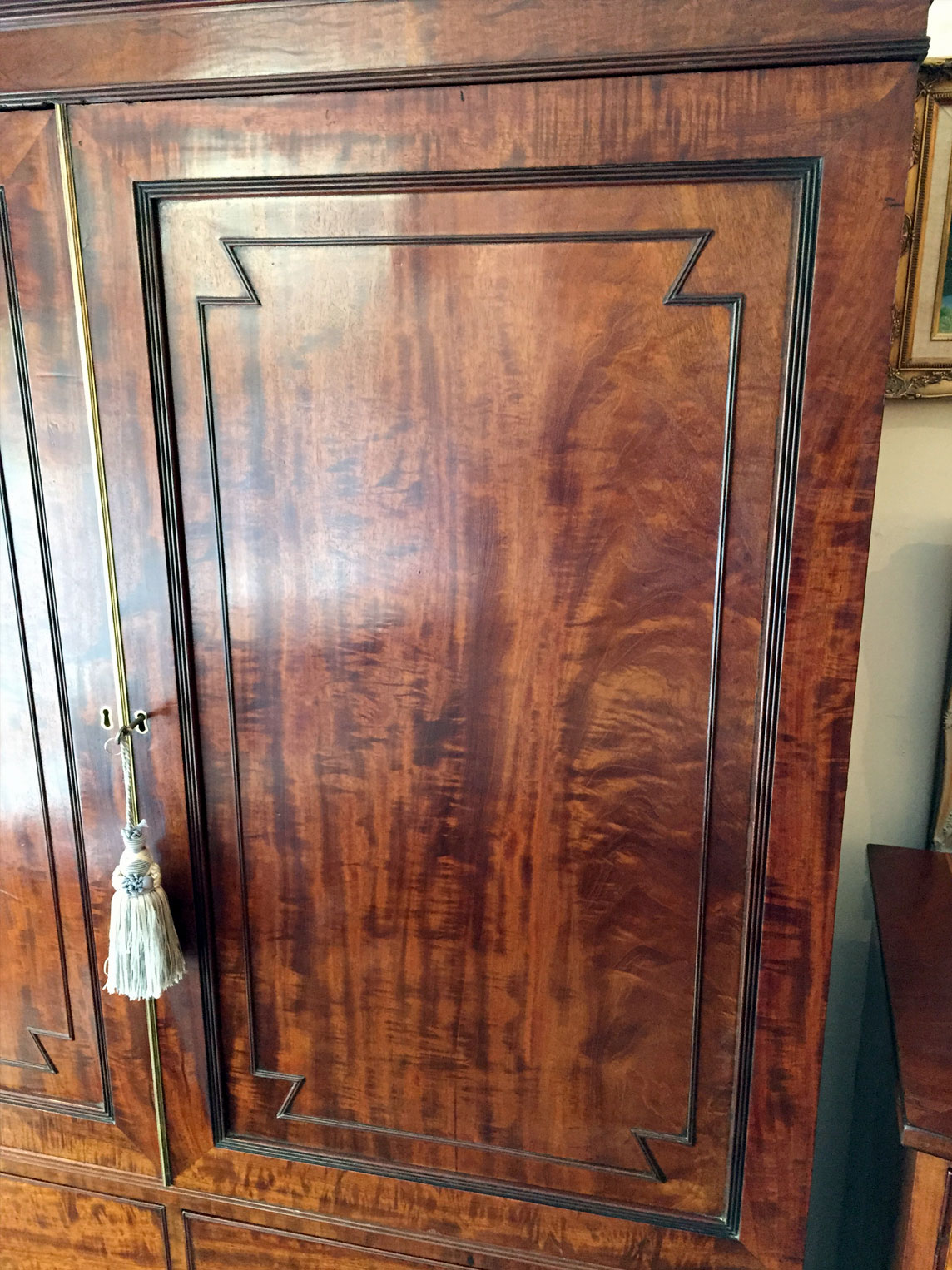 19th Century Mahogany Linen Press with hanging space and pole. Two short and two long solid mahogany drawers with original bun handles on turned feet. Comes apart in two separate sections. Solid Oak lined drawers