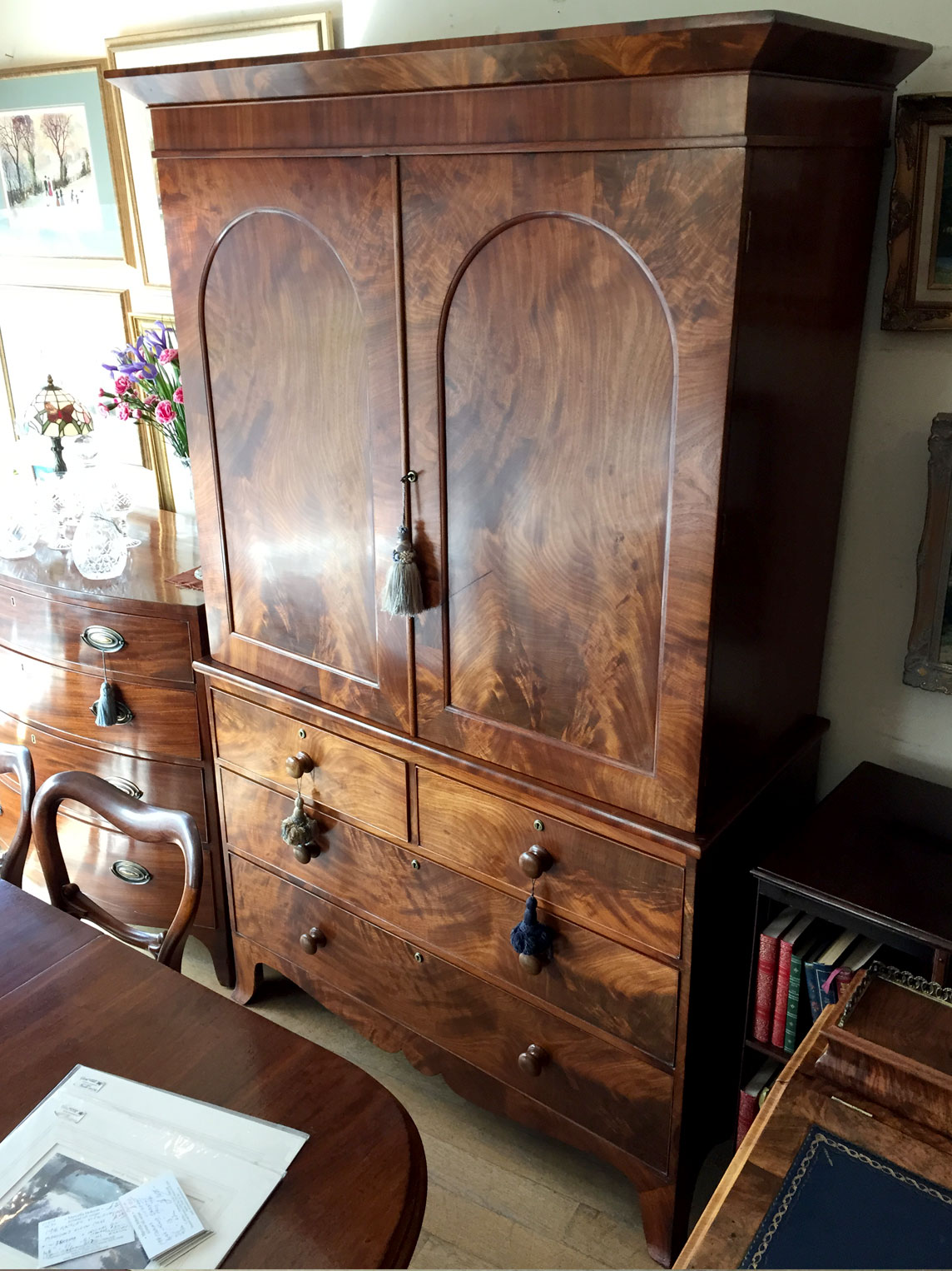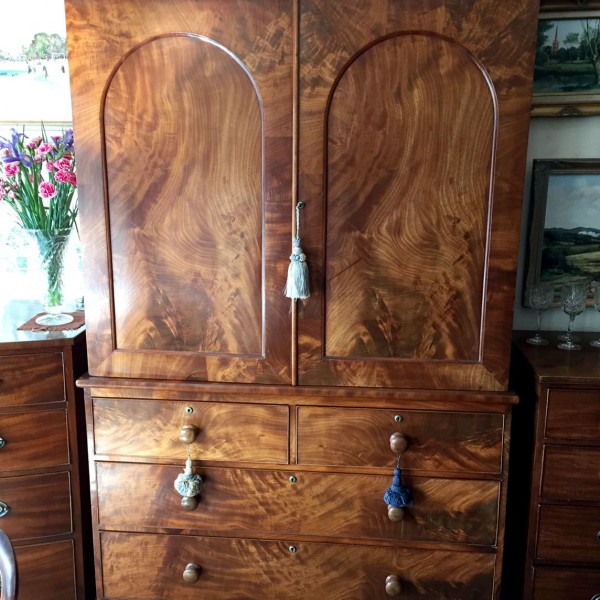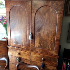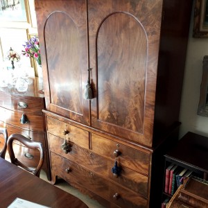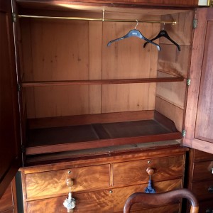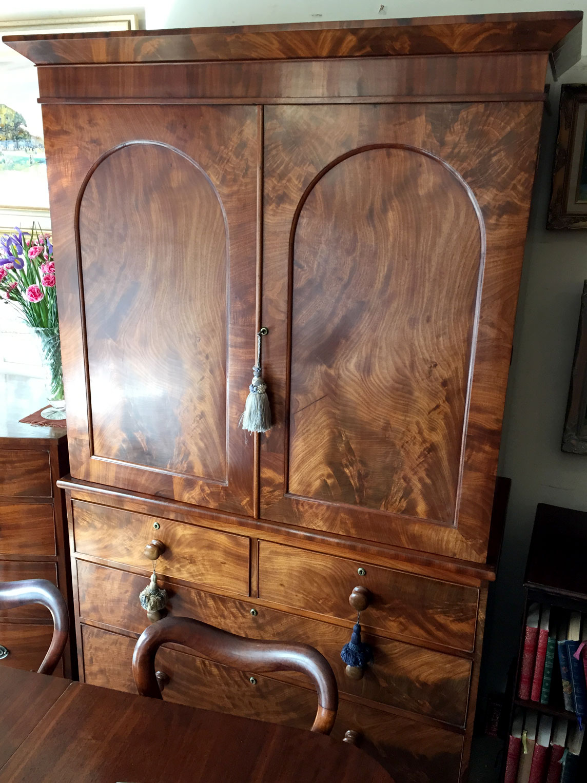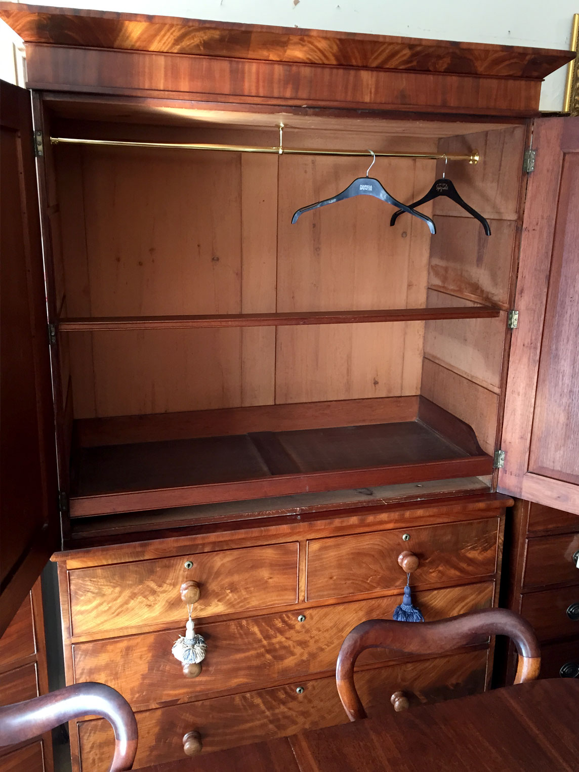 19th Century Victorian Golden Mahogany Linen Press with one sliding tray and hanging space with brass pole. Two short and two long solid mahogany drawers with original bun handles on splayed feet. Comes apart in three separate sections.