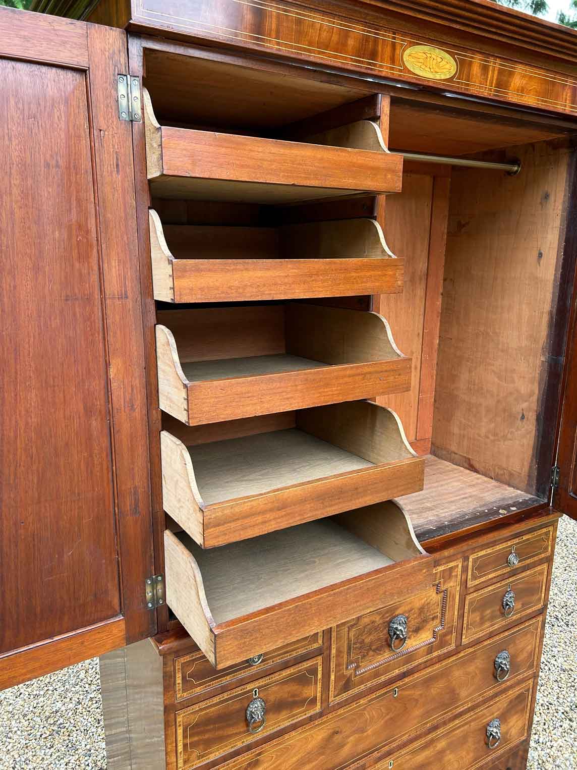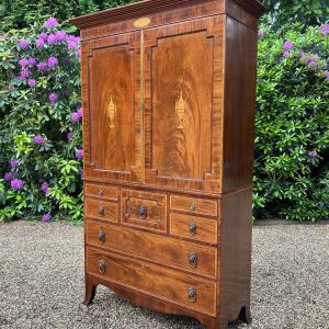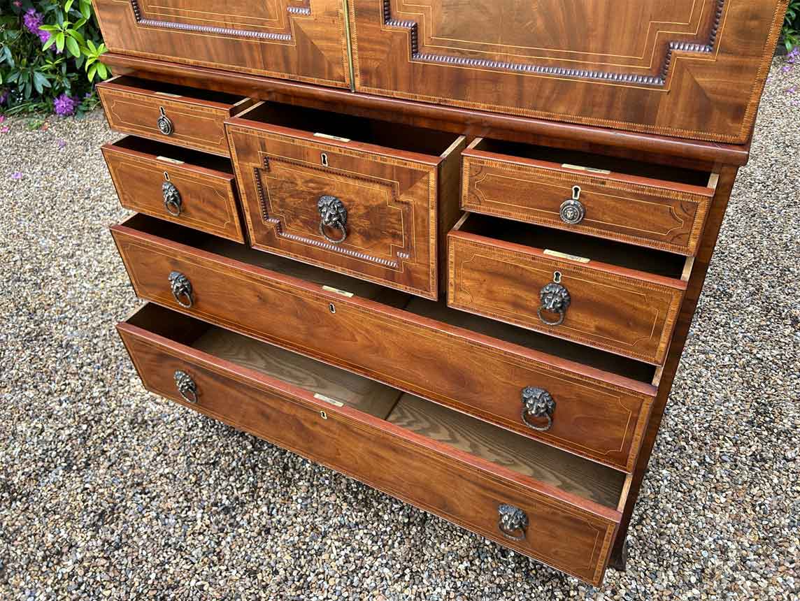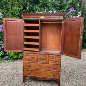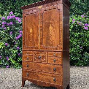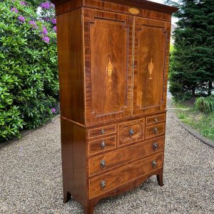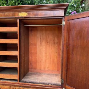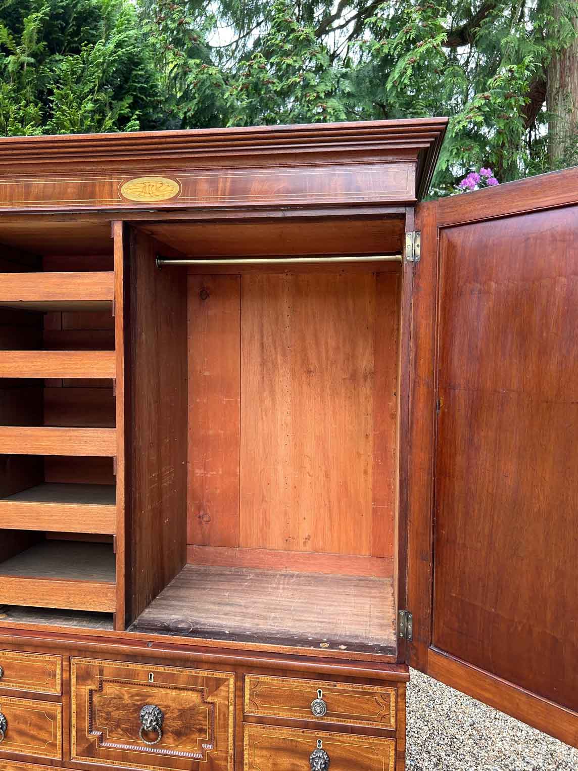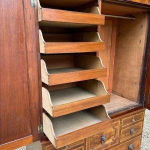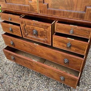 19th Century Victorian Mahogany Linen Press with turned carved edging and satinwood cross banding / inlay throughout. Inside the two cupboard doors has a fitted interior with five original sliding tray on the left side and a brass pole for hanging space on the right side. Below has a central deep drawer, two small drawers to each side, and two long solid oak lined drawers with original brass lion handles on splayed feet. Comes apart in three separate sections.