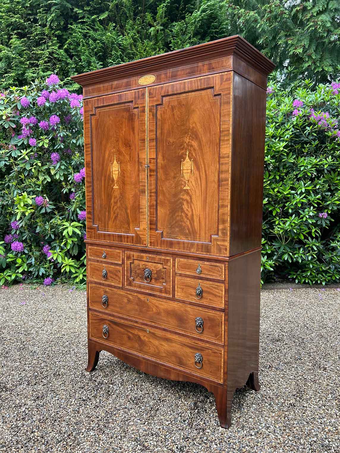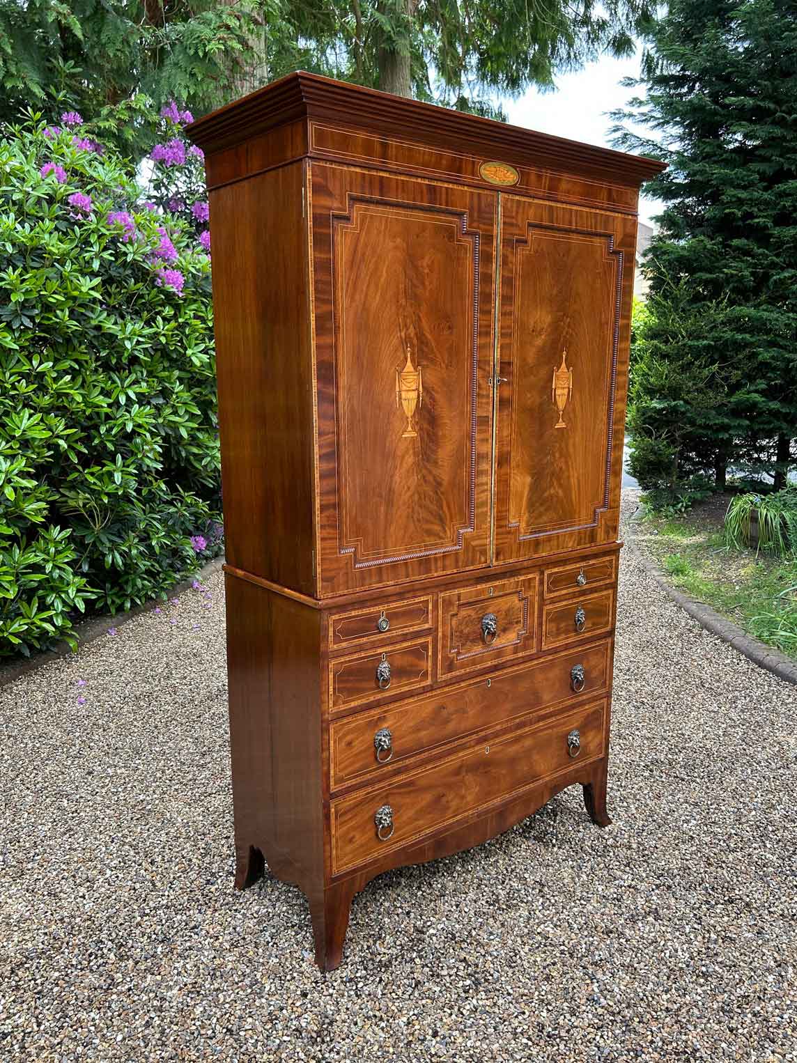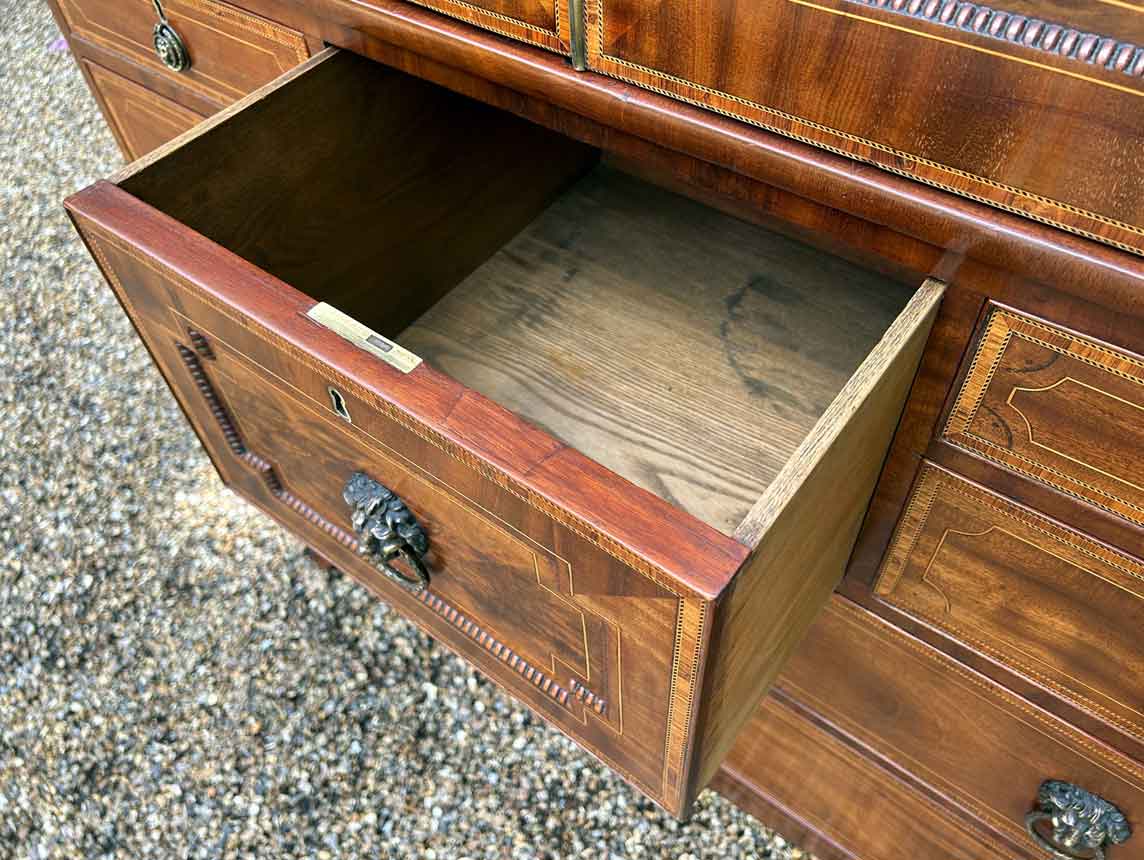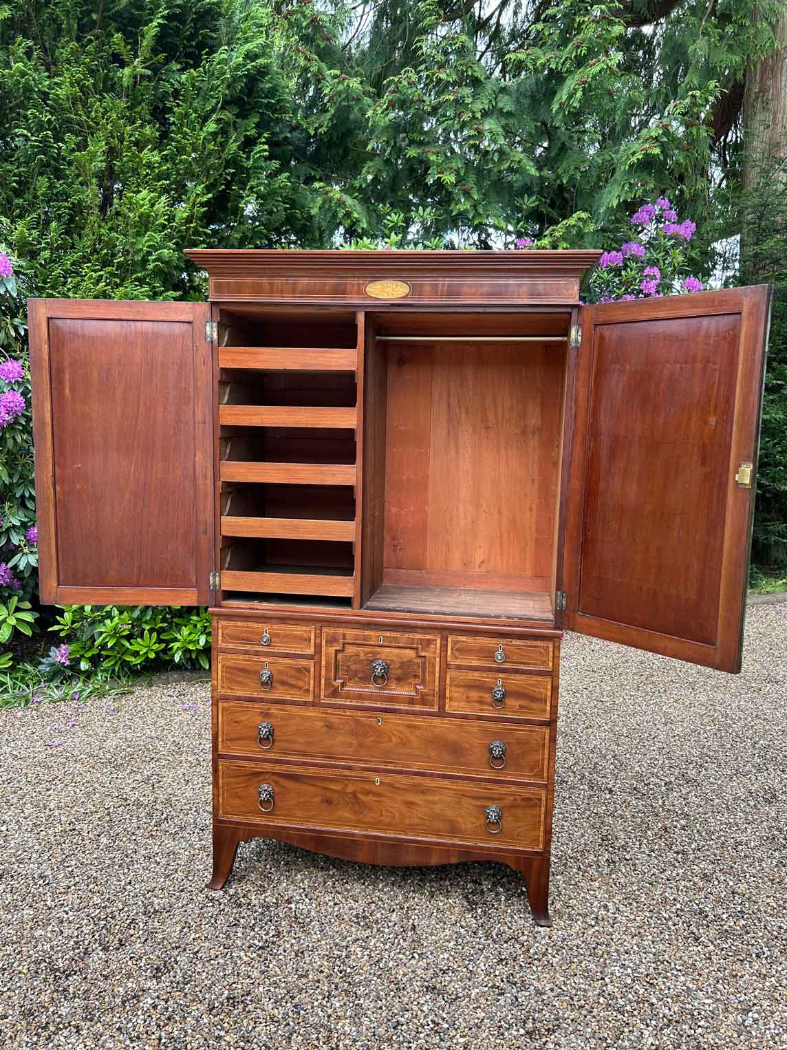 19th Century Victorian Mahogany Linen Press with turned carved edging and satinwood cross banding / inlay throughout. Inside the two cupboard doors has a fitted interior with five original sliding tray on the left side and a brass pole for hanging space on the right side. Below has a central deep drawer, two small drawers to each side, and two long solid oak lined drawers with original brass lion handles on splayed feet. Comes apart in three separate sections.