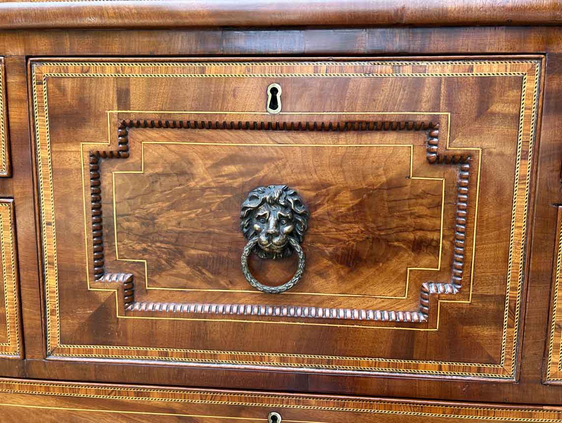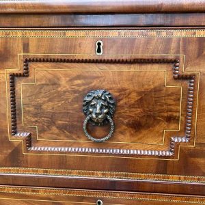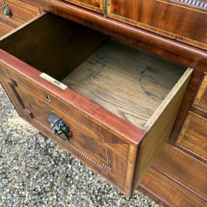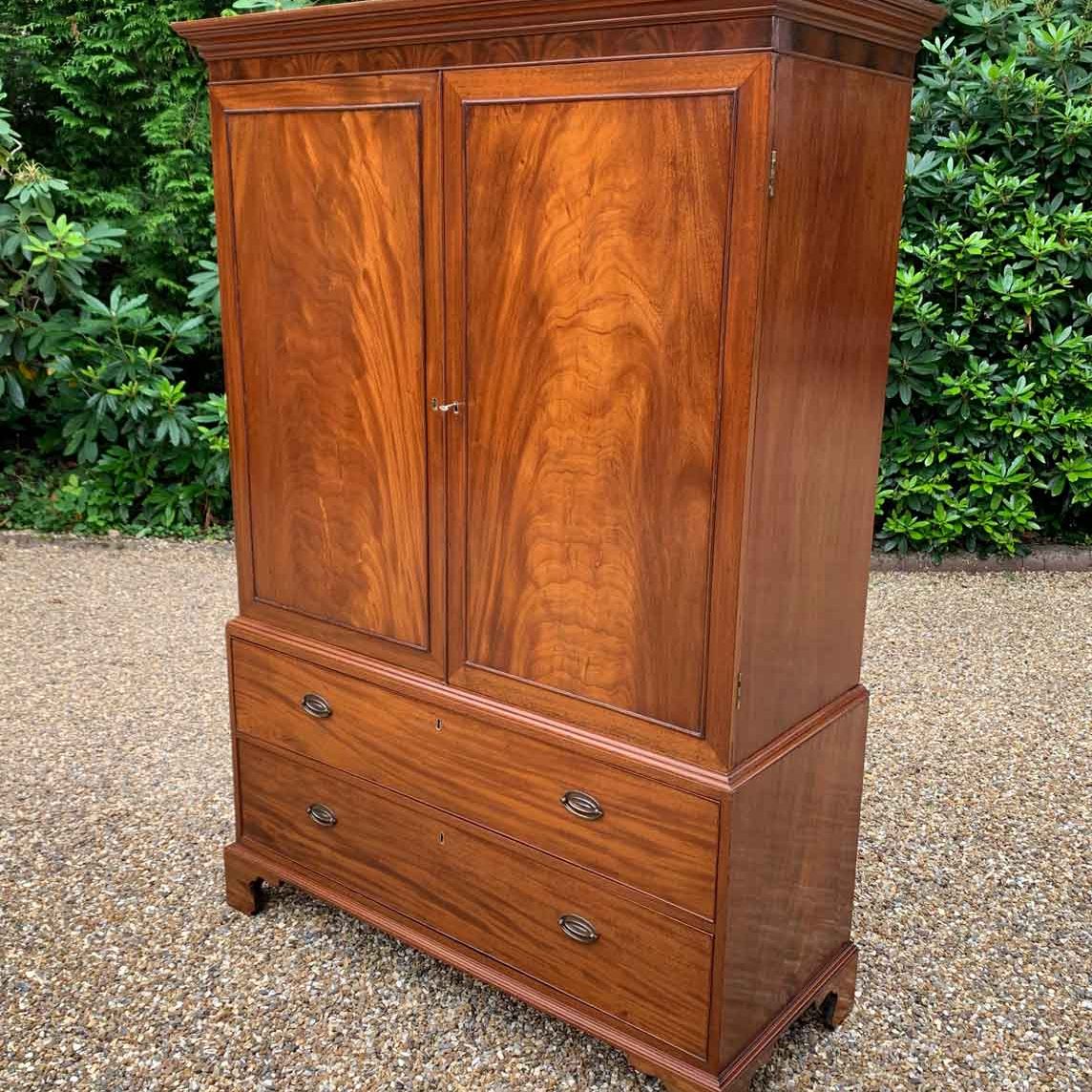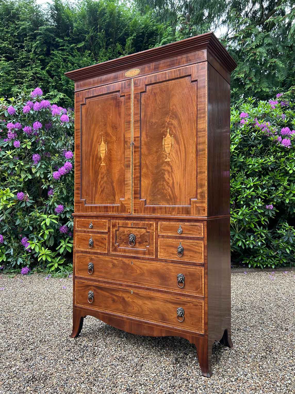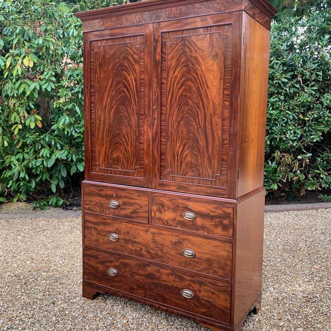 19th Century Victorian Mahogany Linen Press with turned carved edging and satinwood cross banding / inlay throughout. Inside the two cupboard doors has a fitted interior with five original sliding tray on the left side and a brass pole for hanging space on the right side. Below has a central deep drawer, two small drawers to each side, and two long solid oak lined drawers with original brass lion handles on splayed feet. Comes apart in three separate sections.