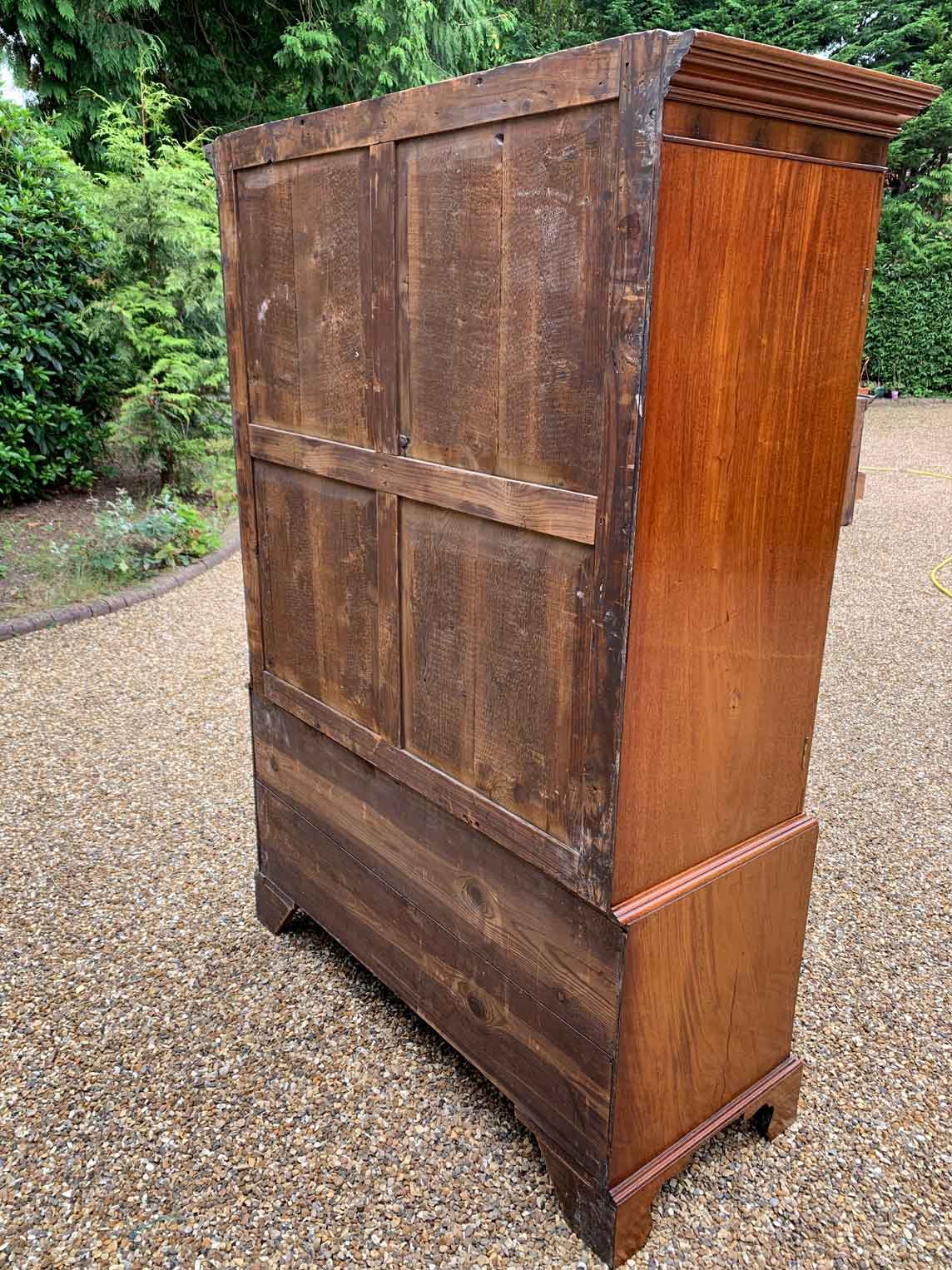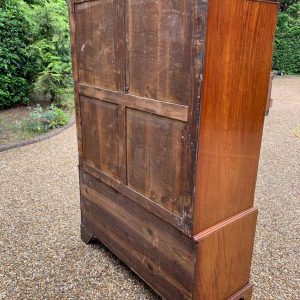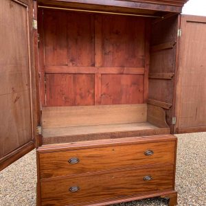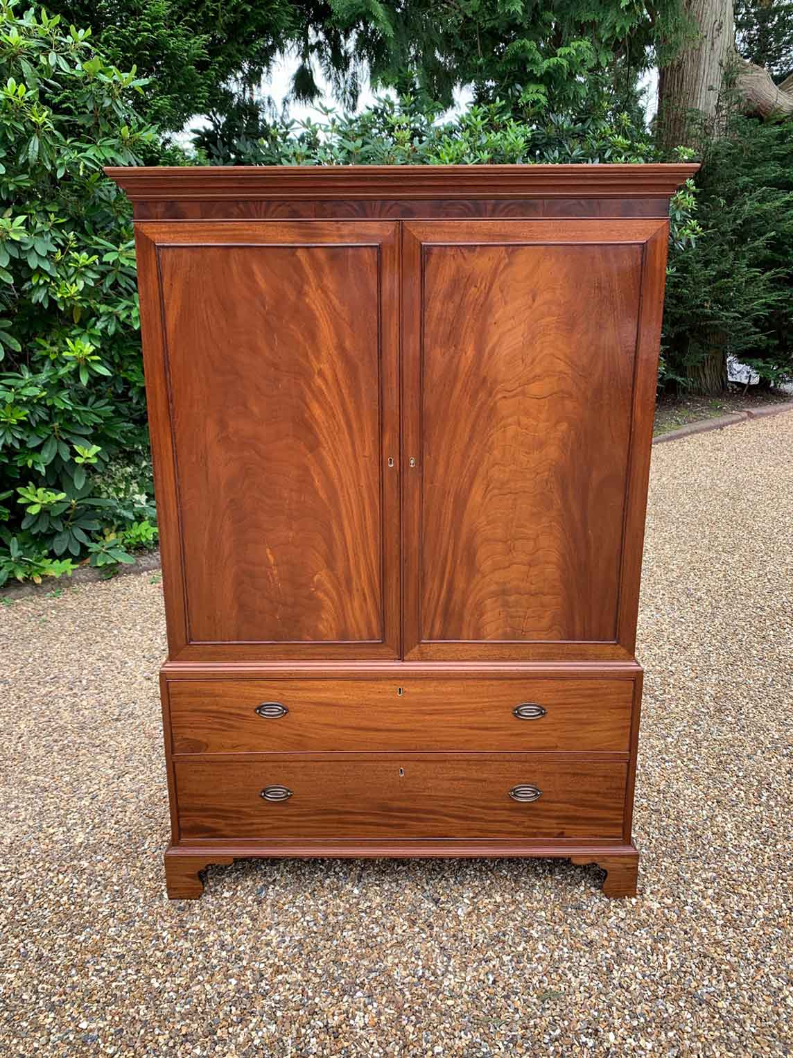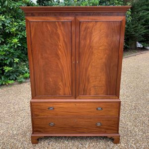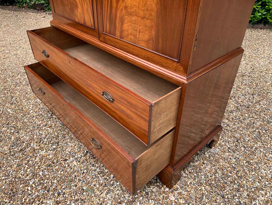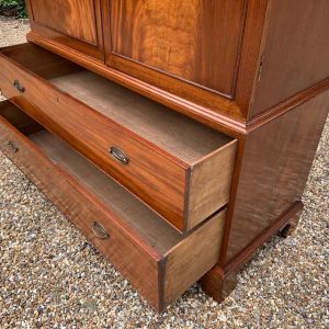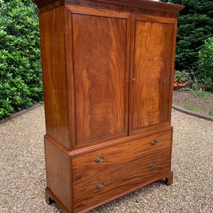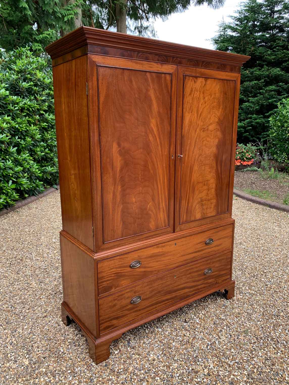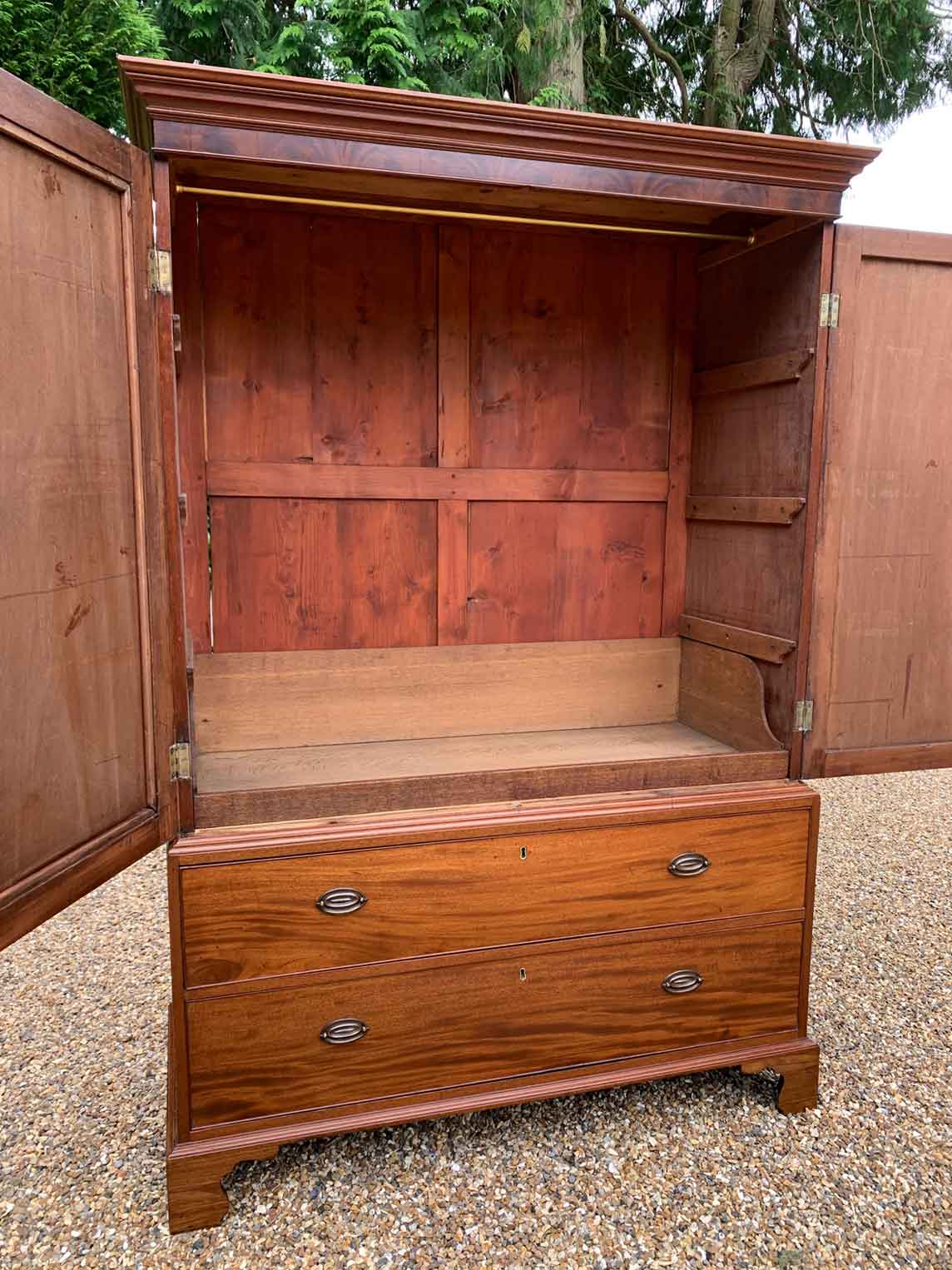 19th Century Georgian Mahogany Linen Press. The inside is fitted with one original sliding tray and a brass pole for hanging space. Below has two long solid oak lined drawers with original brass oval handles on bracket feet. Comes apart in two separate sections.