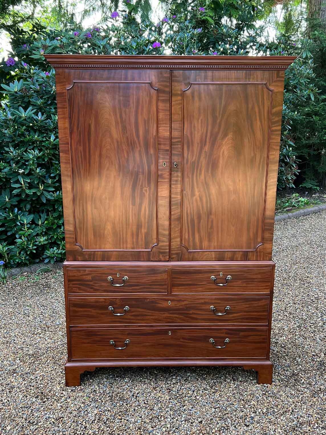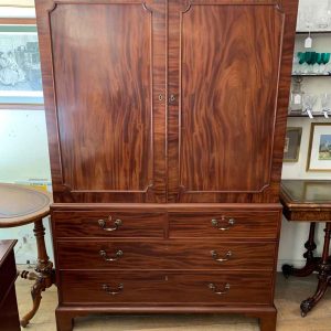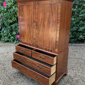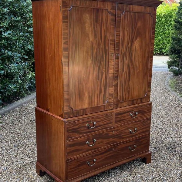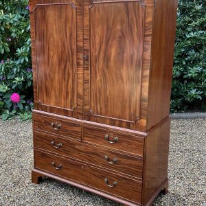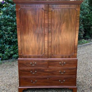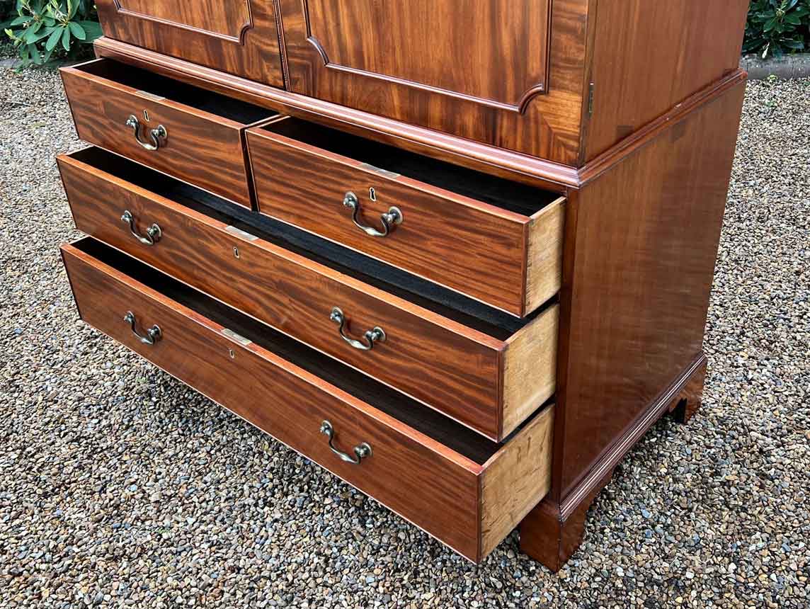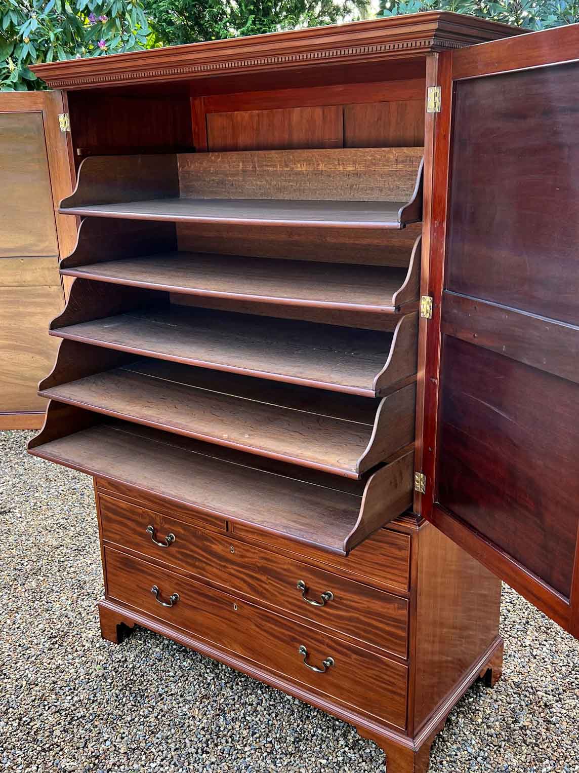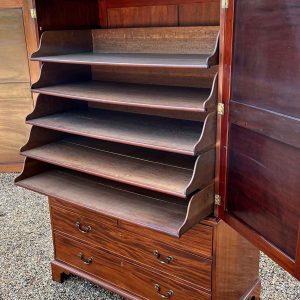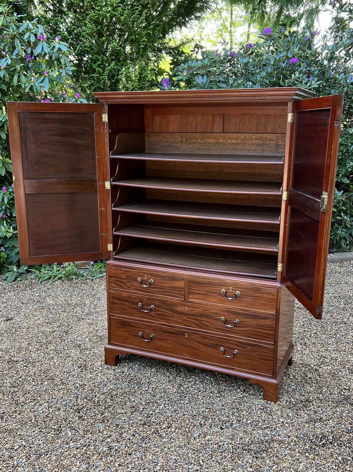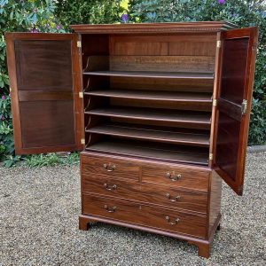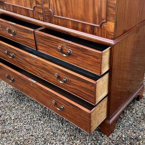 19th Century Georgian Mahogany Linen Press. The inside is fitted with five original sliding tray. Below has two short and two long solid oak lined drawers with original brass swan neck handles on bracket feet. Comes apart in three separate sections.