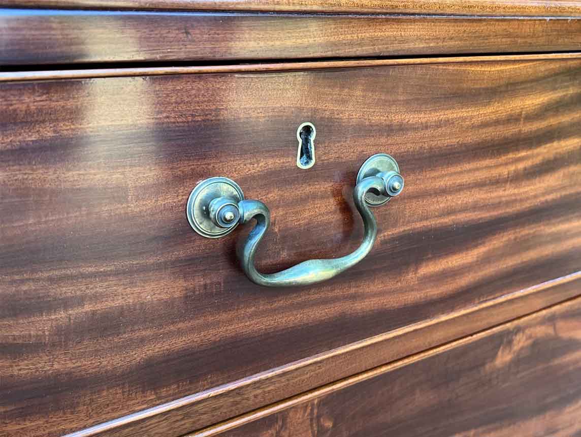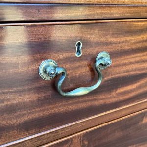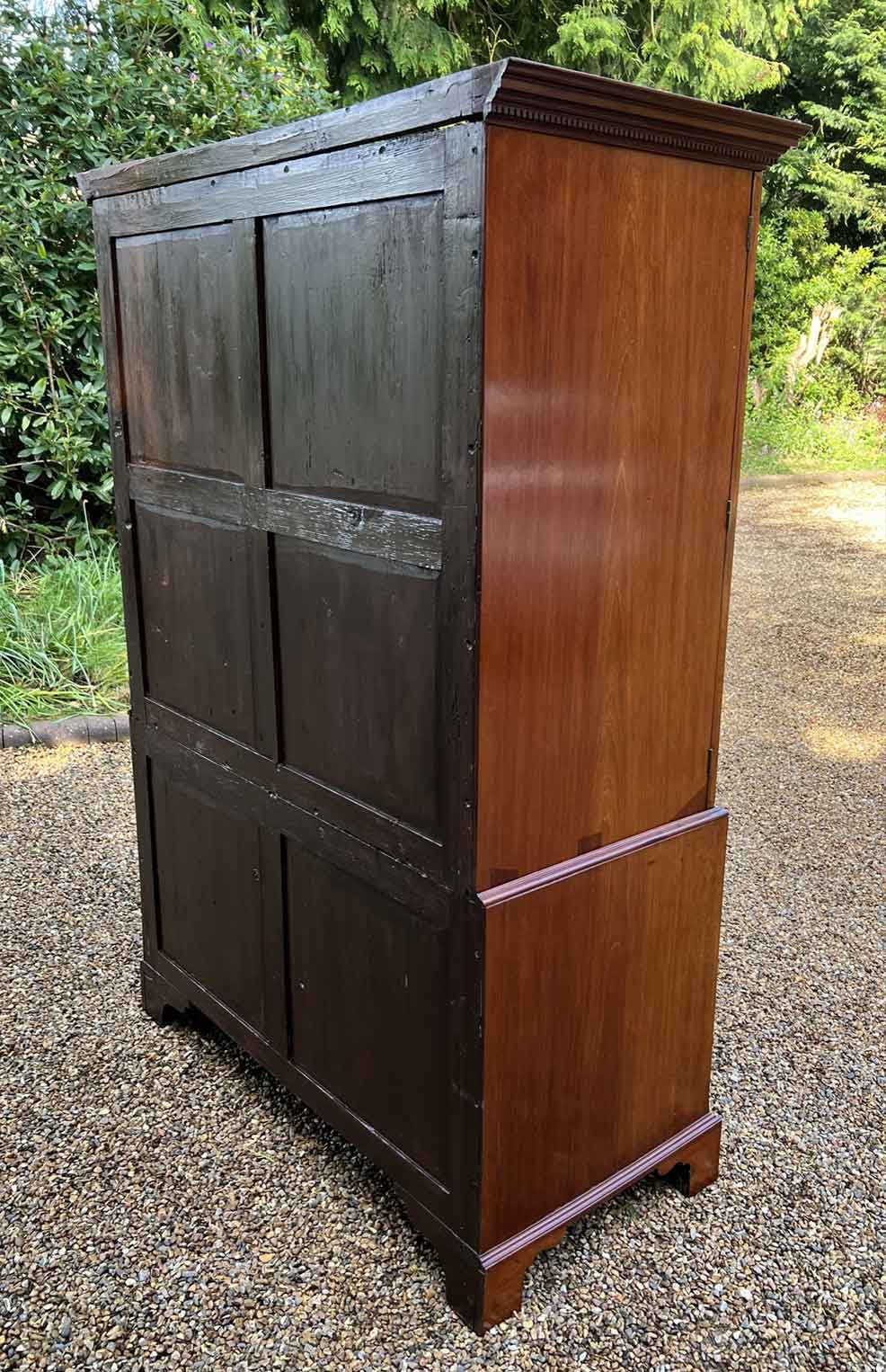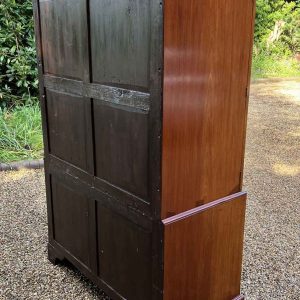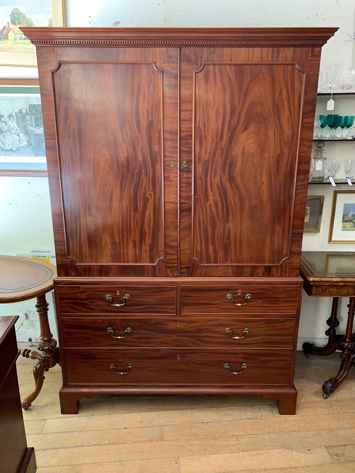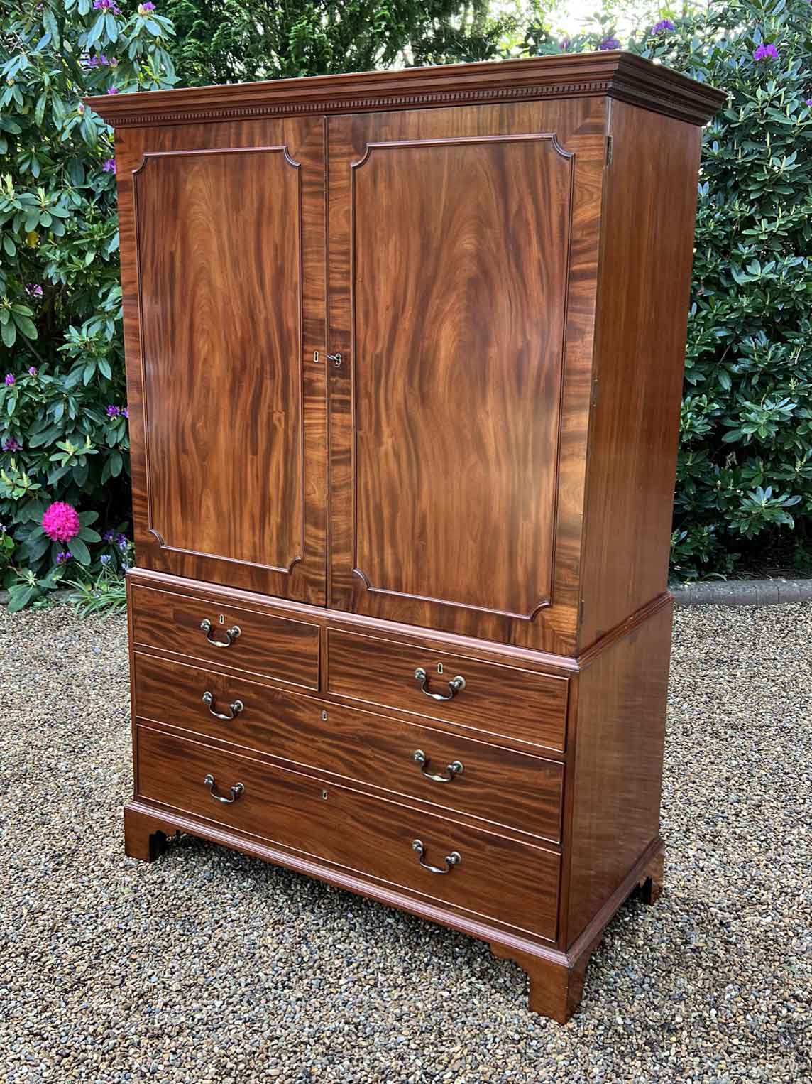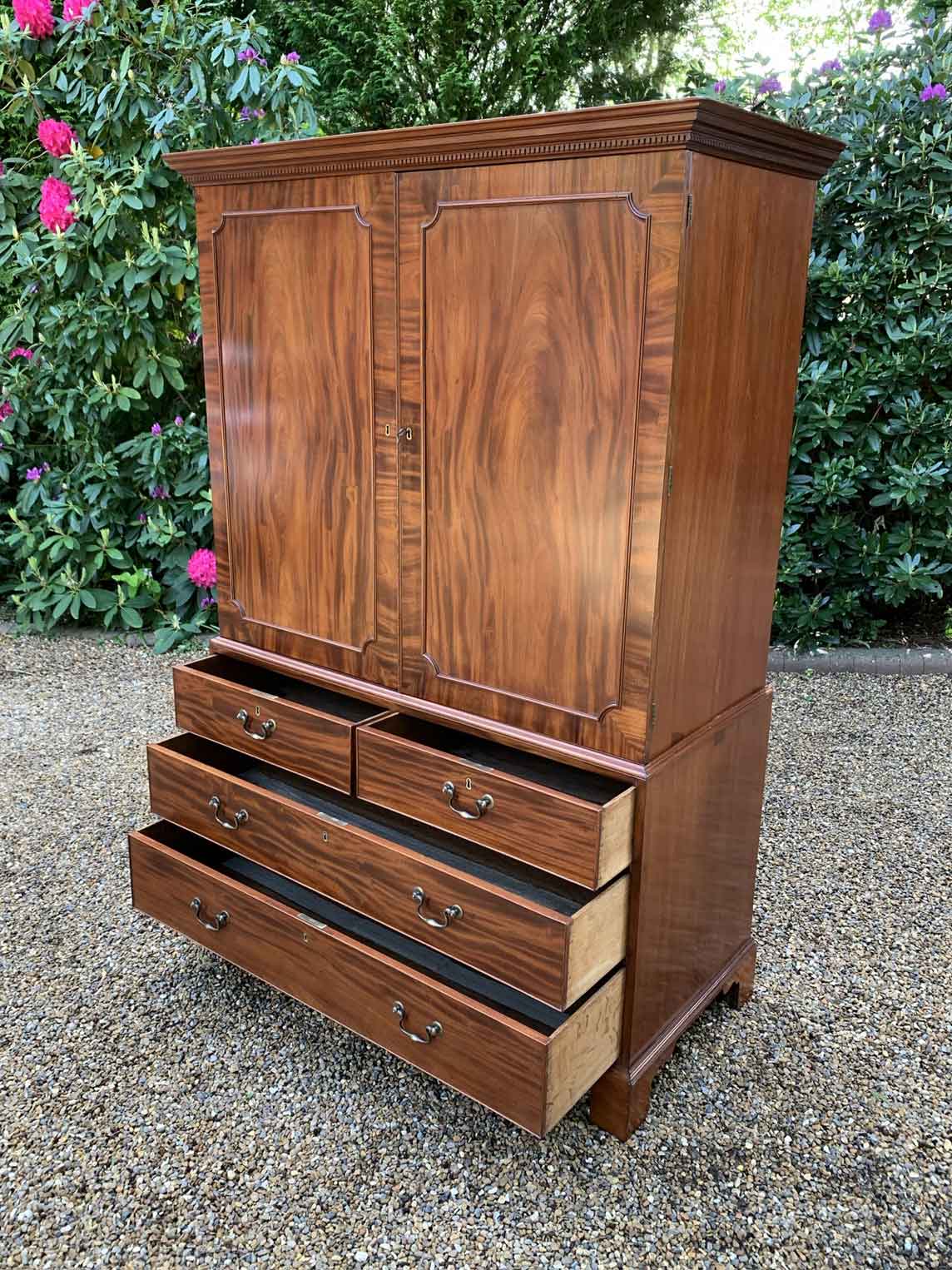 19th Century Georgian Mahogany Linen Press. The inside is fitted with five original sliding tray. Below has two short and two long solid oak lined drawers with original brass swan neck handles on bracket feet. Comes apart in three separate sections.