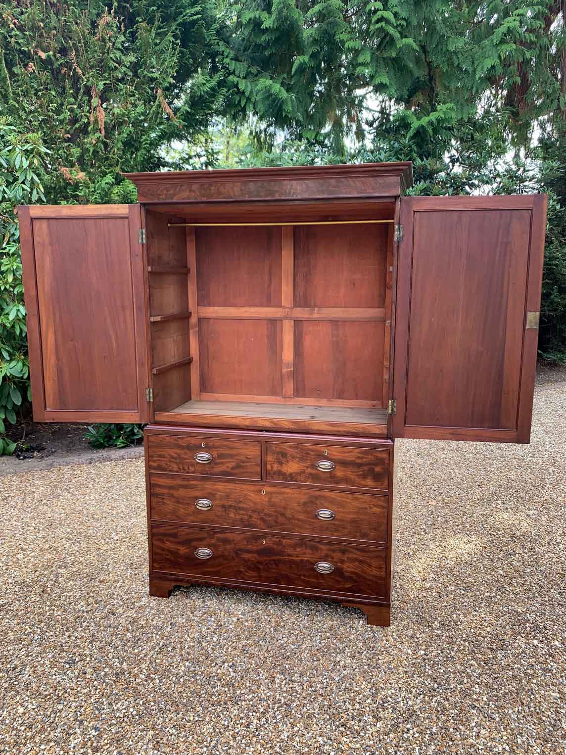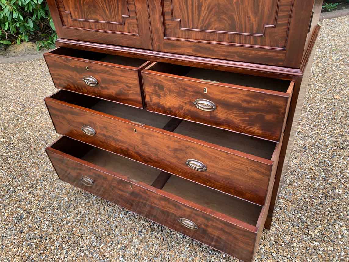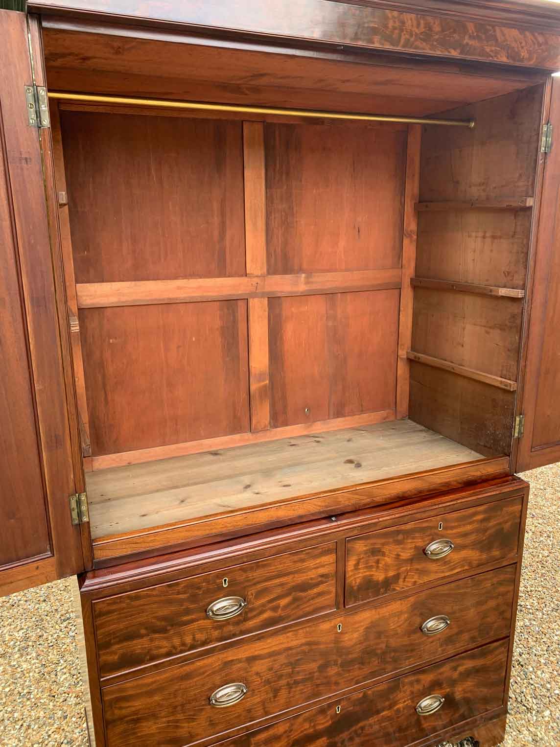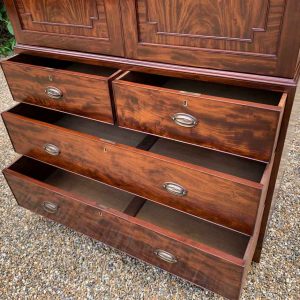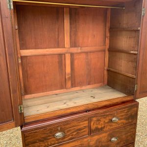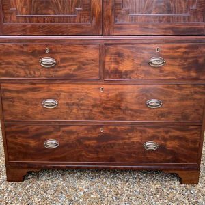 19th Century Georgian Mahogany Linen Press. The inside is fitted with a brass pole for hanging space . Below has two short and two long solid oak lined mahogany drawers with oval brass handles on bracket feet. Comes apart in three separate sections.