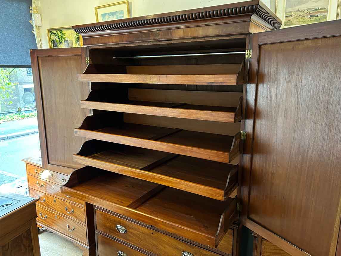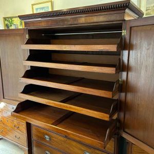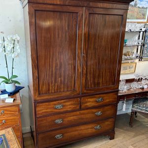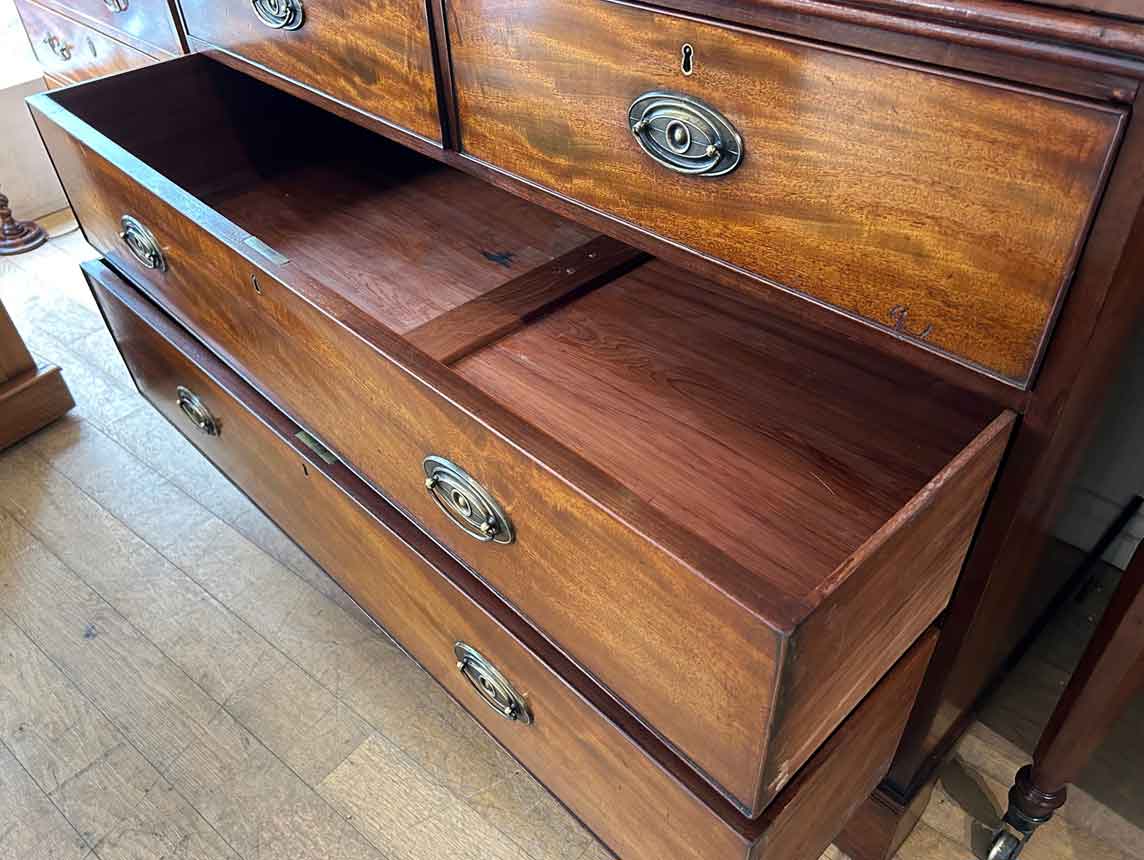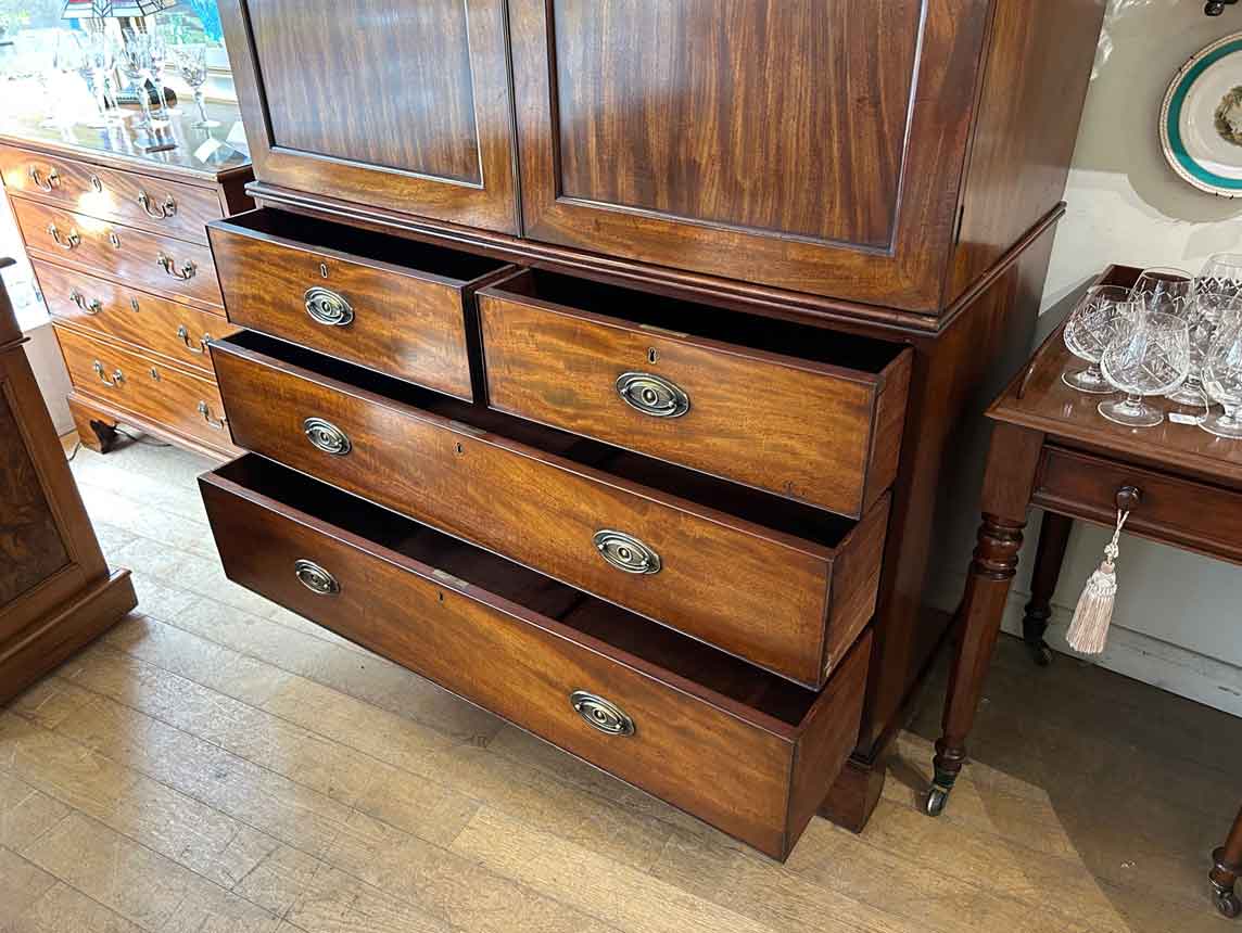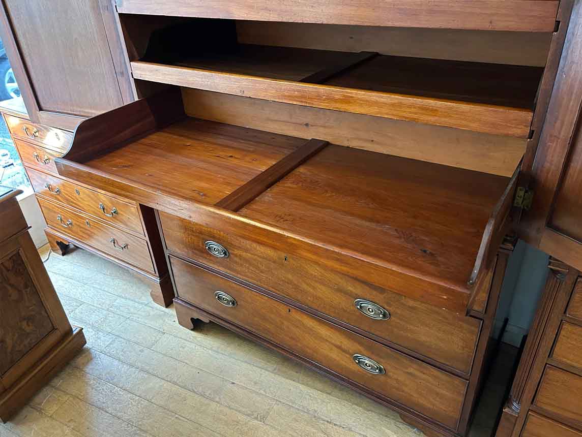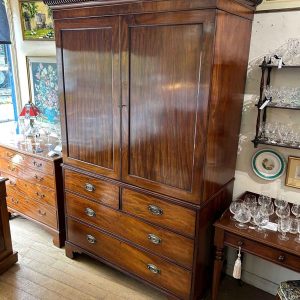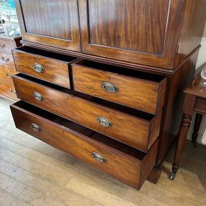 19th Century Georgian Mahogany Linen Press. The inside is fitted with 5 lined cedar wood trays and a brass pole for hanging space. Below has two short and two long solid cedar wood lined drawers with oval brass handles on bracket feet. Comes apart in three separate sections.