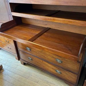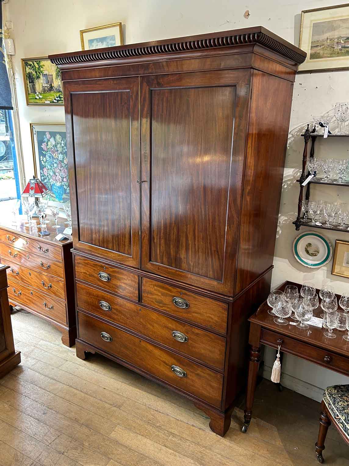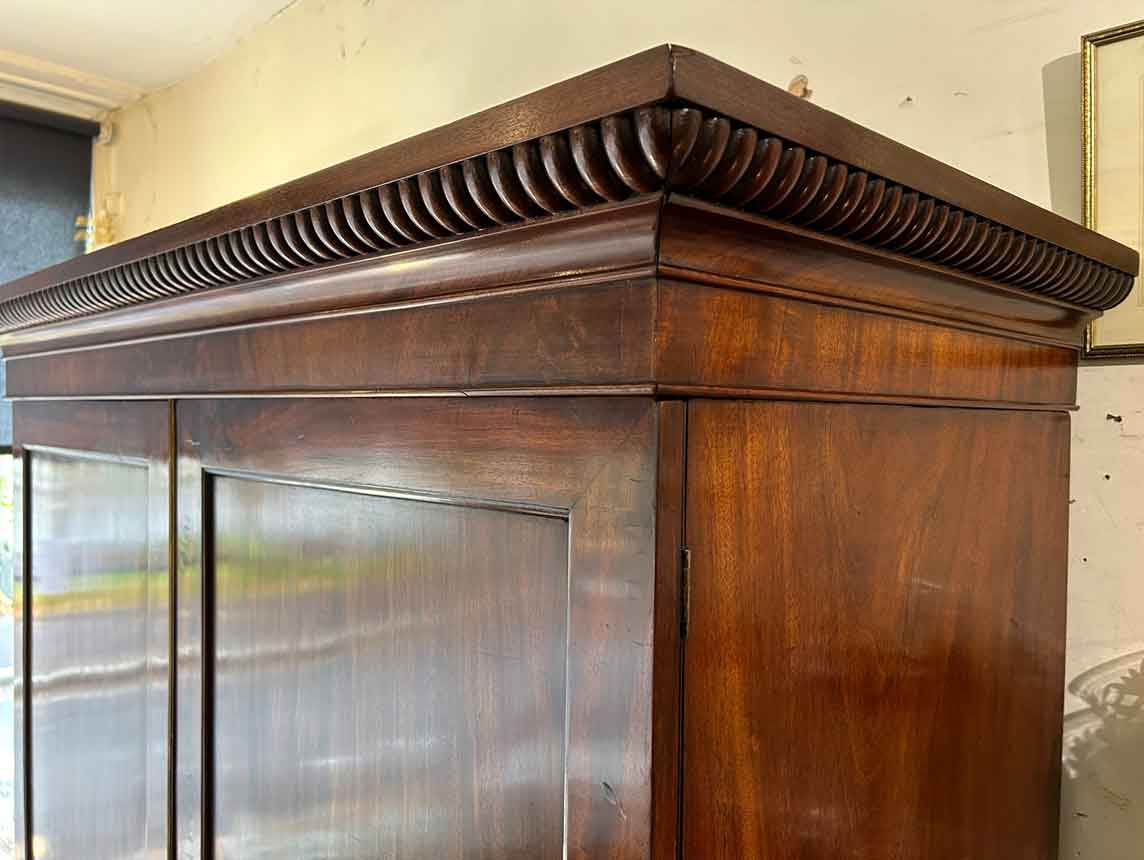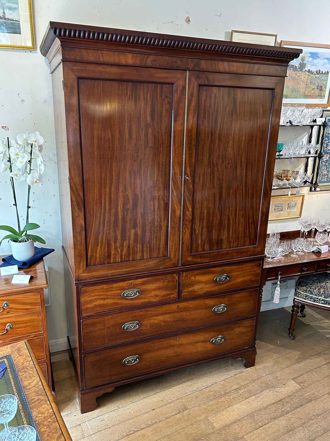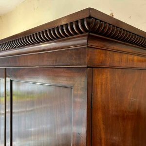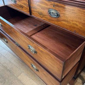 19th Century Georgian Mahogany Linen Press. The inside is fitted with 5 lined cedar wood trays and a brass pole for hanging space. Below has two short and two long solid cedar wood lined drawers with oval brass handles on bracket feet. Comes apart in three separate sections.
