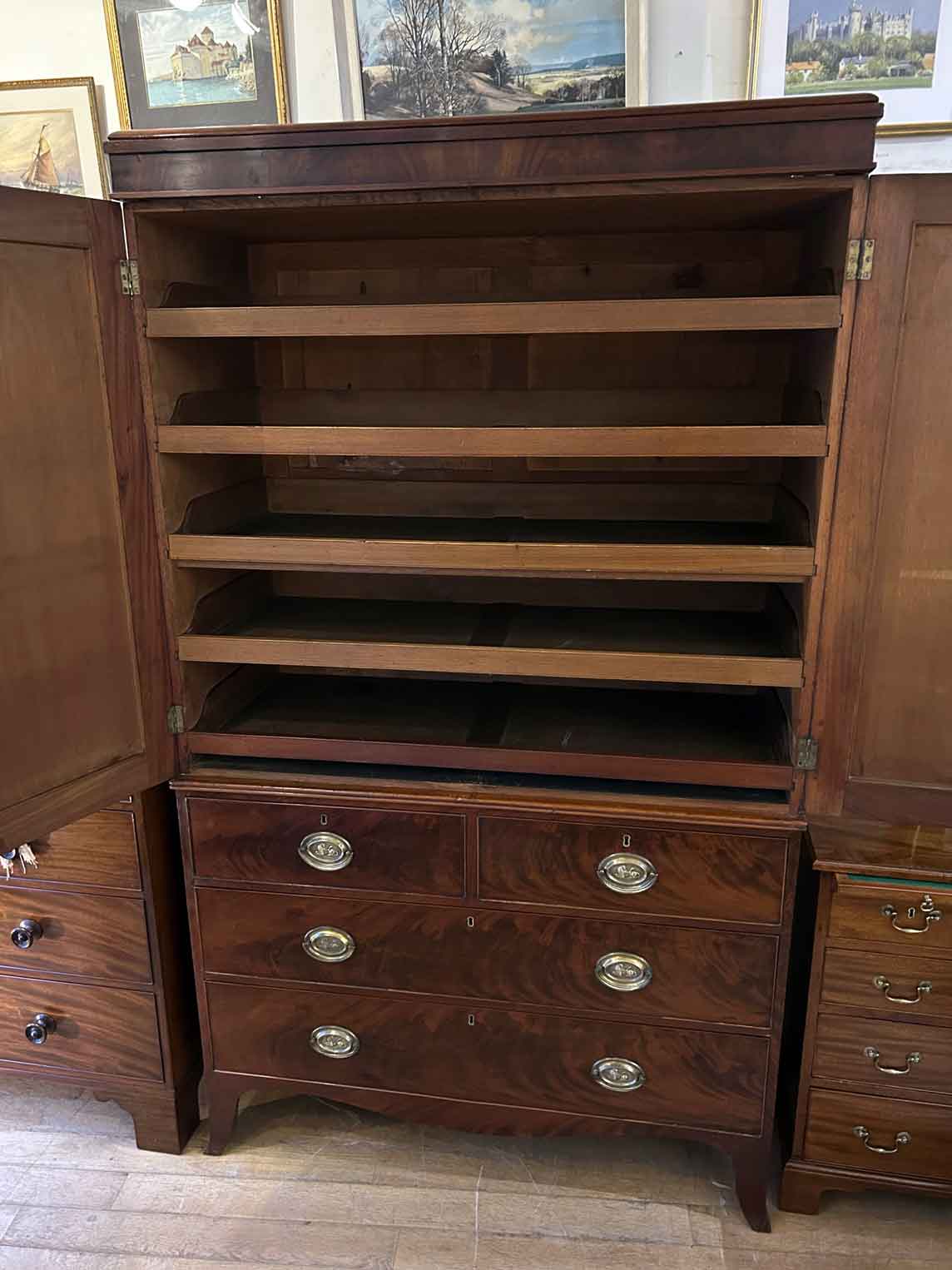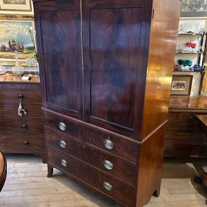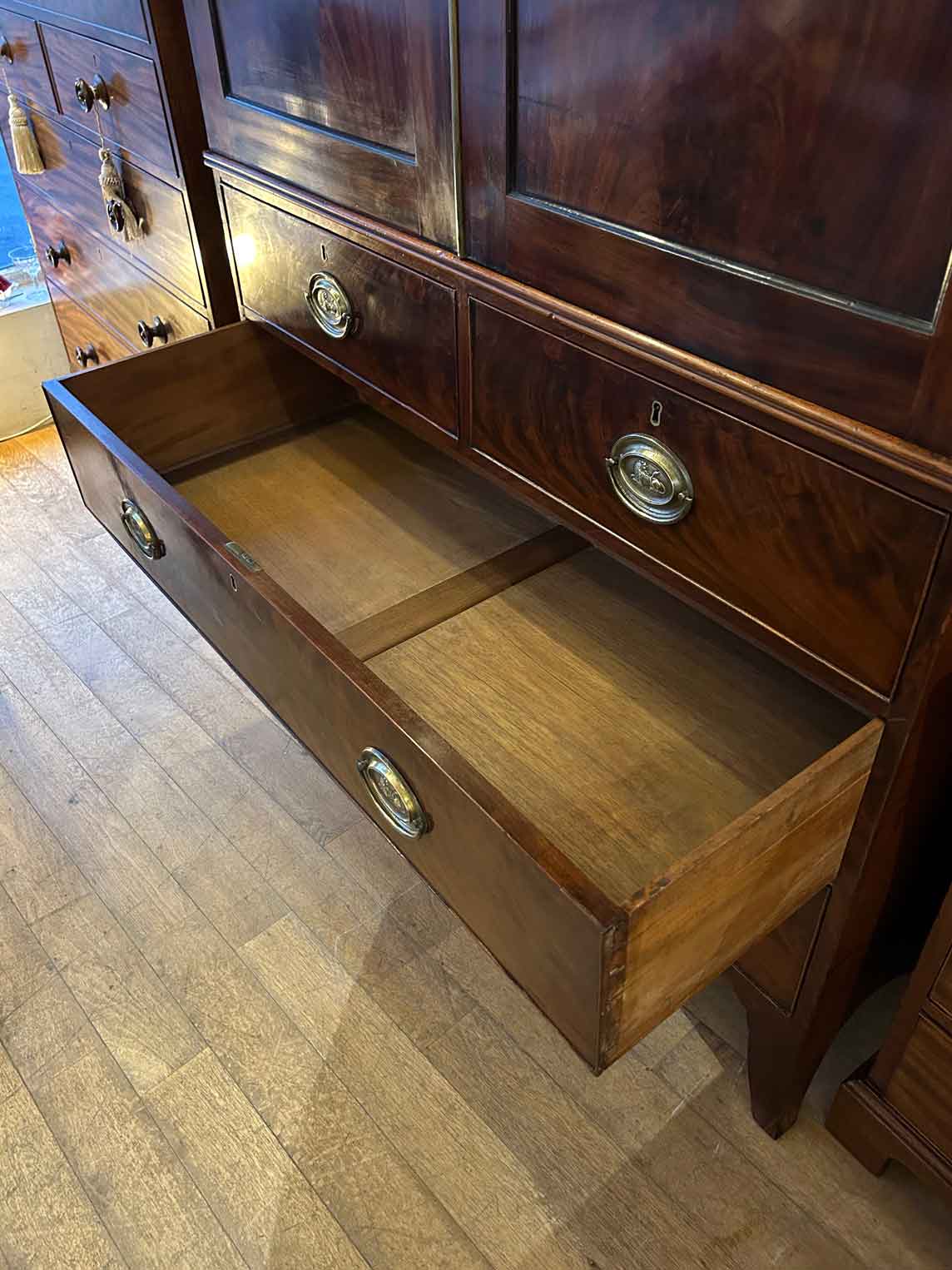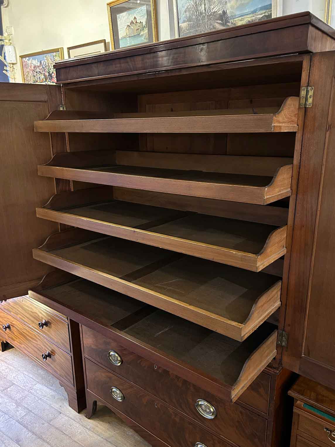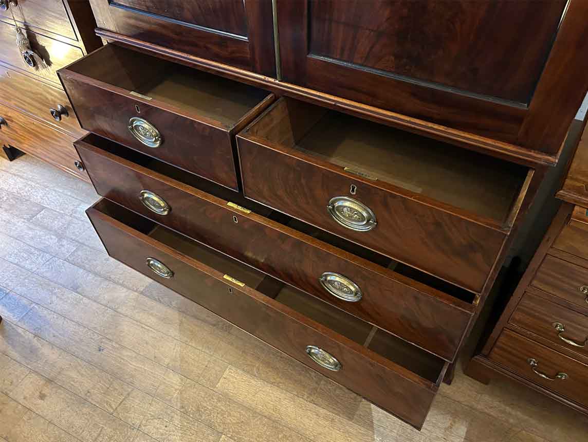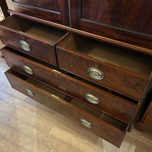 19th Century George III Mahogany Linen Press with two panelled doors, five original interior sliding trays. Two short and two long drawers with original brass plate handles on bracket feet feet. Comes apart in three separate sections,