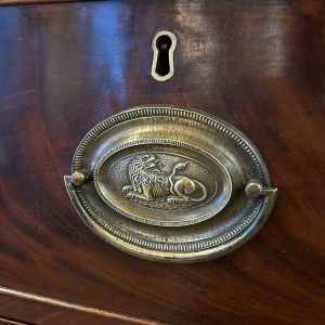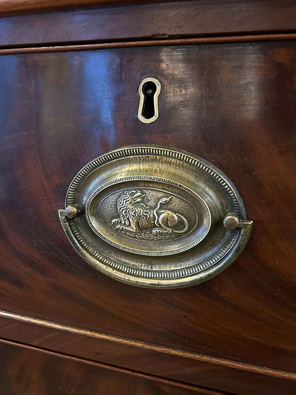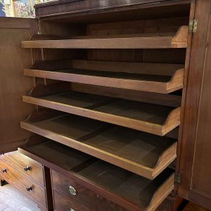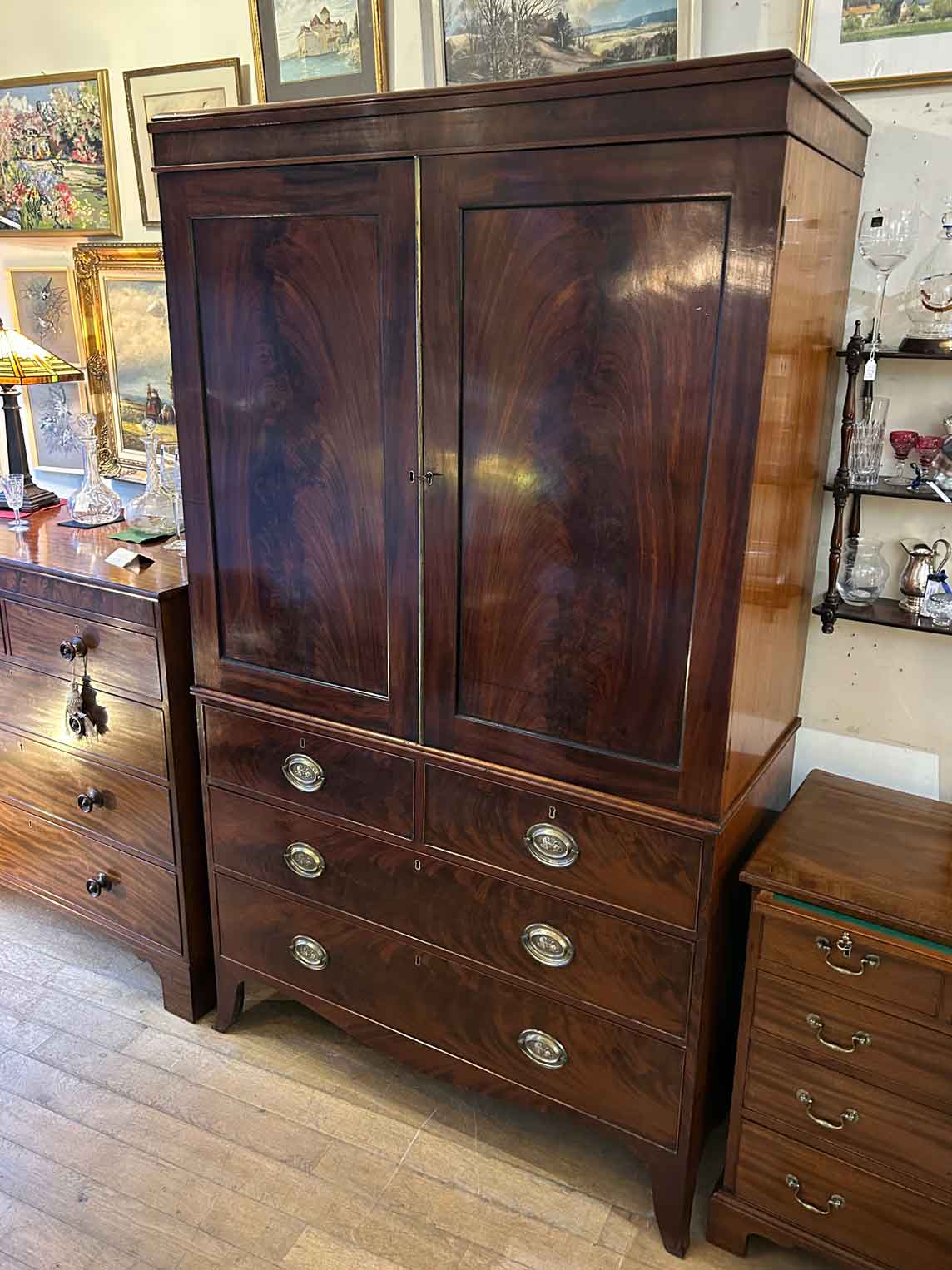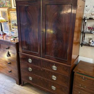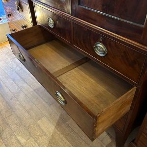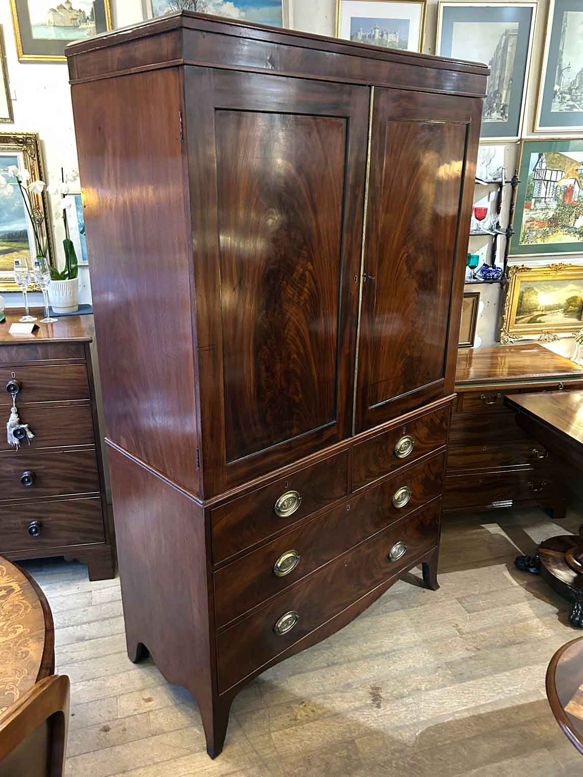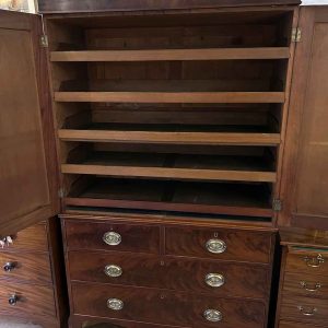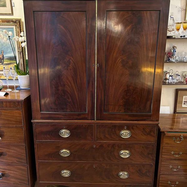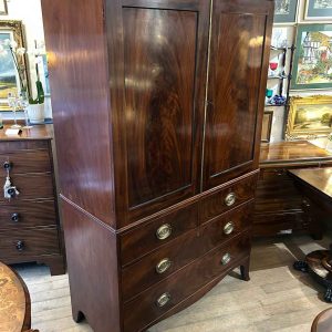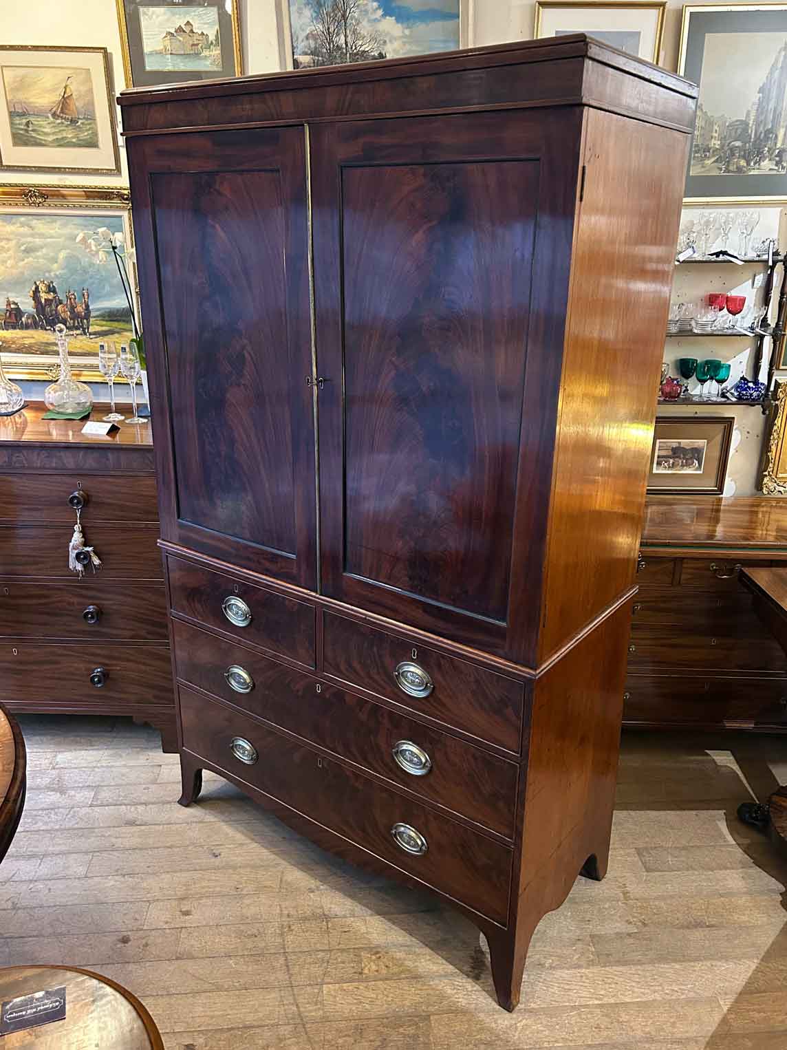 19th Century George III Mahogany Linen Press with two panelled doors, five original interior sliding trays. Two short and two long drawers with original brass plate handles on bracket feet feet. Comes apart in three separate sections,