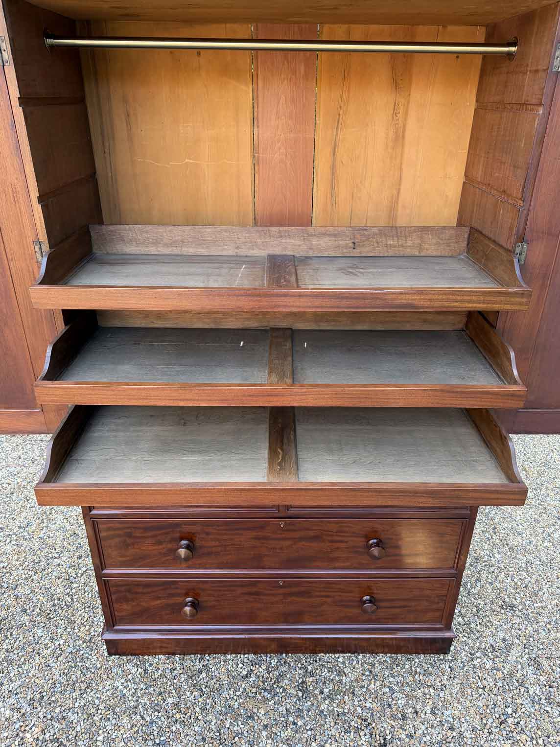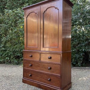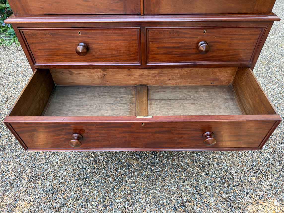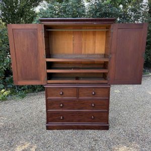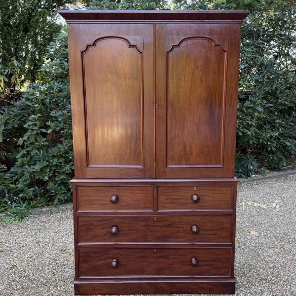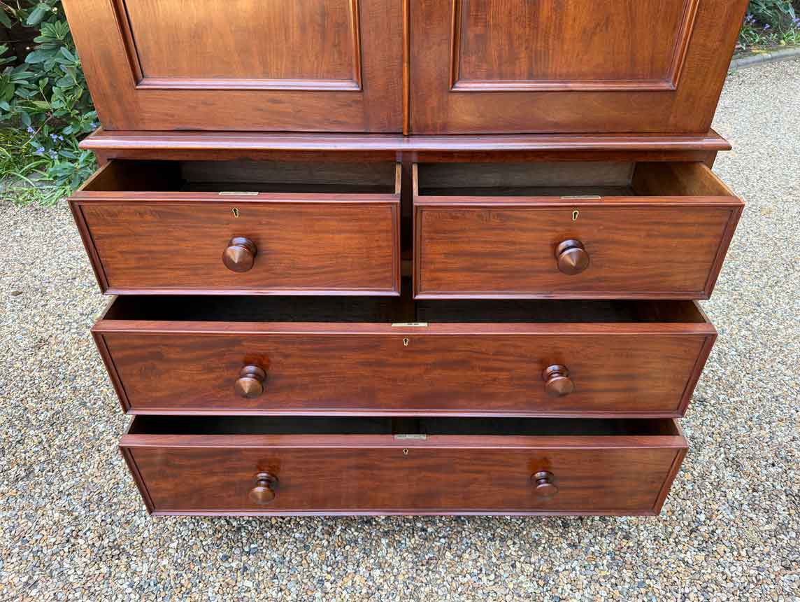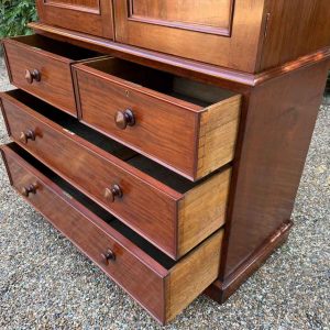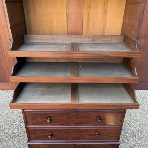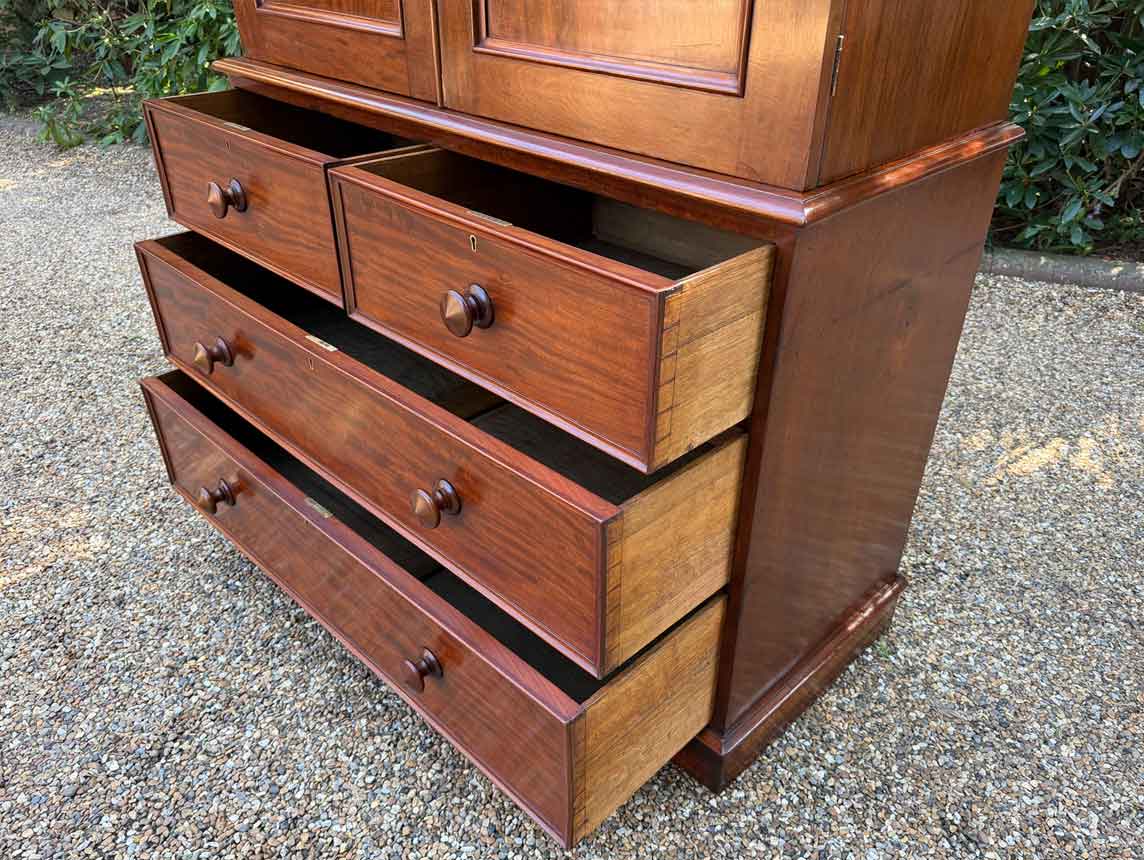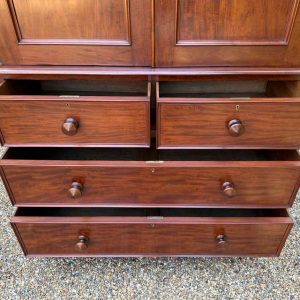 A very high quality 19th Century Victorian Mahogany Linen Press. The inside has three slding trays and hanging space. Below has two short and three long drawers fitted with turned bun handles on plinth base. Comes apart in three separate sections.