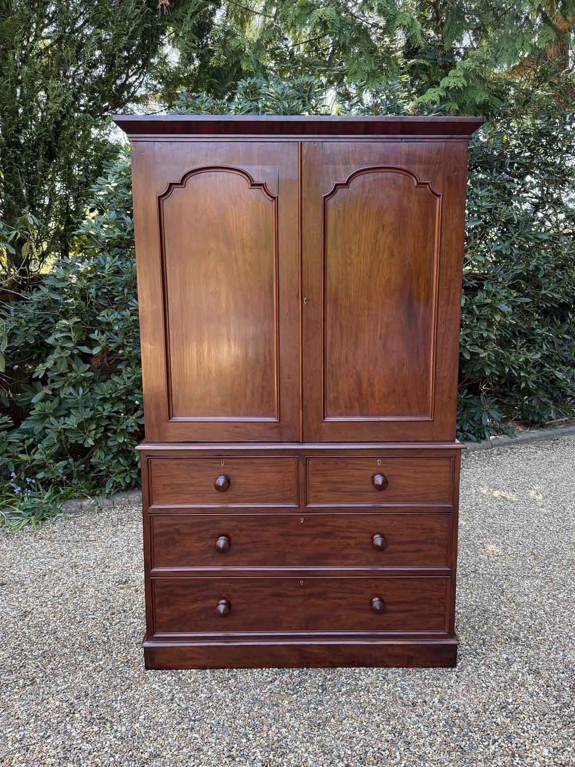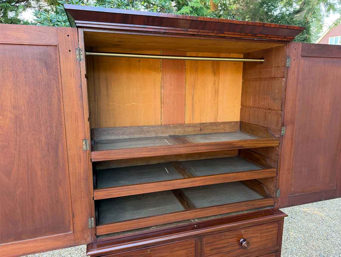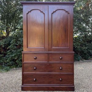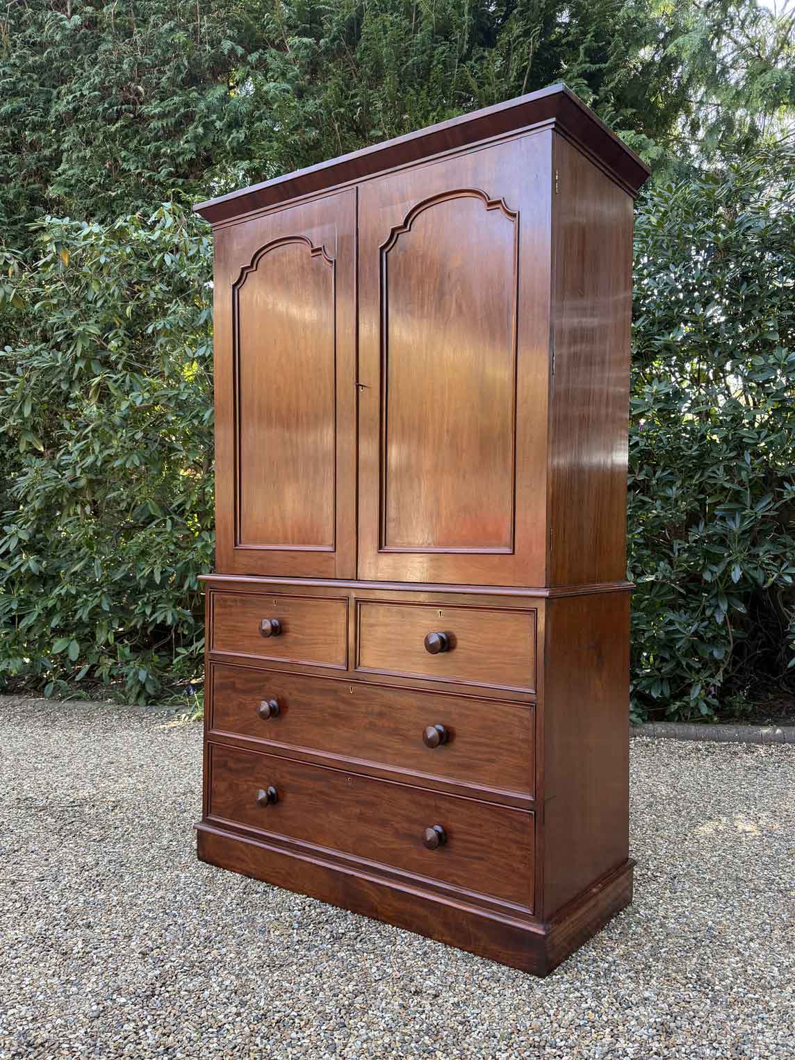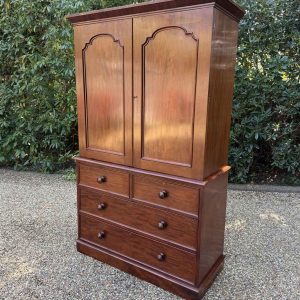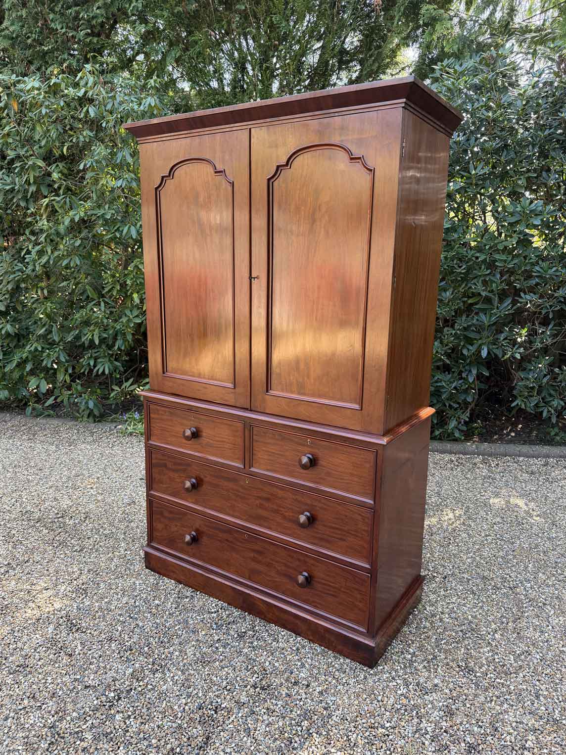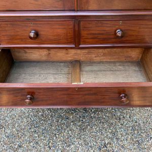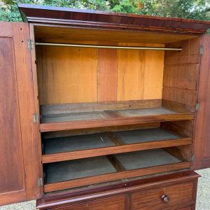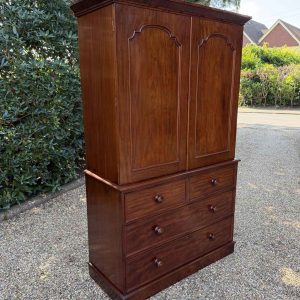 A very high quality 19th Century Victorian Mahogany Linen Press. The inside has three slding trays and hanging space. Below has two short and three long drawers fitted with turned bun handles on plinth base. Comes apart in three separate sections.