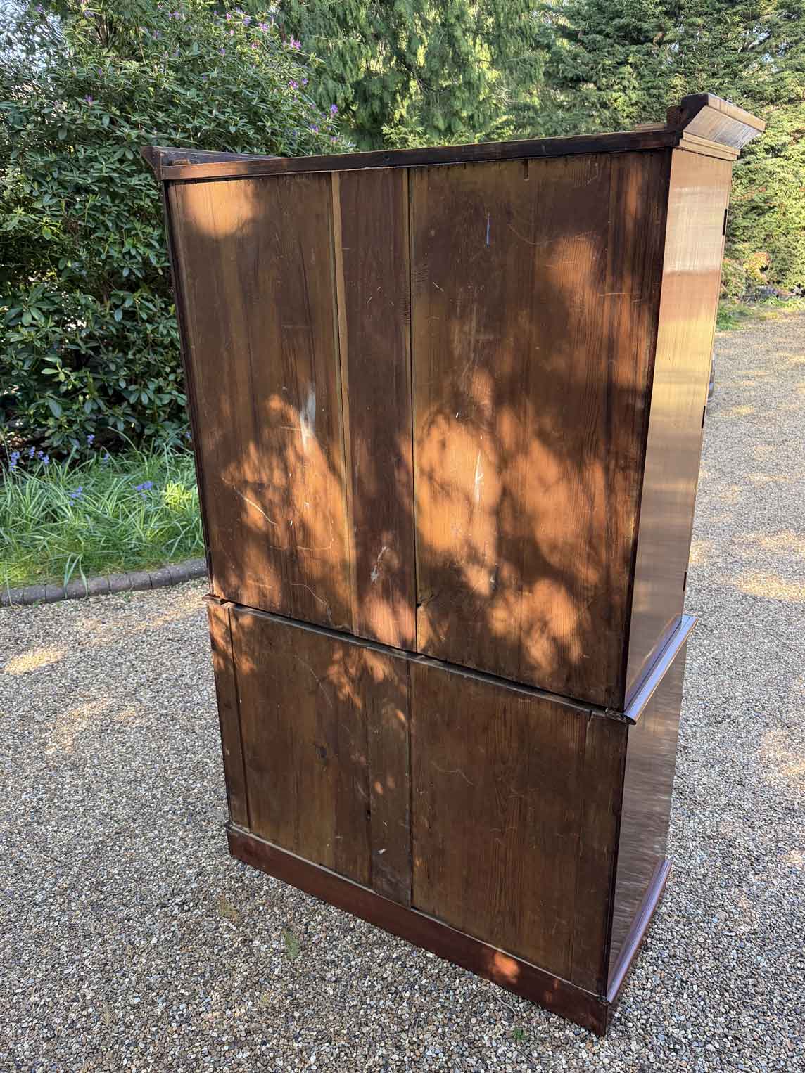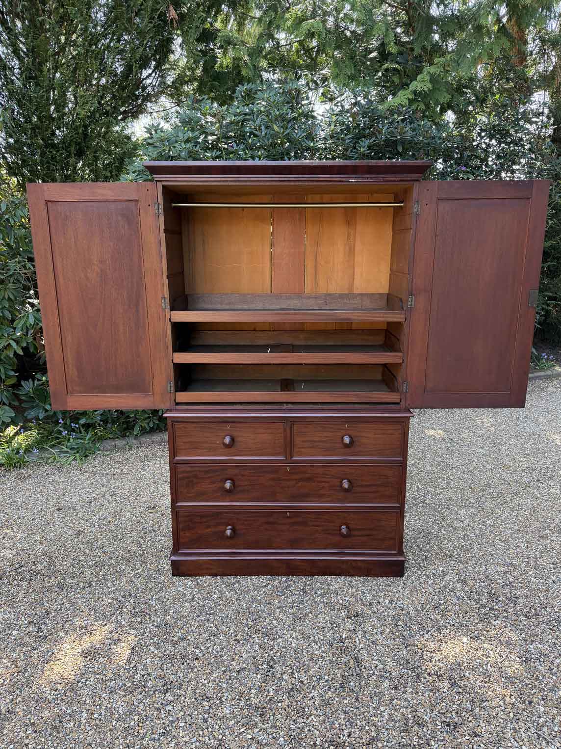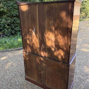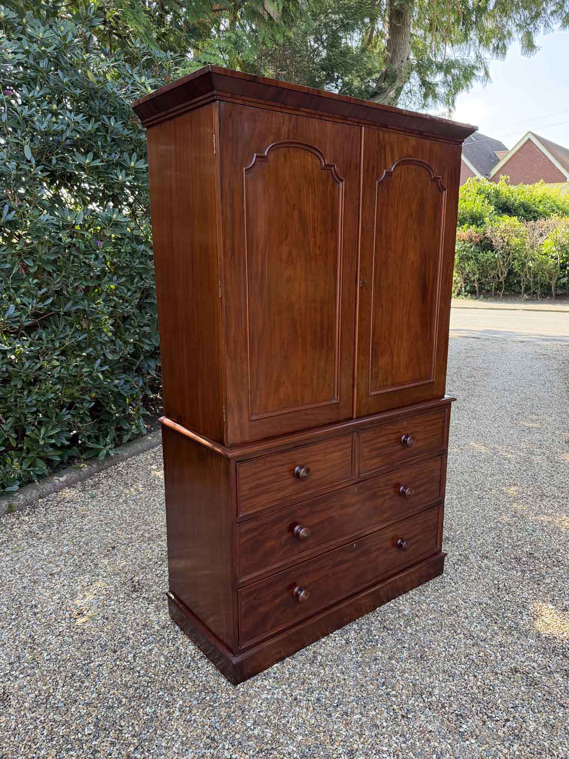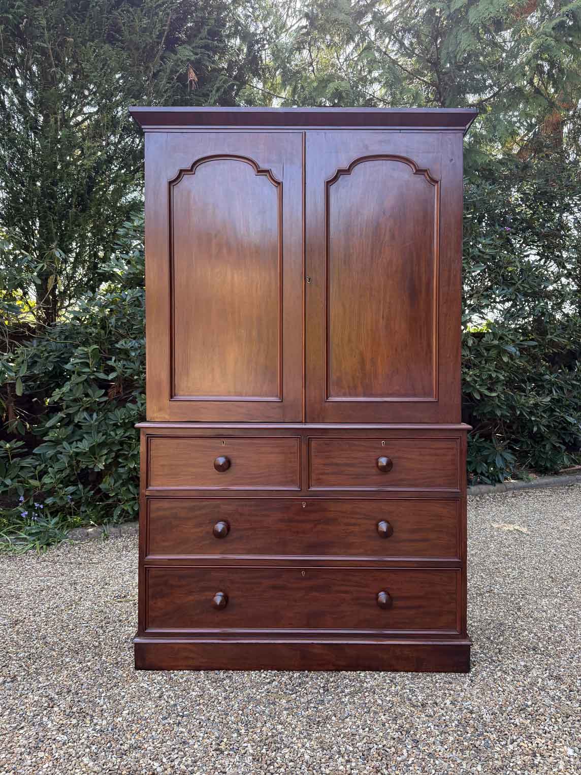 A very high quality 19th Century Victorian Mahogany Linen Press. The inside has three slding trays and hanging space. Below has two short and three long drawers fitted with turned bun handles on plinth base. Comes apart in three separate sections.