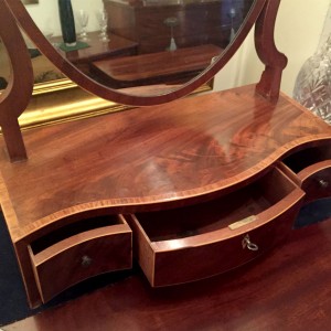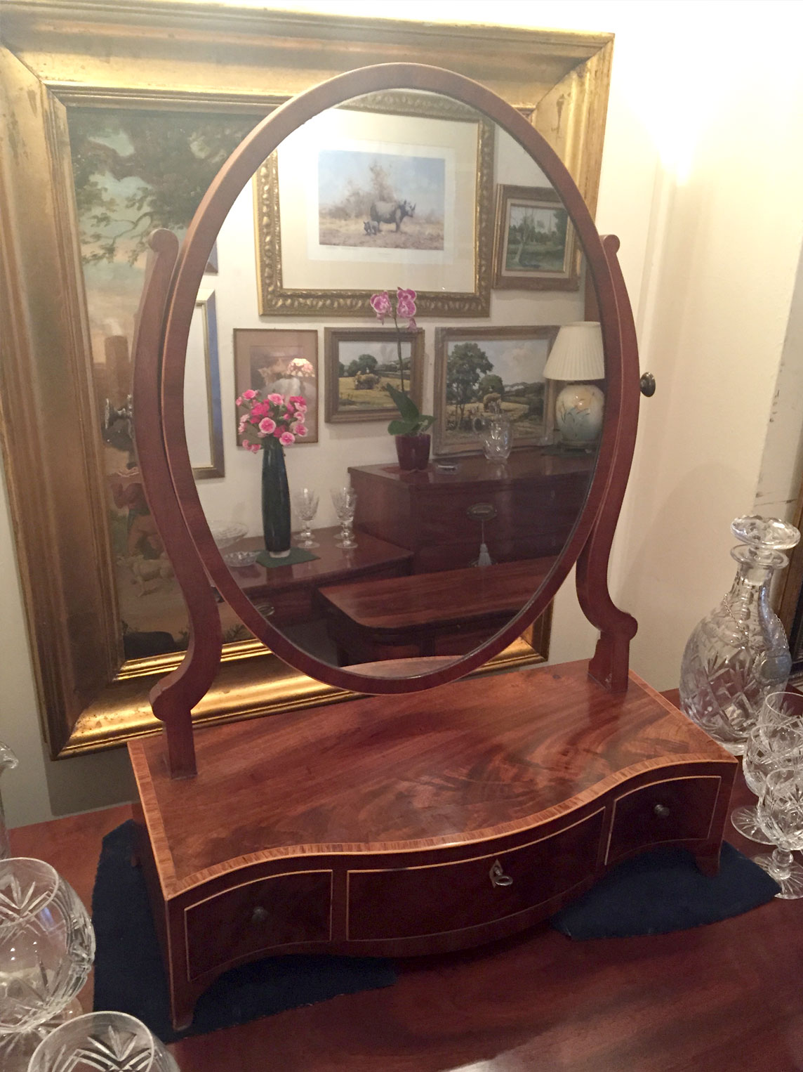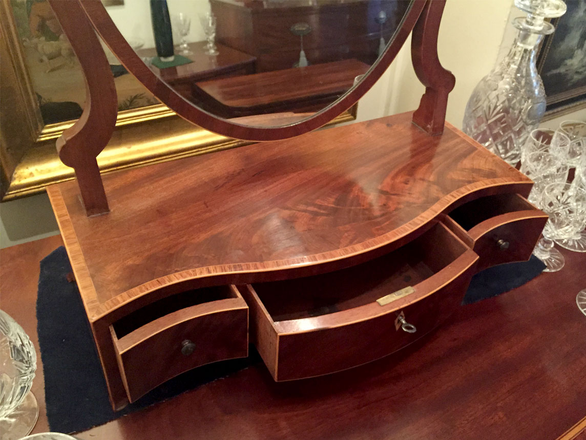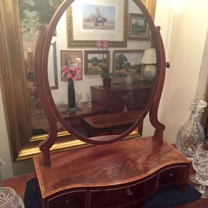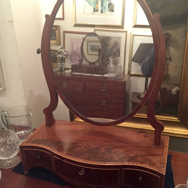 George III Mahogany Inlaid Dressing Mirror with swing frame oval mirror on a serpentine base with 3 fitted drawers