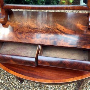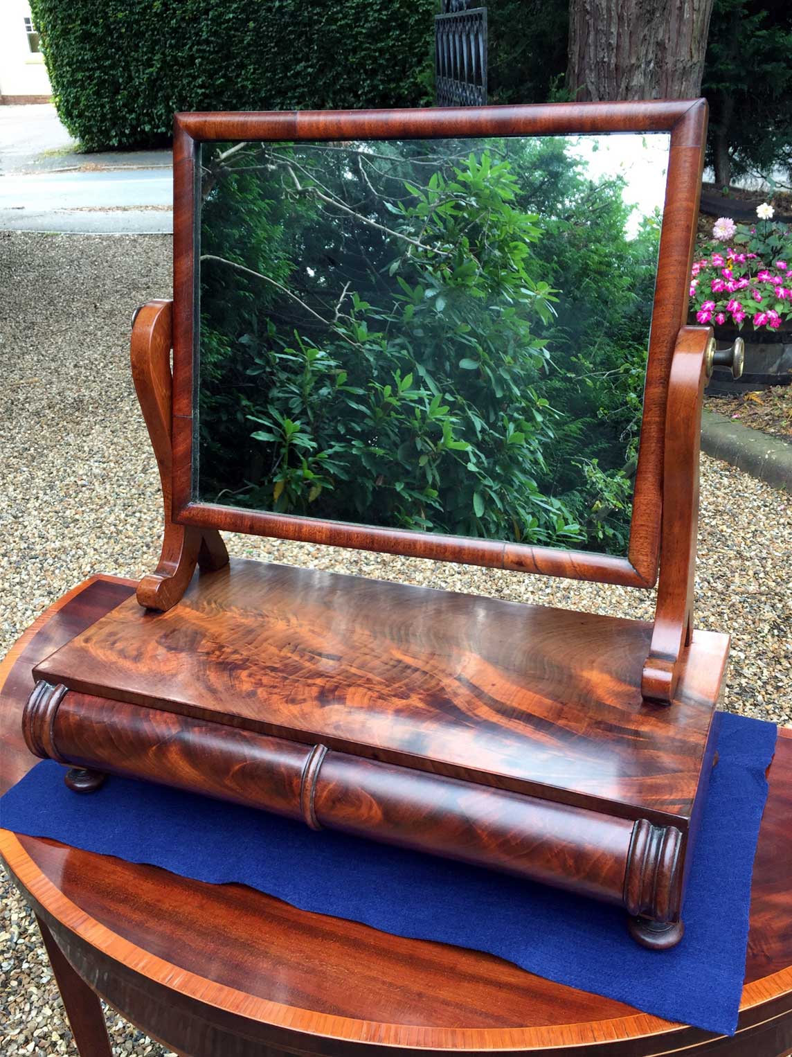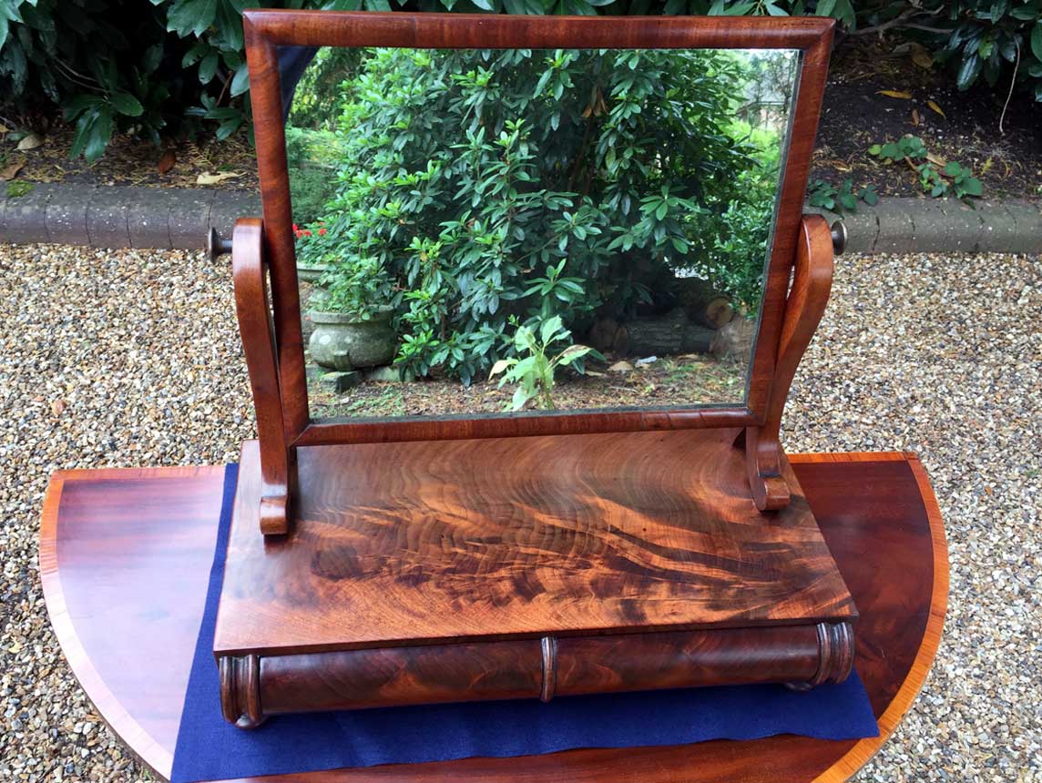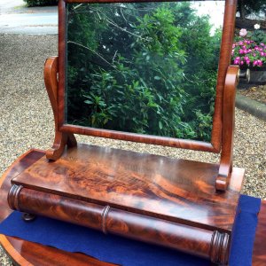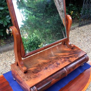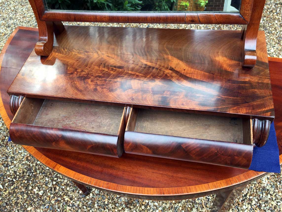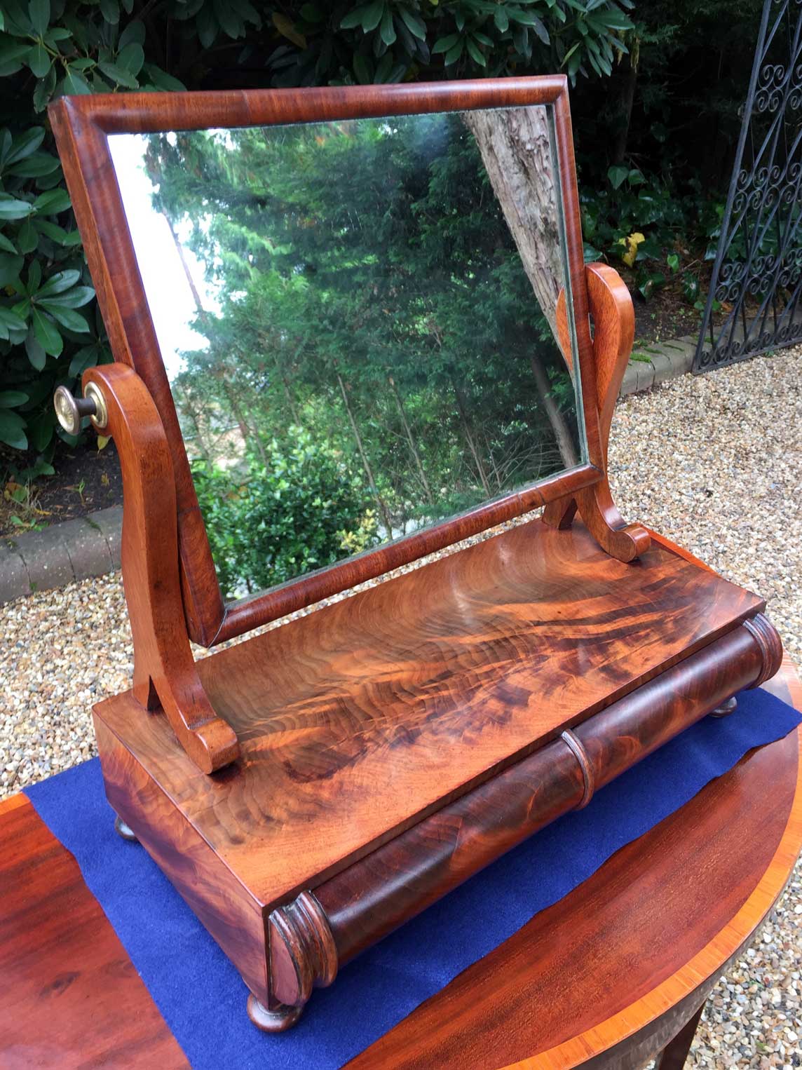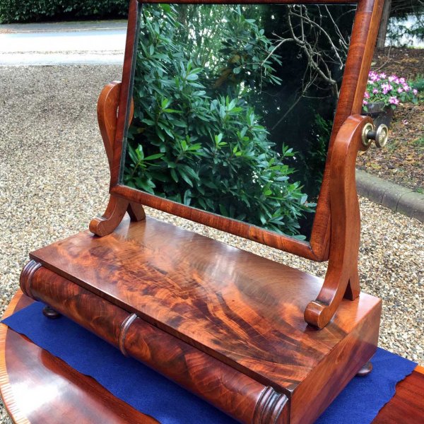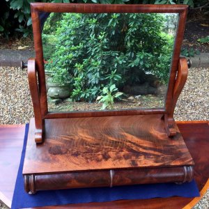 A Victorian figured Mahogany swing frame Dressing Mirror. The base is fitted with two convex drawers, on turned feet.