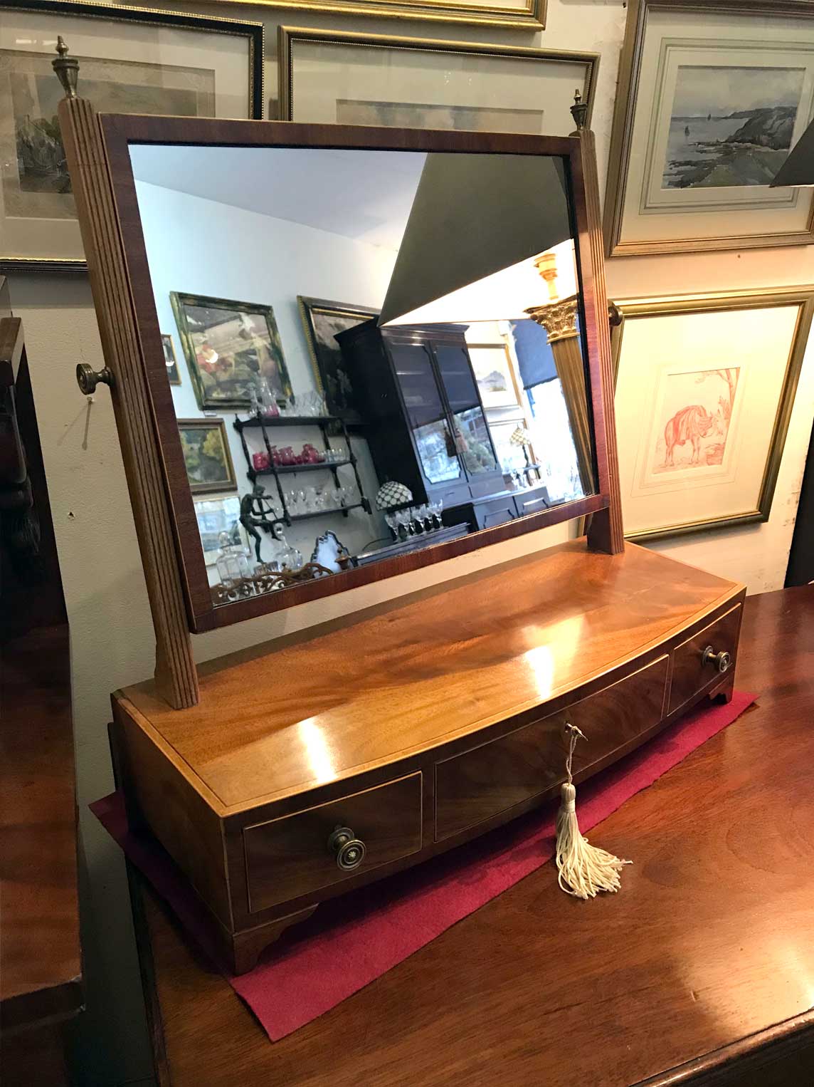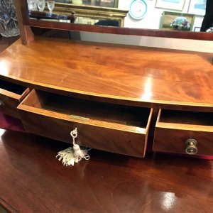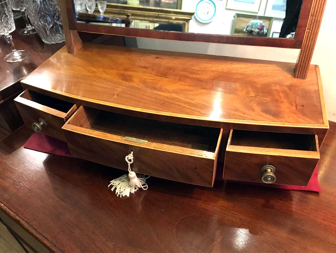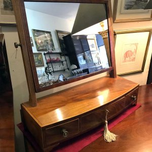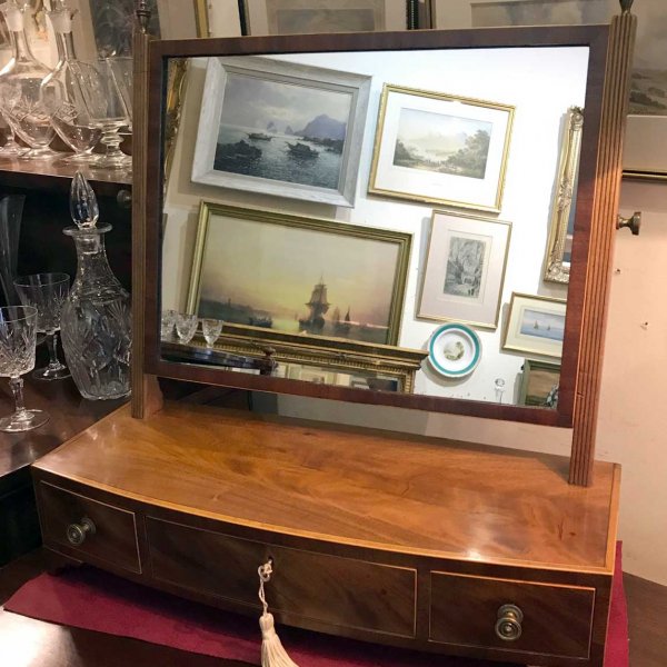 A 19th Century Bow-fronted Mahogany swing frame rectangular Dressing Mirror with three drawers, inlay and brass fittings, raised on bracket feet.